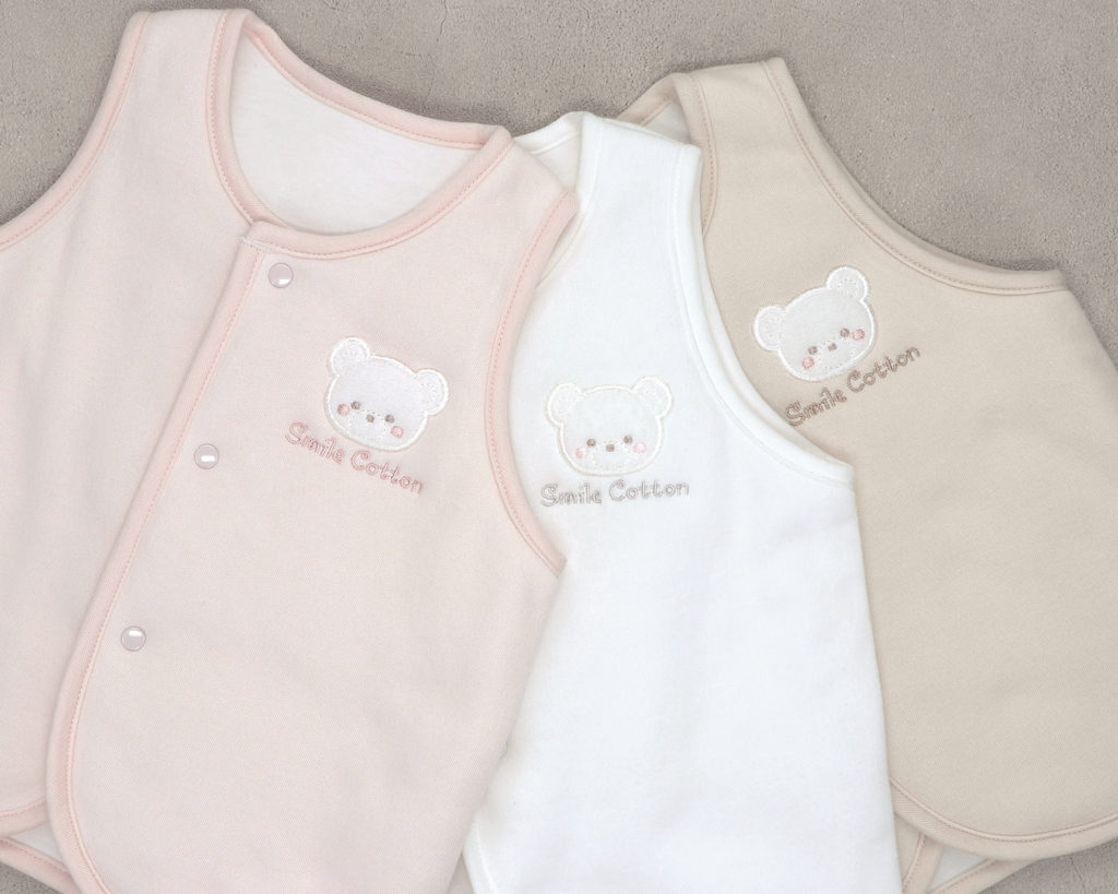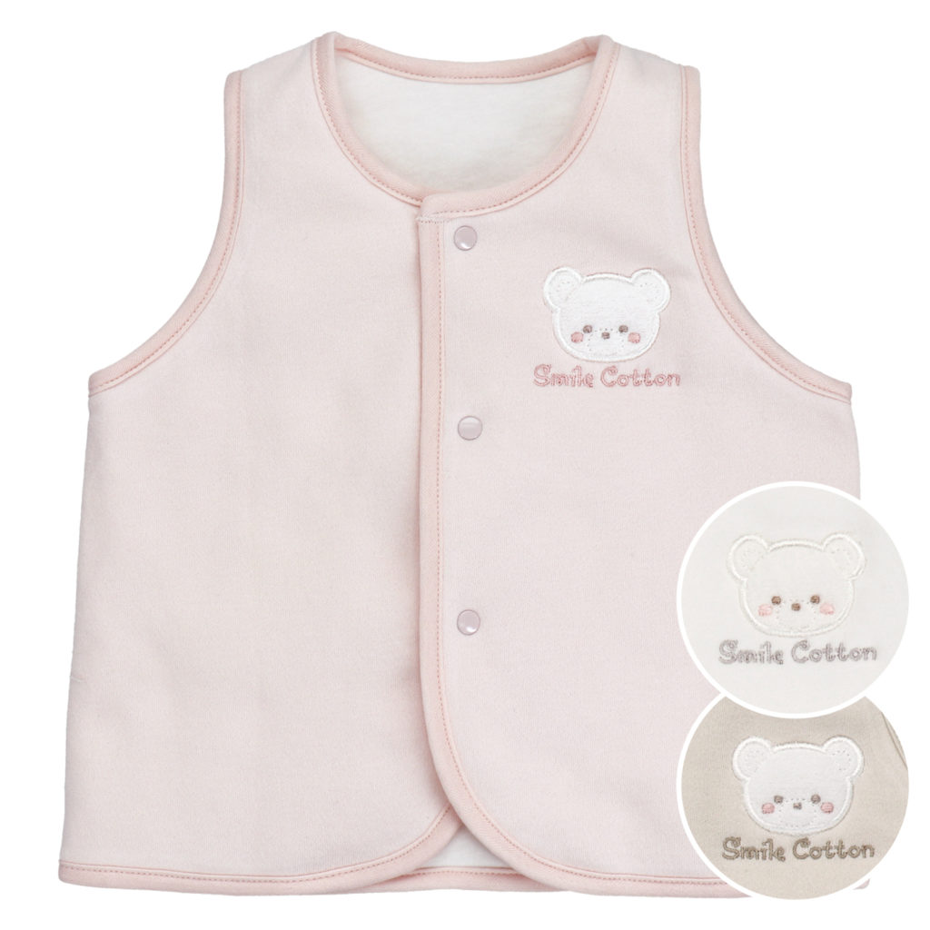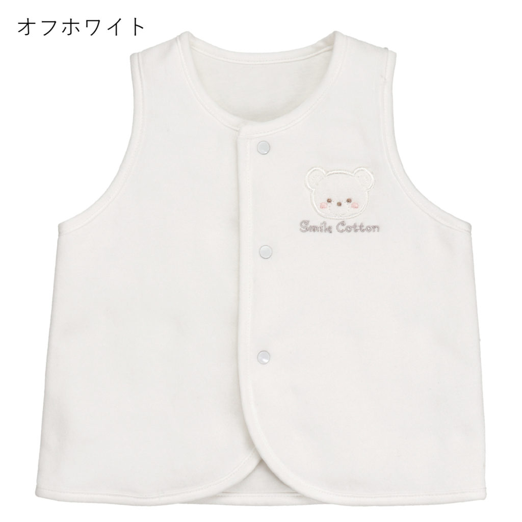 体温調節が苦手な赤ちゃんに1枚あると便利なベスト。季節の変わり目にも大活躍のアイテムです。中わた入りのふんわりあたたかいベストは人気のスマイルコットン素材。洗っても硬くならず、軽くてふわふわのやわらかさが特徴です。くまさんの刺繍がアクセントの可愛いベストは、お洋服にも合わせやすく、男女問わずお使い頂けます。