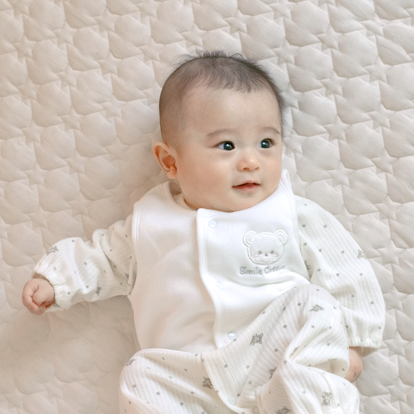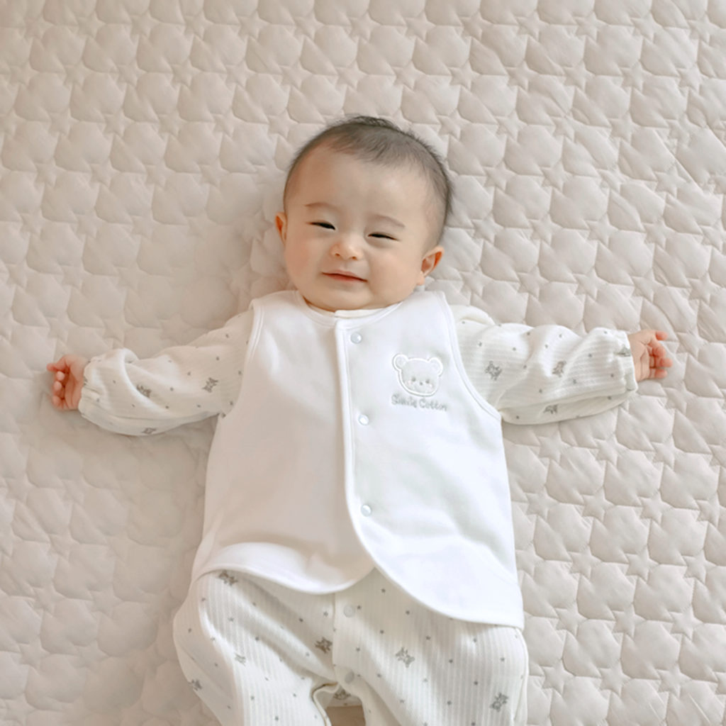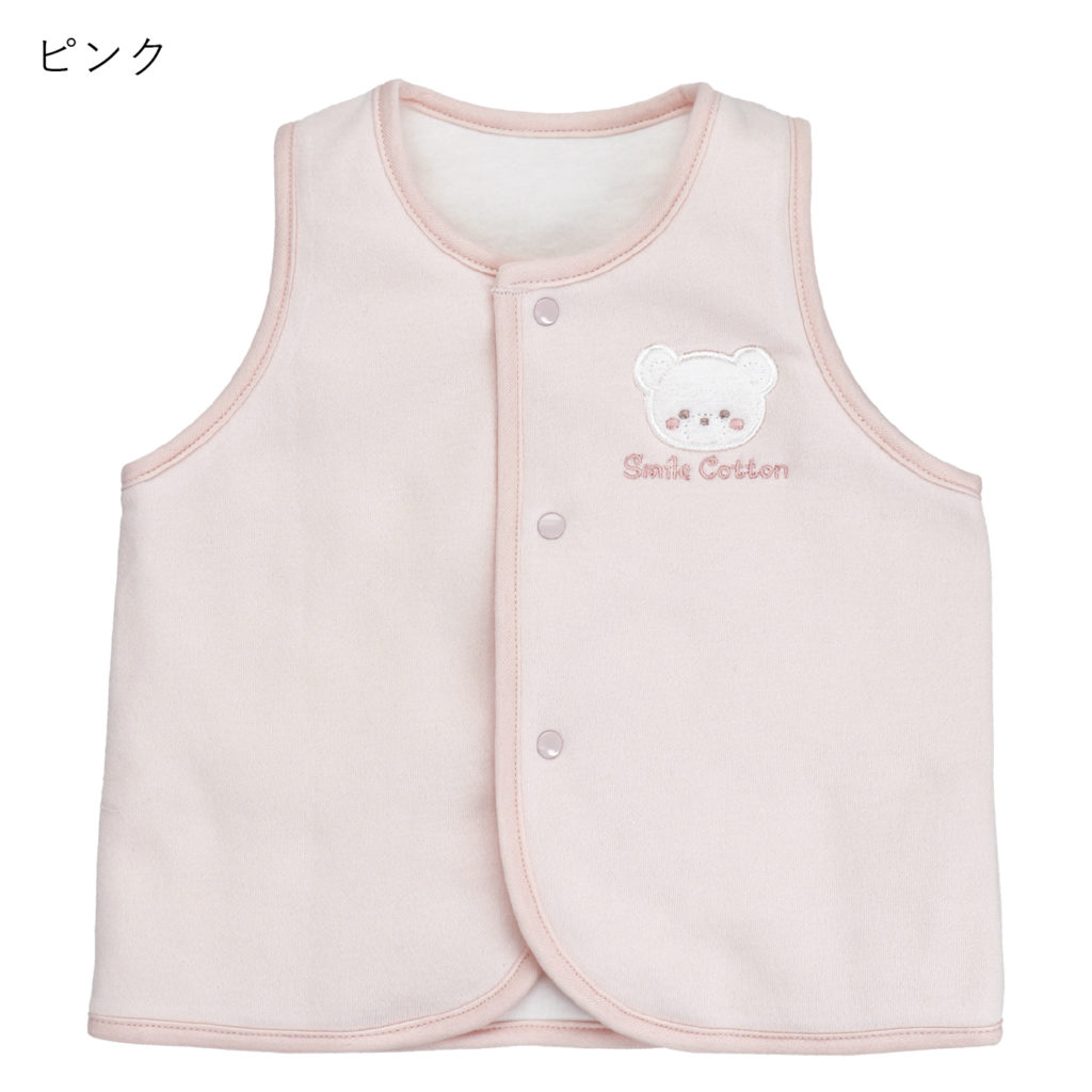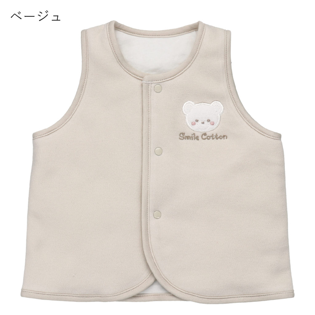 体温調節が苦手な赤ちゃんに1枚あると便利なベスト。季節の変わり目にも大活躍のアイテムです。中わた入りのふんわりあたたかいベストは人気のスマイルコットン素材。洗っても硬くならず、軽くてふわふわのやわらかさが特徴です。くまさんの刺繍がアクセントの可愛いベストは、お洋服にも合わせやすく、男女問わずお使い頂けます。