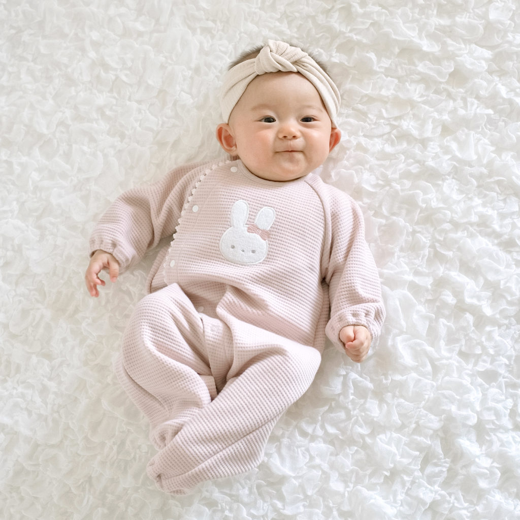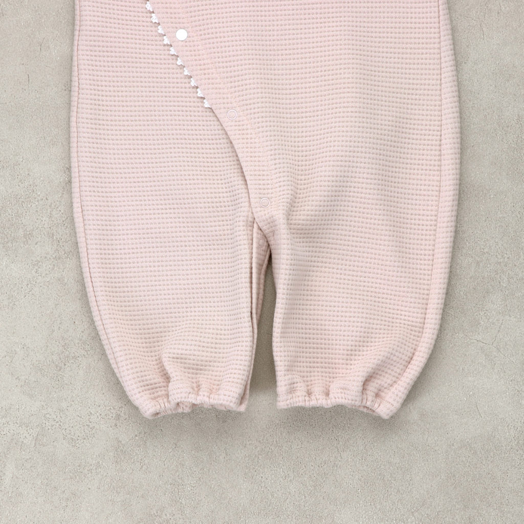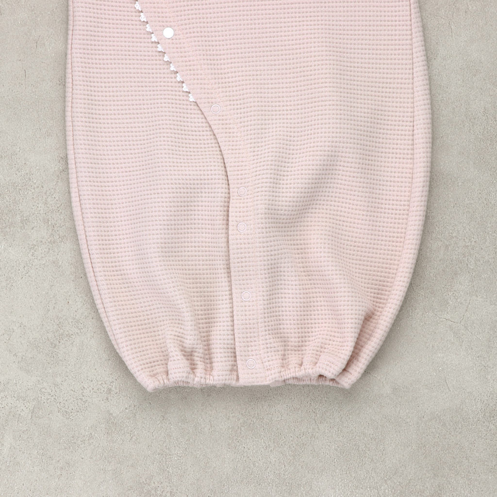 ポコポコした素材感がかわいいワッフルニット。やわらかなコットン素材は肌への刺激が少なく、 赤ちゃんのデリケートな肌にもやさしい素材。秋から春先まで活躍します。 生まれてすぐはすっぽり足を包むドレスタイプ。 足がばたばたできるようになったらボタンを留め替えてカバーオールタイプにもなるツーウェイ仕様です。