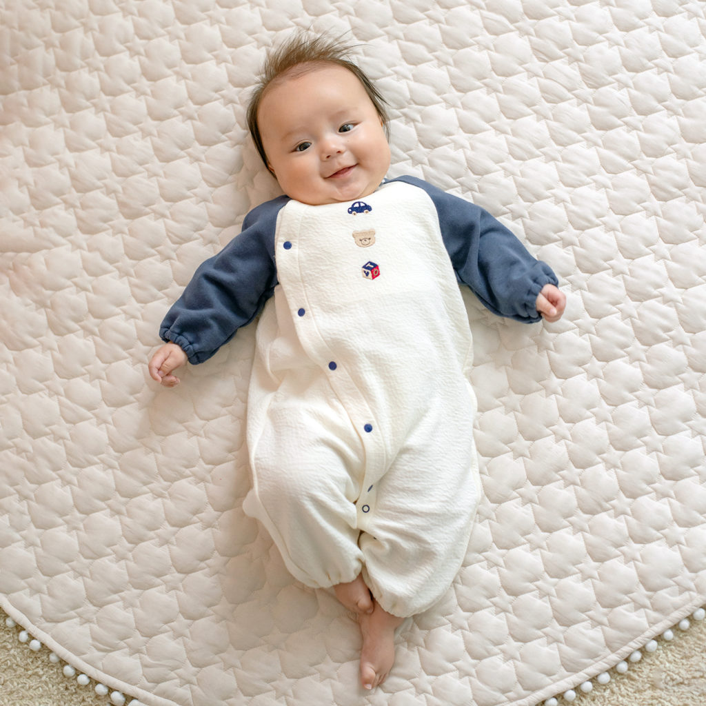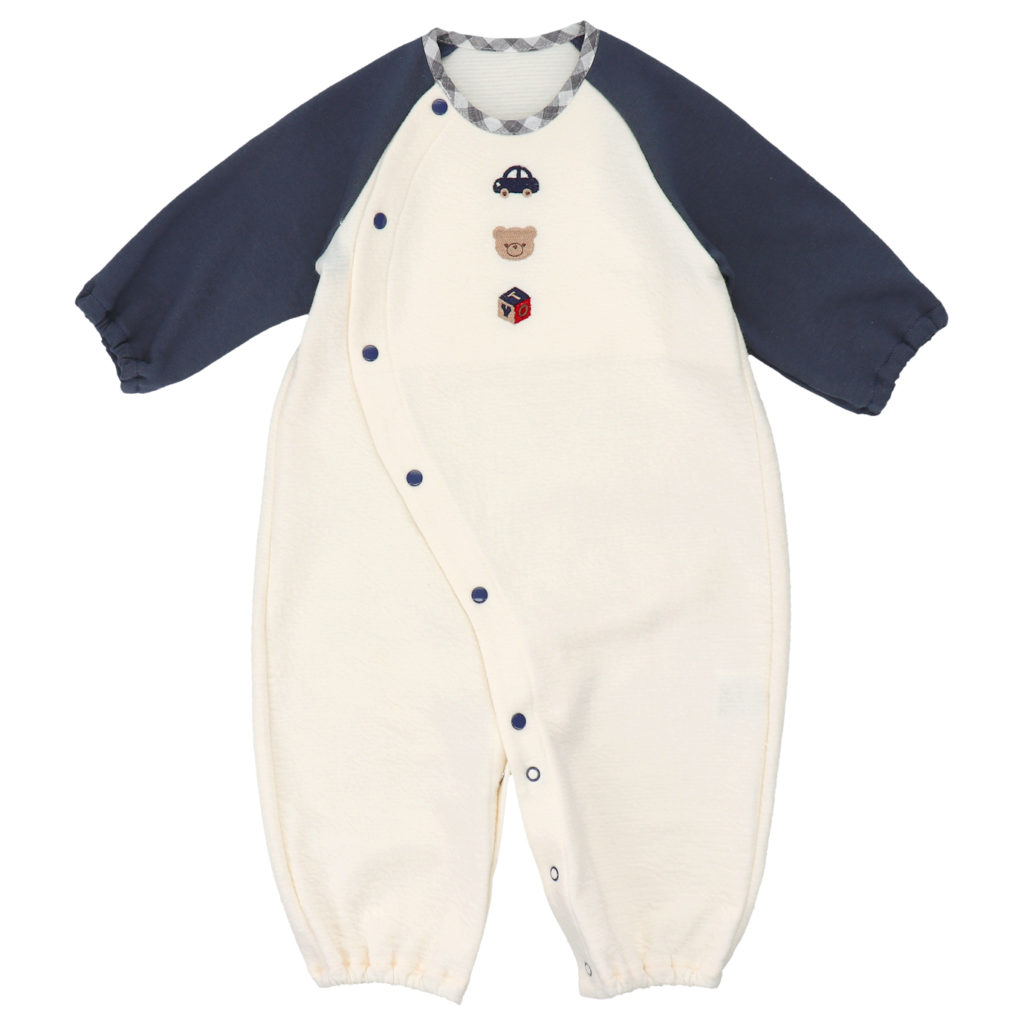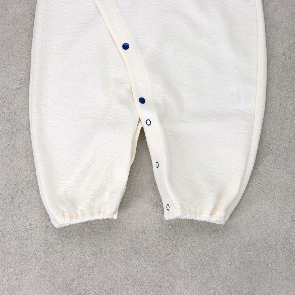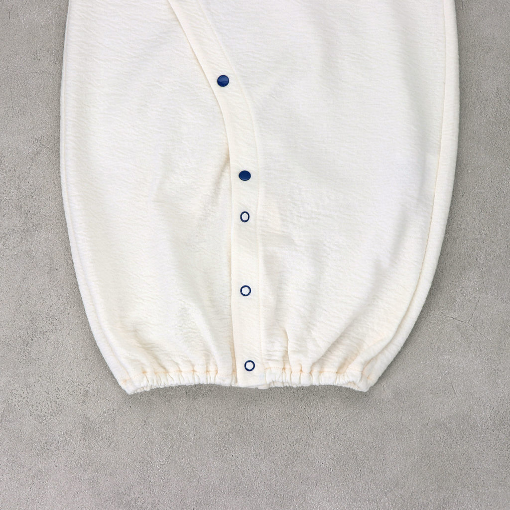 胸元の小さな刺繍が可愛いドレスです。ほどよい生地厚と保温性のある裏毛素材で、秋から春先まで活躍します。 生まれてすぐはすっぽり足を包むドレスタイプ。 足がばたばたできるようになったらボタンを留め替えてカバーオールタイプにもなるツーウェイ仕様です。