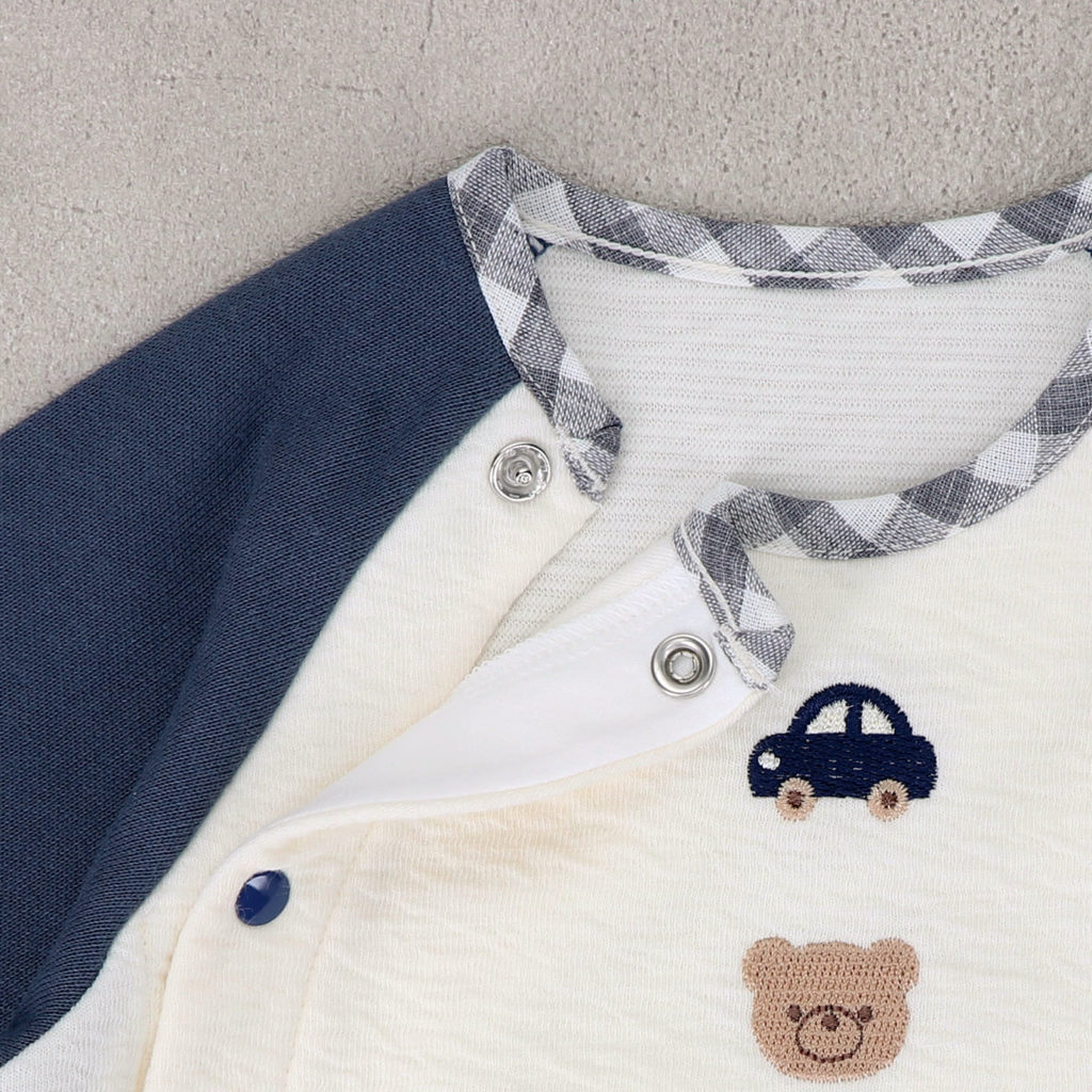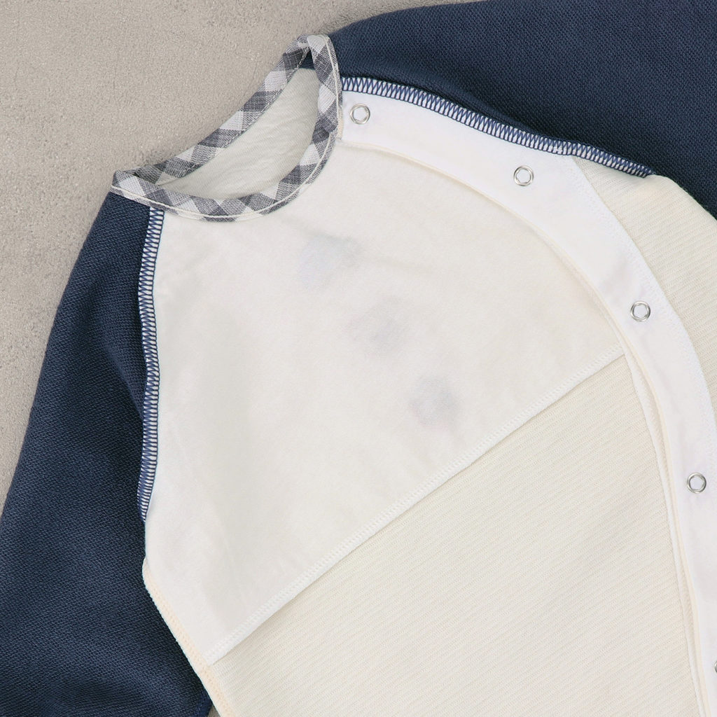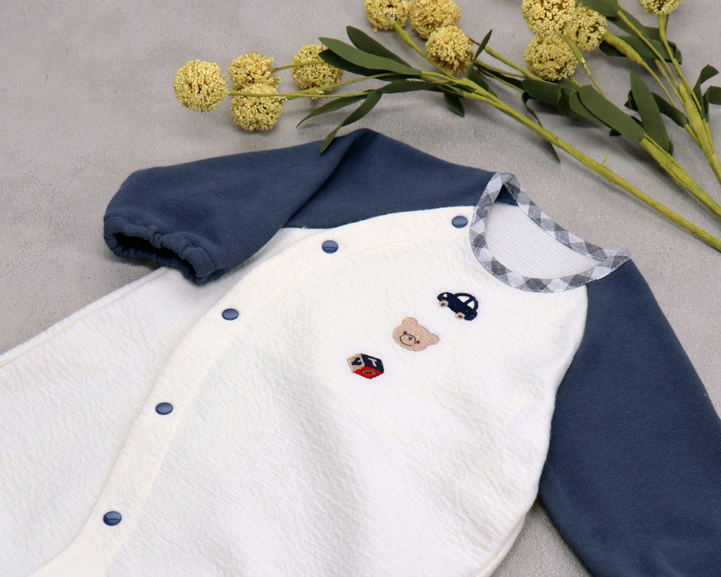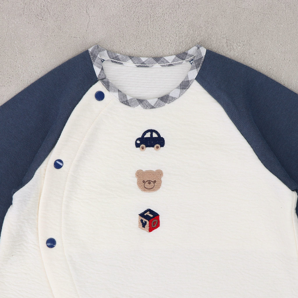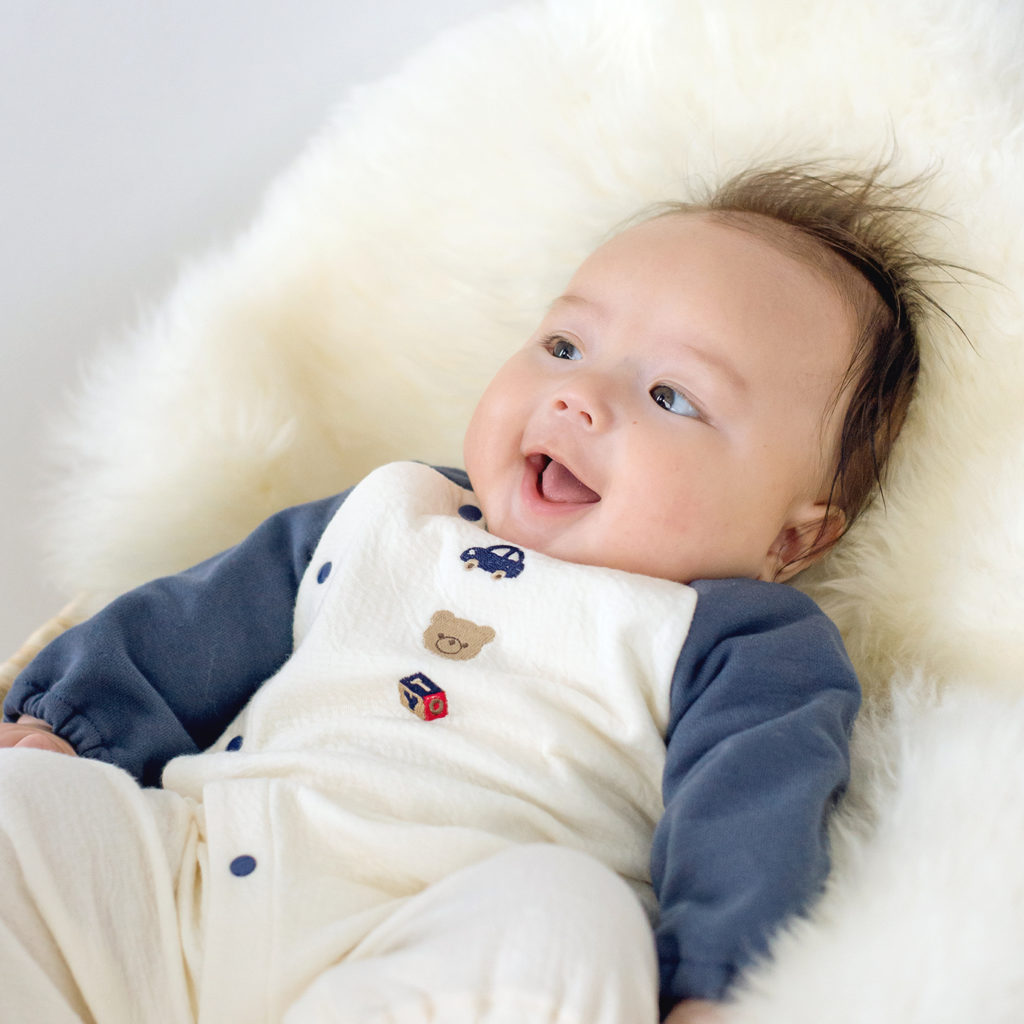 胸元の小さな刺繍が可愛いドレスです。ほどよい生地厚と保温性のある裏毛素材で、秋から春先まで活躍します。 生まれてすぐはすっぽり足を包むドレスタイプ。 足がばたばたできるようになったらボタンを留め替えてカバーオールタイプにもなるツーウェイ仕様です。