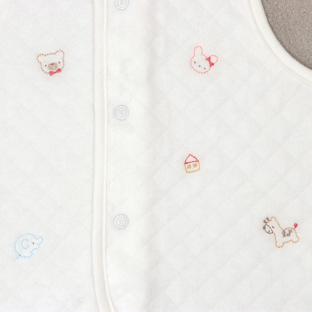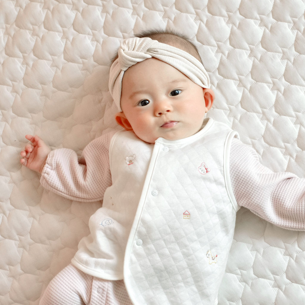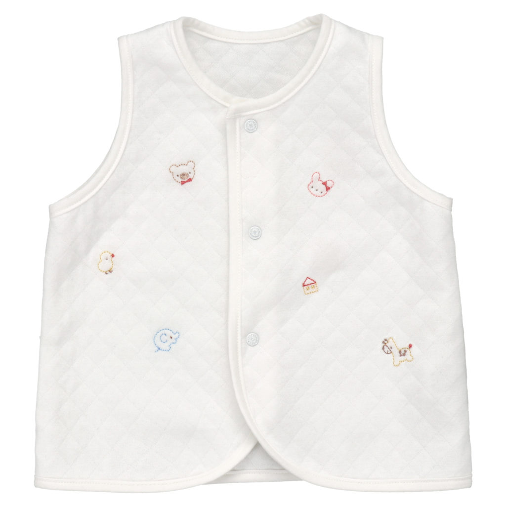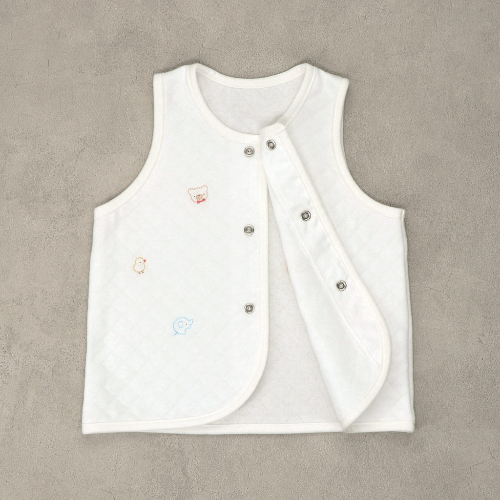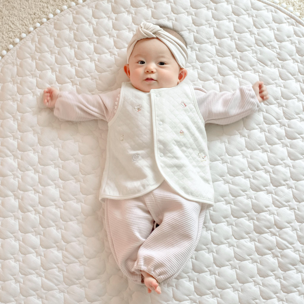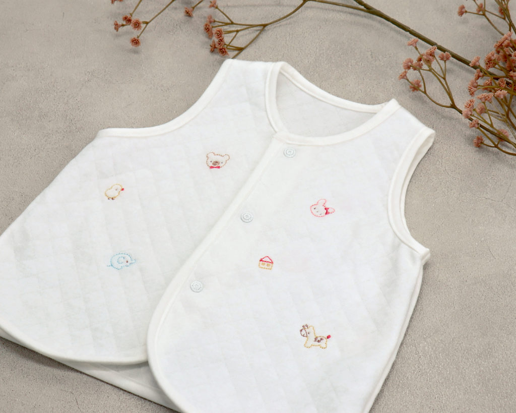 薄手なので一年中使えるニットキルトのベストです。 洗っても硬くならず、軽くてふわふわのスマイルコットンは、肌への刺激が少なく、赤ちゃんのデリケートな肌にやさしい素材です。フリースと接結の2枚合わせになっているので、軽いのにとてもあったか。肌寒いお出掛けの日に是非ご活用ください。