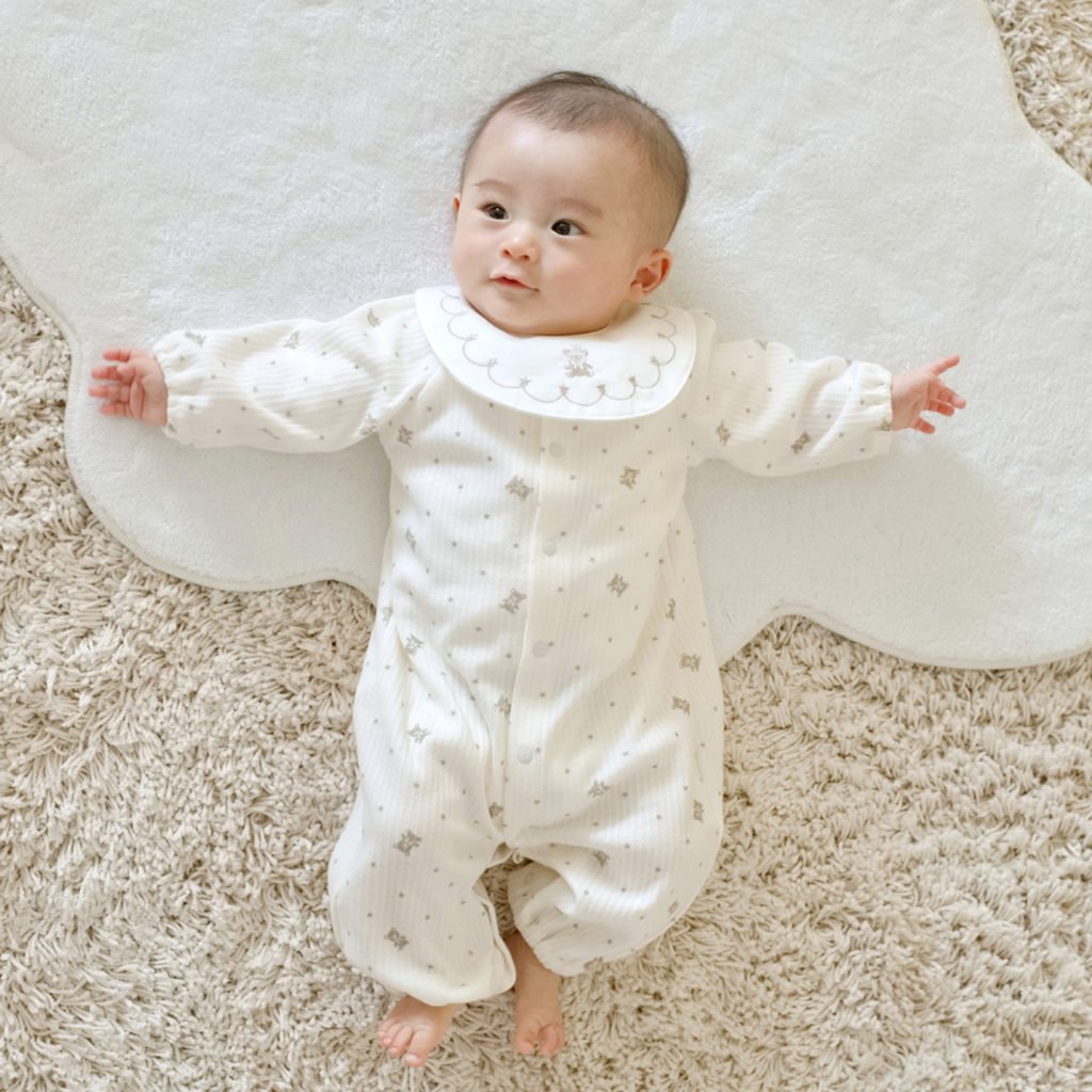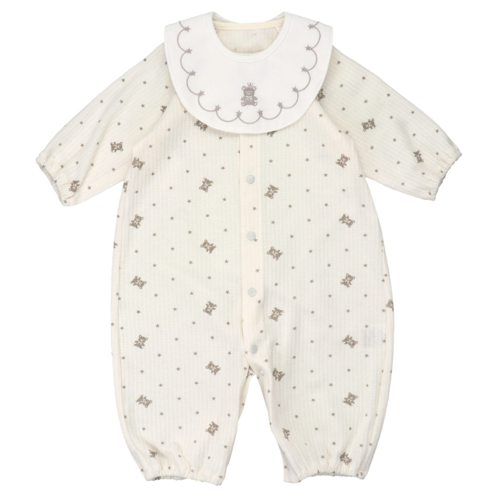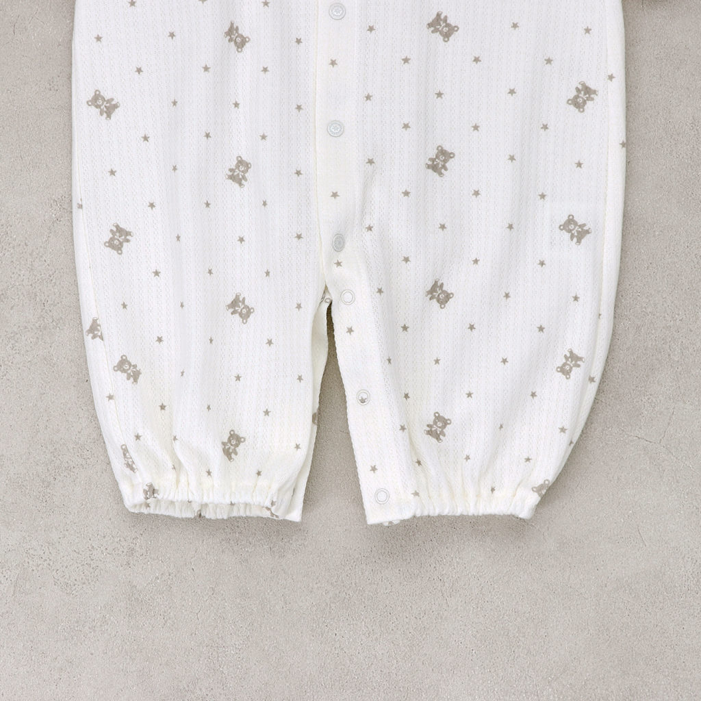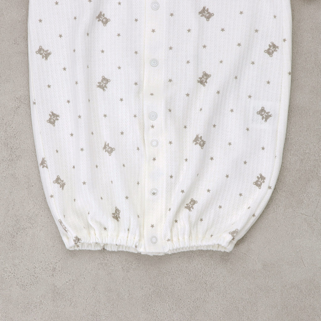 グレージュの上品なくまさんがかわいいプリントです。2枚の生地を合わせた接結素材は、空気を含んでふんわりやわらかく暖かいので、肌寒い春先や秋冬シーズンに最適です。スタイは取り外し可能なので、いろんなコーディネイトができます。生まれてすぐはすっぽり足を包むドレスタイプ。足がばたばたできるようになったらボタンを留め替えてカバーオールタイプにもなるツーウェイ仕様です。
