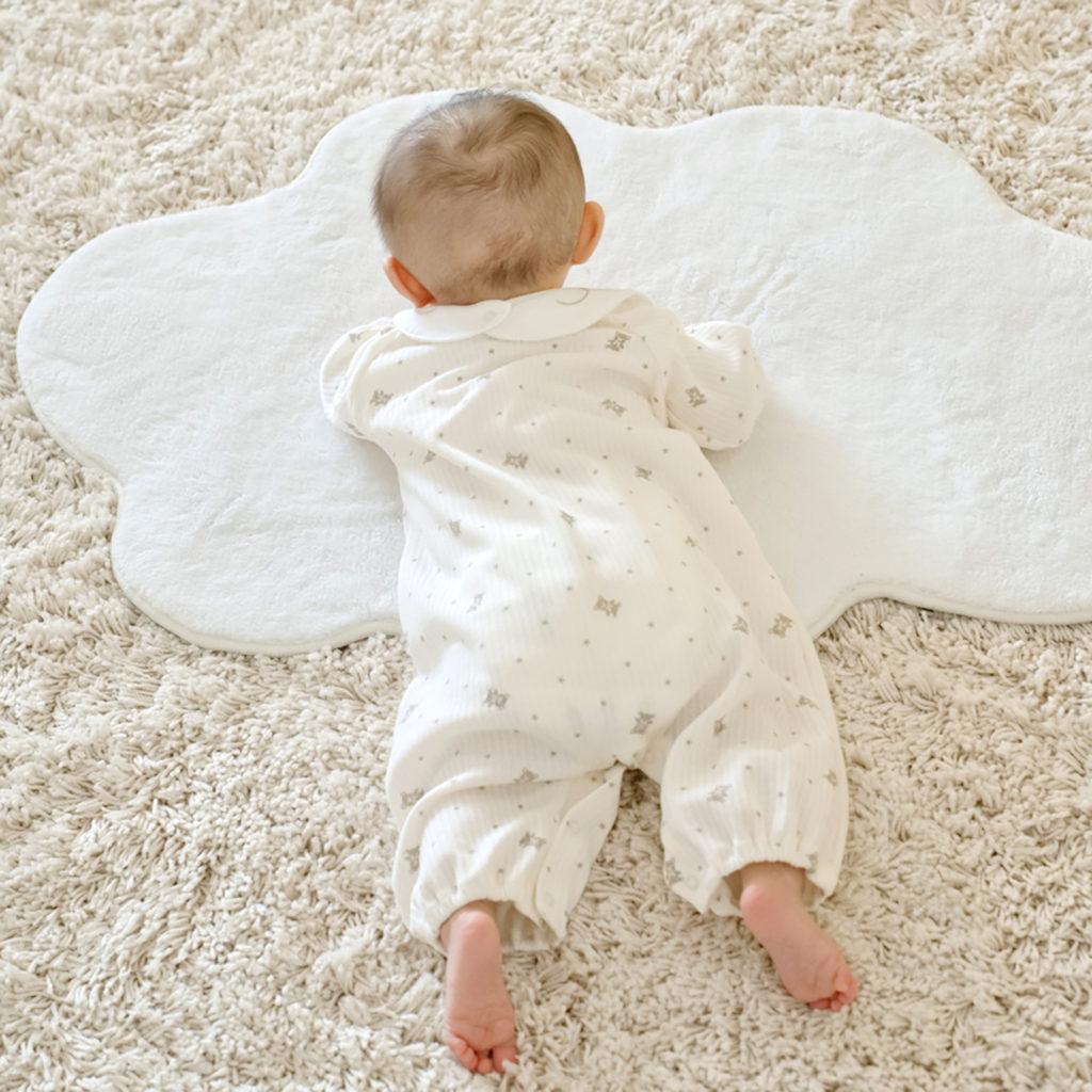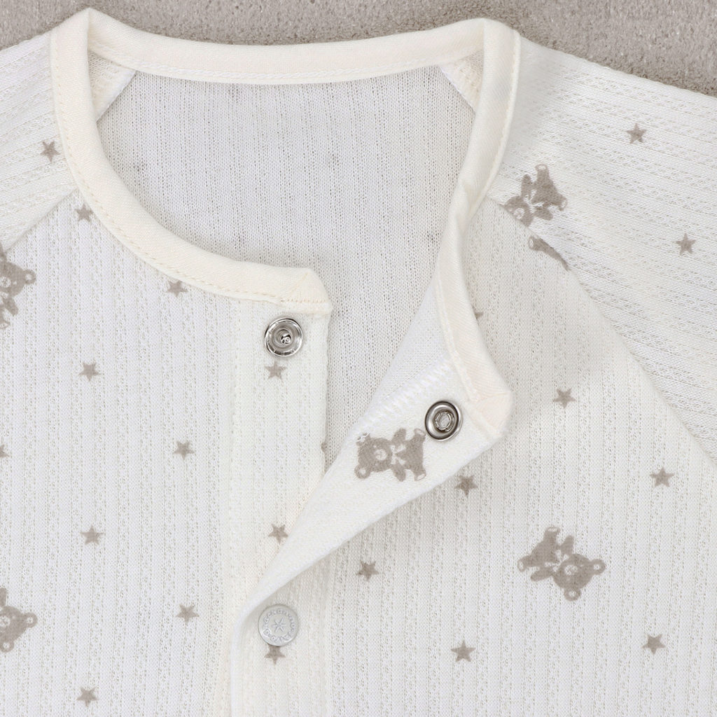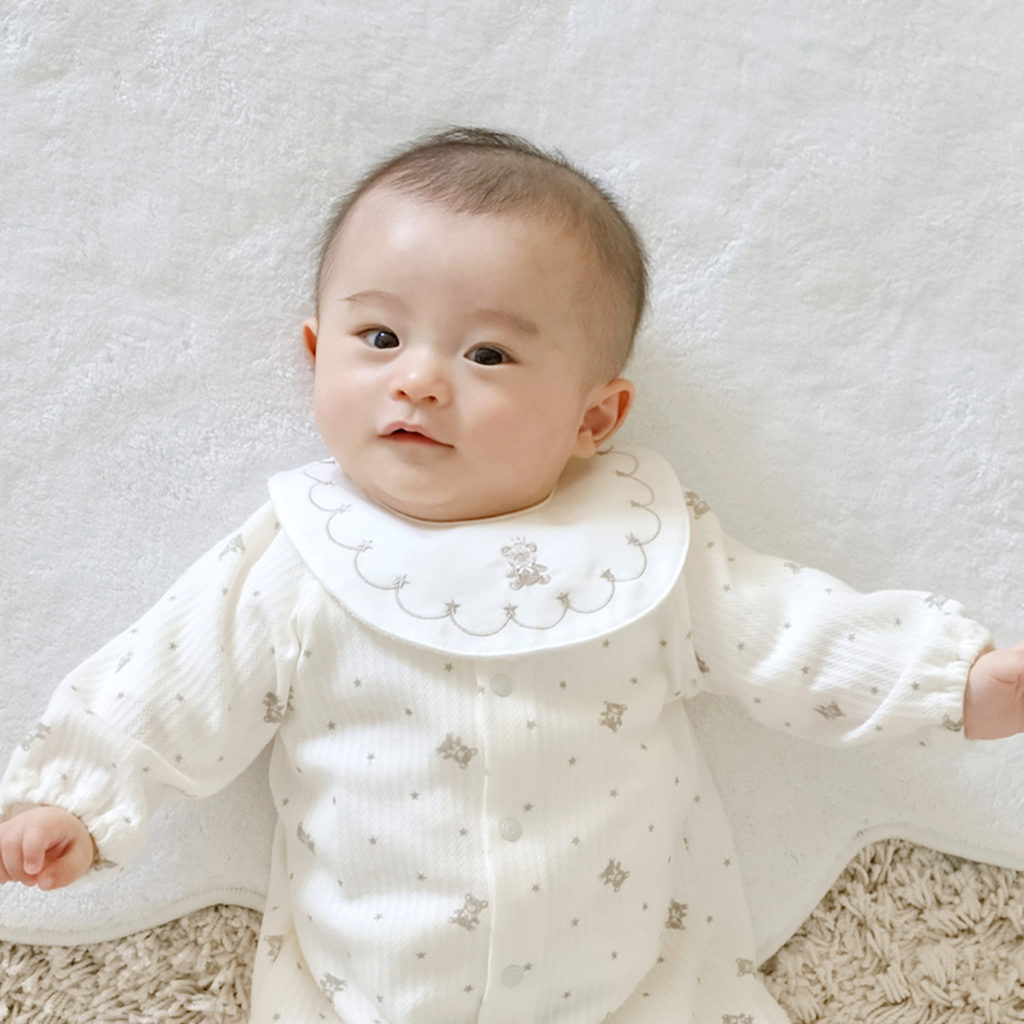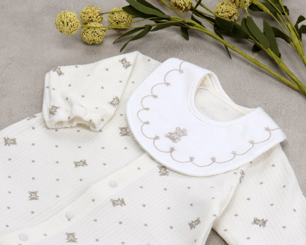 グレージュの上品なくまさんがかわいいプリントです。2枚の生地を合わせた接結素材は、空気を含んでふんわりやわらかく暖かいので、肌寒い春先や秋冬シーズンに最適です。スタイは取り外し可能なので、いろんなコーディネイトができます。生まれてすぐはすっぽり足を包むドレスタイプ。足がばたばたできるようになったらボタンを留め替えてカバーオールタイプにもなるツーウェイ仕様です。