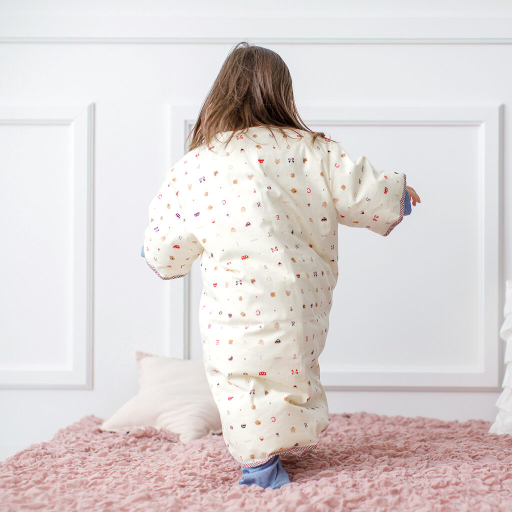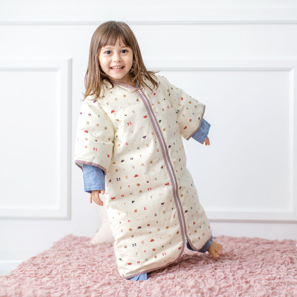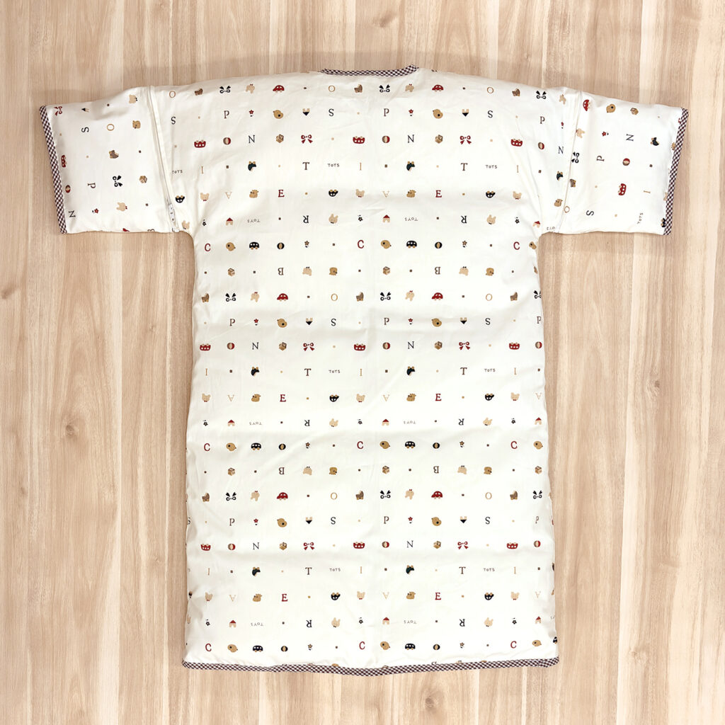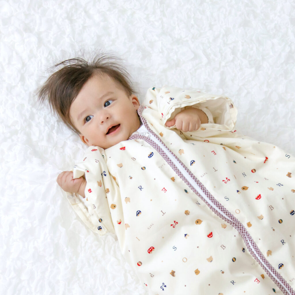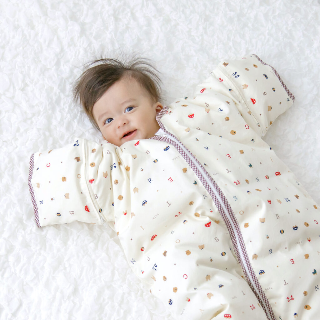 ・赤ちゃんが寝返りを始めるようになって、寝返り返り(うつ伏せから仰向けに戻ること) が容易にできるようになるまで、赤ちゃんの手首から先が完全に出るように袖をとってご使用ください。