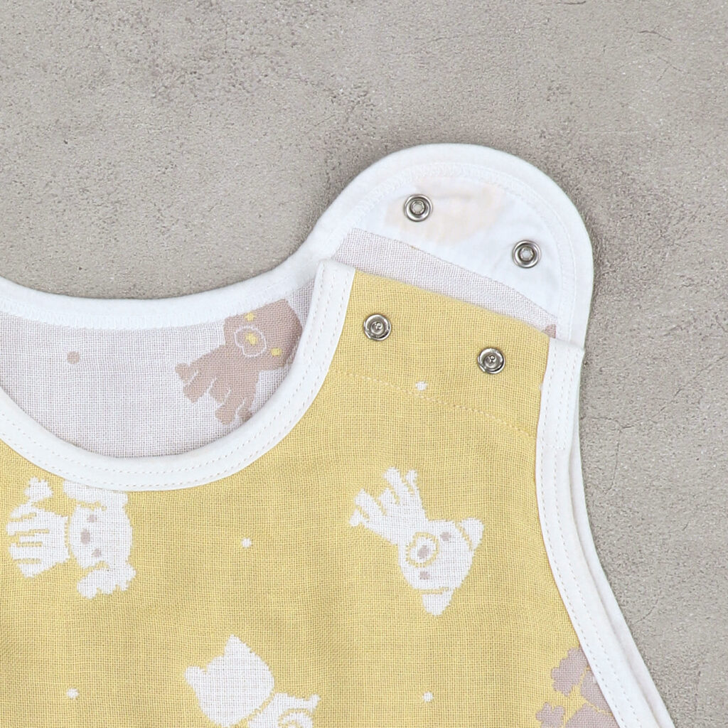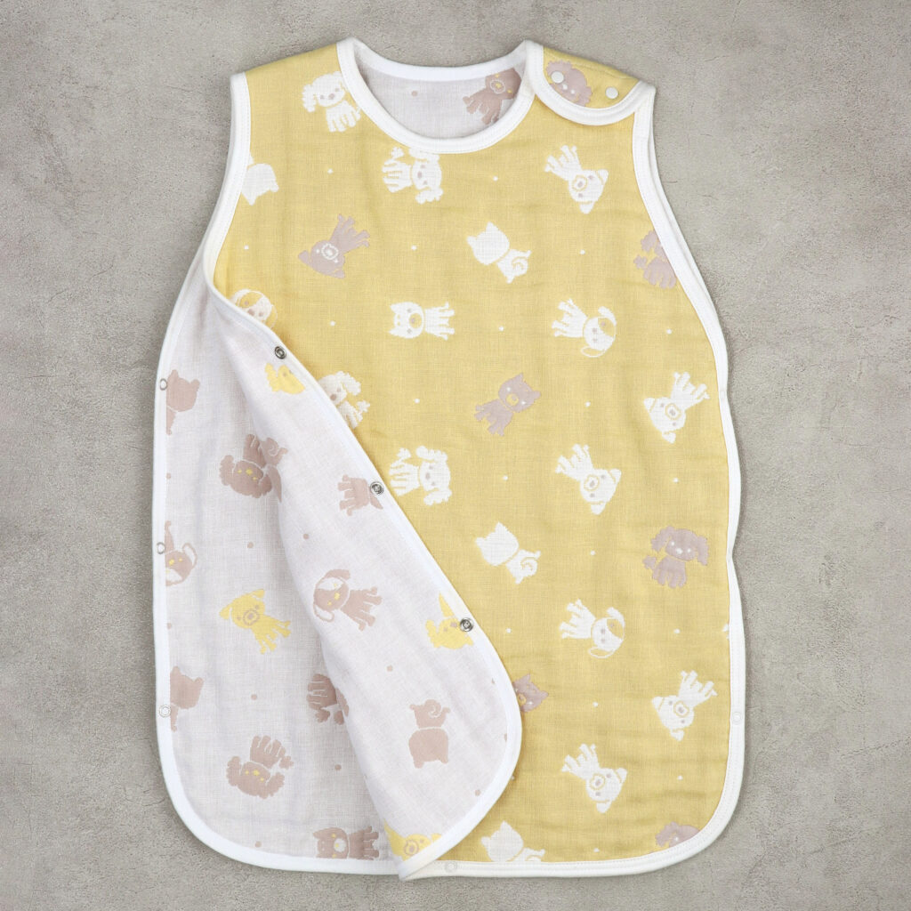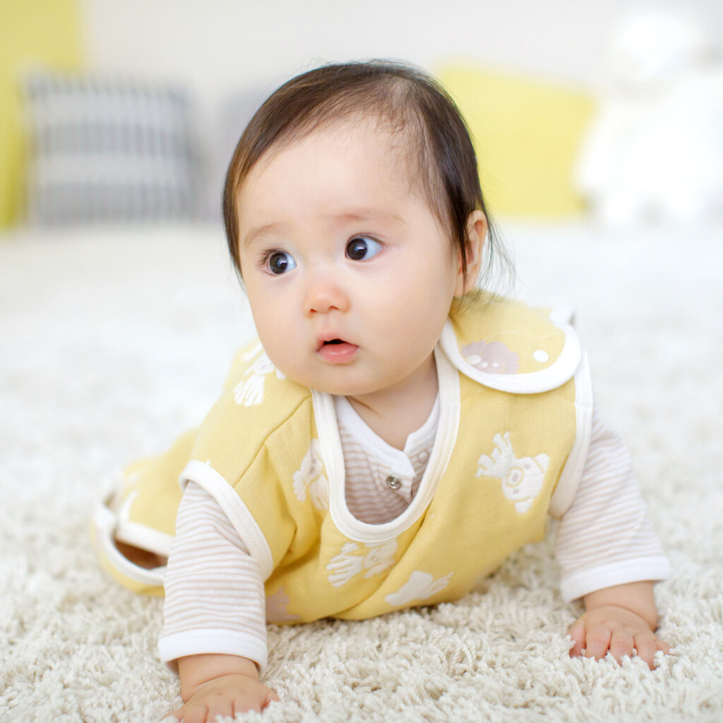 おなかが出ないスリーパーは、寝冷え対策に最適。長く使えるので、ギフトにも人気のアイテムです。両脇と肩のボタンで大きく開くので、寝かせたままの着せ替えも簡単です。股下のボタンを留めれば、裾がまくれ上がることもありません。