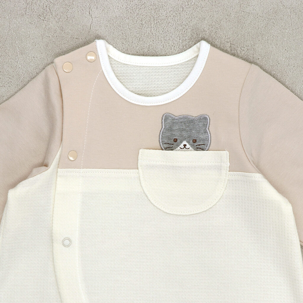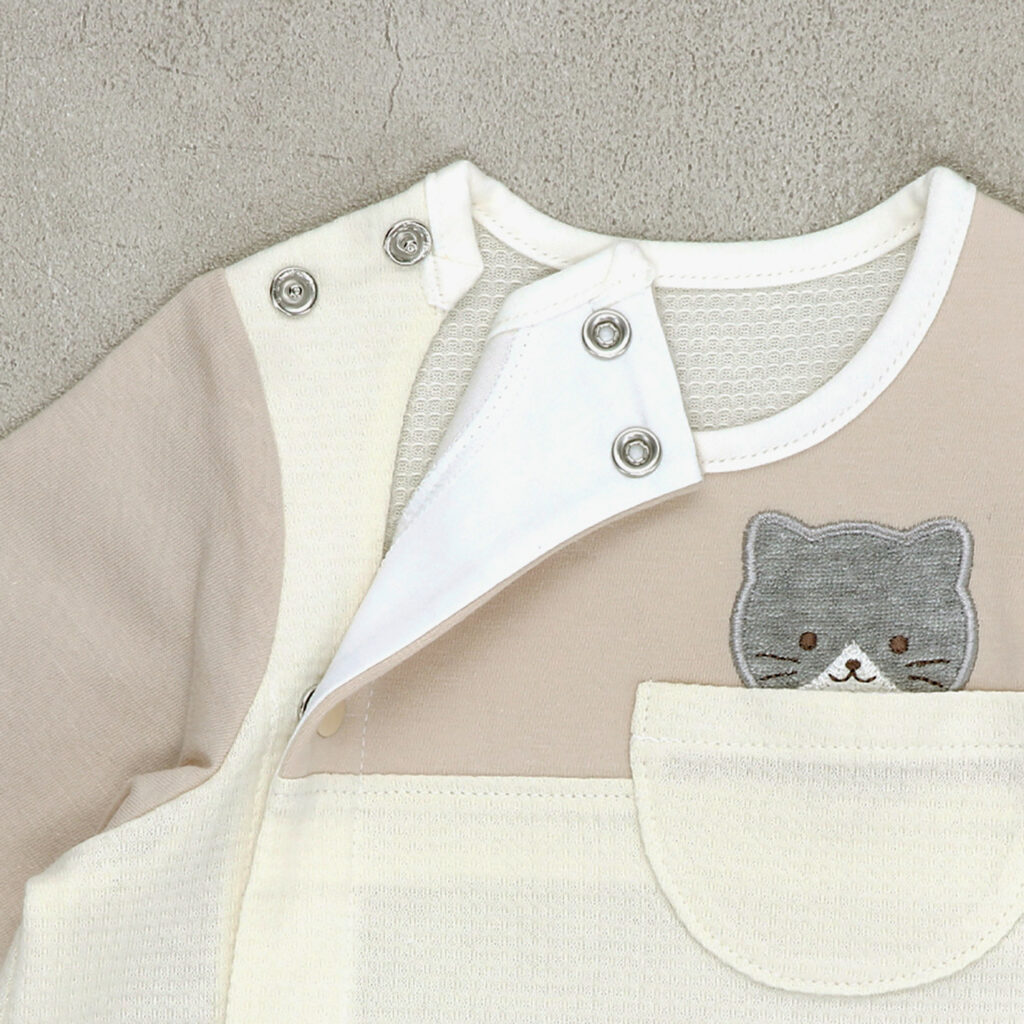 ポケットからのぞくにゃんこちゃんの刺繍がかわいいデザイン。ジャカードの天竺は軽くて薄い編地でさらっとした肌触りが気持ちいい夏用ウェアです。