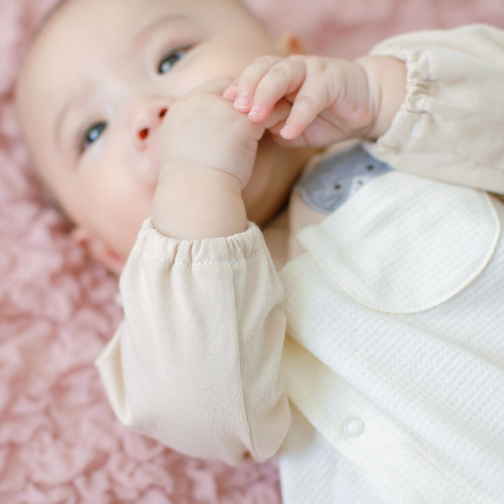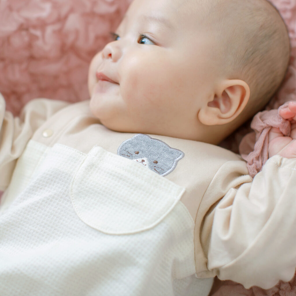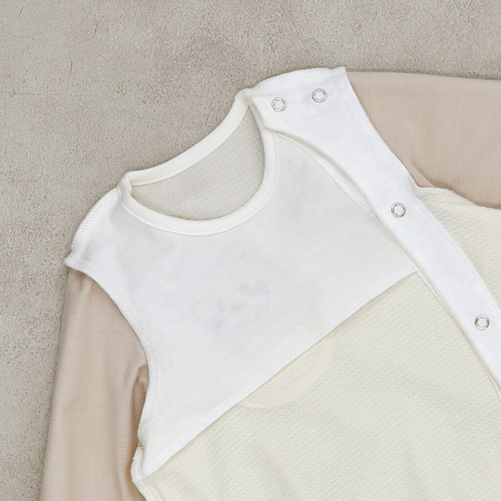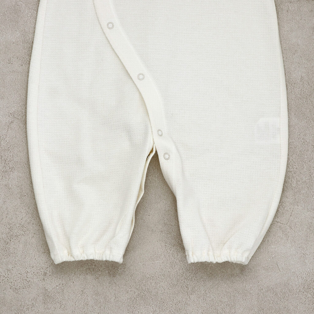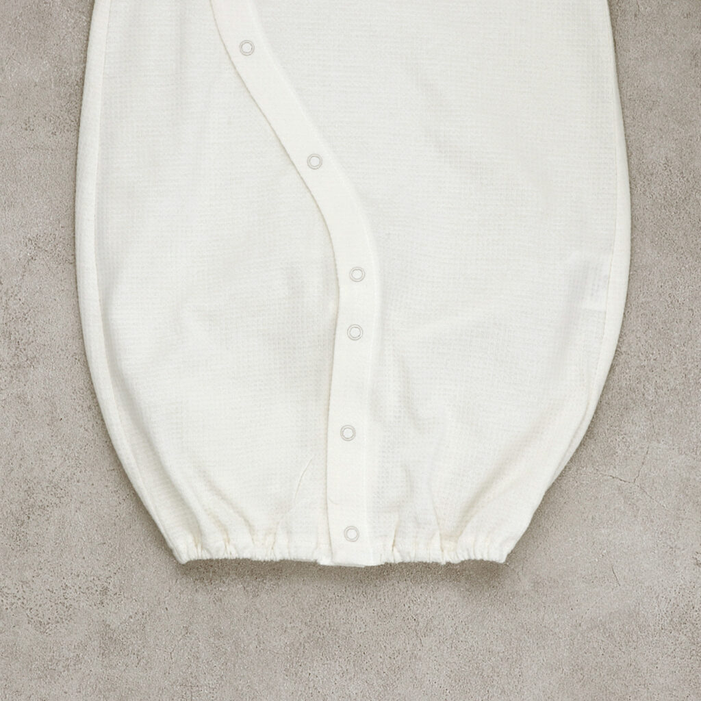 生まれてすぐは足を包むドレスタイプ。 足をばたばた出来るようになったらボタンを留め替えて、カバーオールタイプにもなるツーウェイ仕様です。