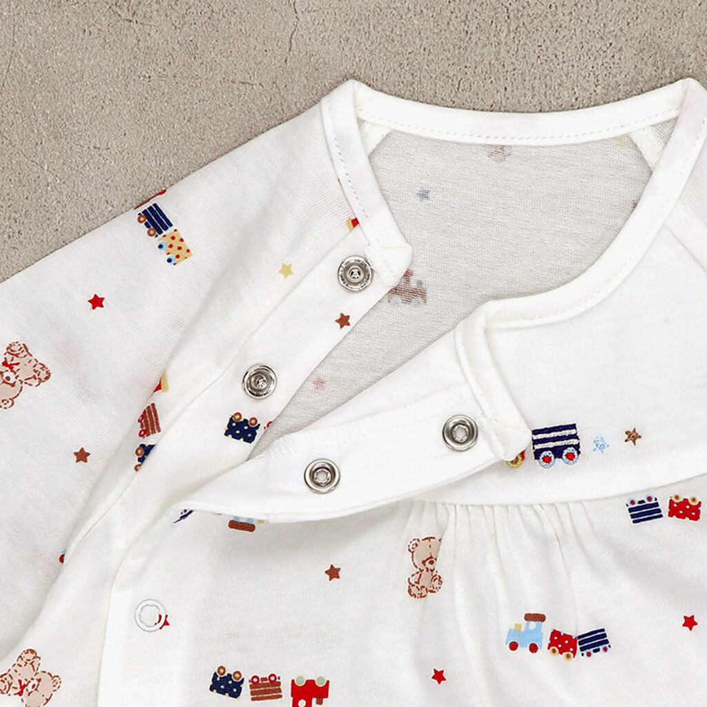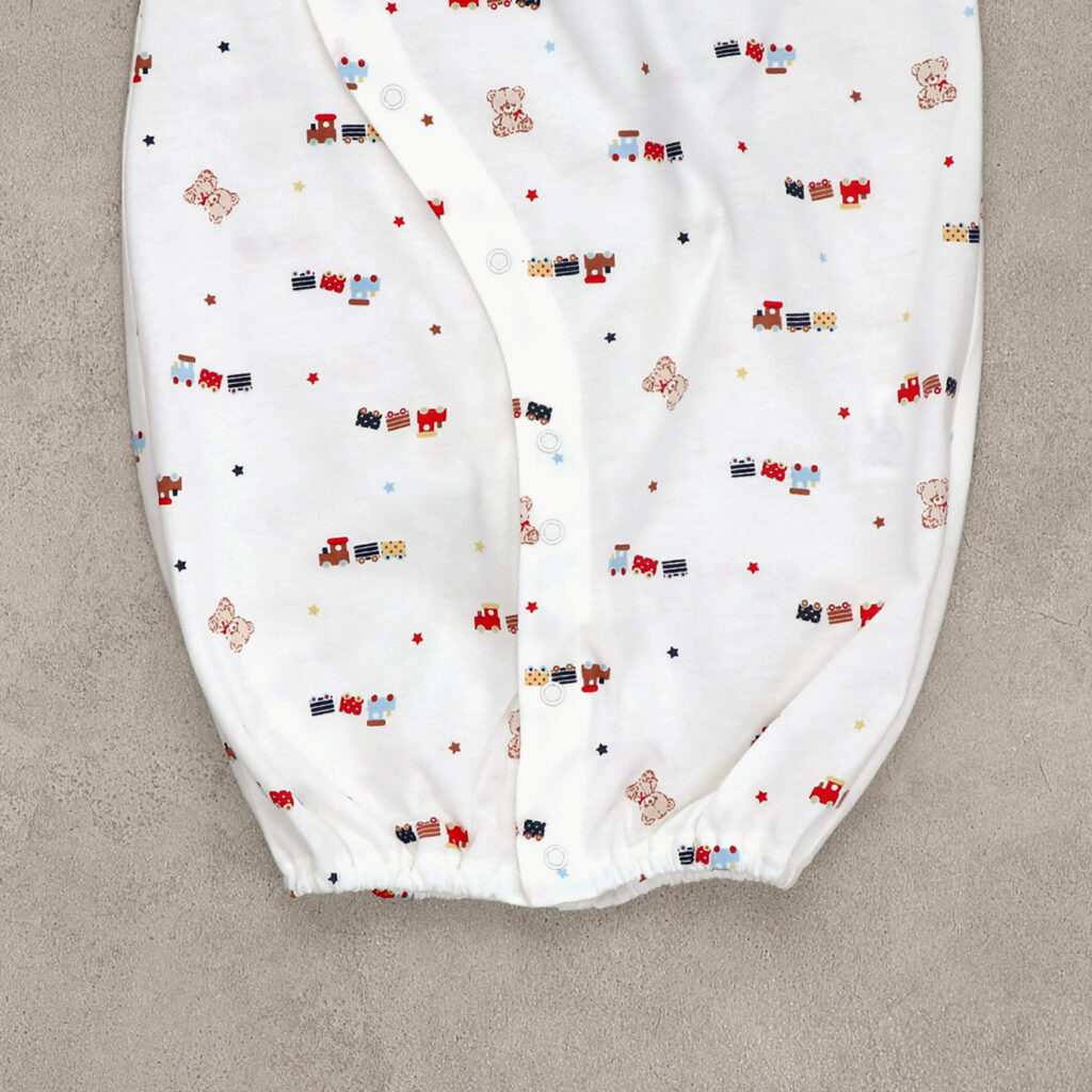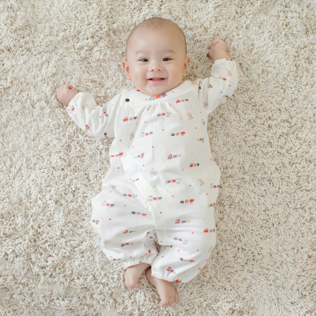 生まれてすぐは足を包むドレスタイプ。 足をばたばた出来るようになったらボタンを留め替えて、カバーオールタイプにもなるツーウェイ仕様です。