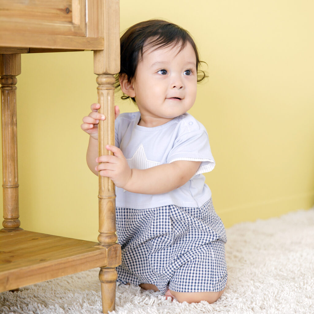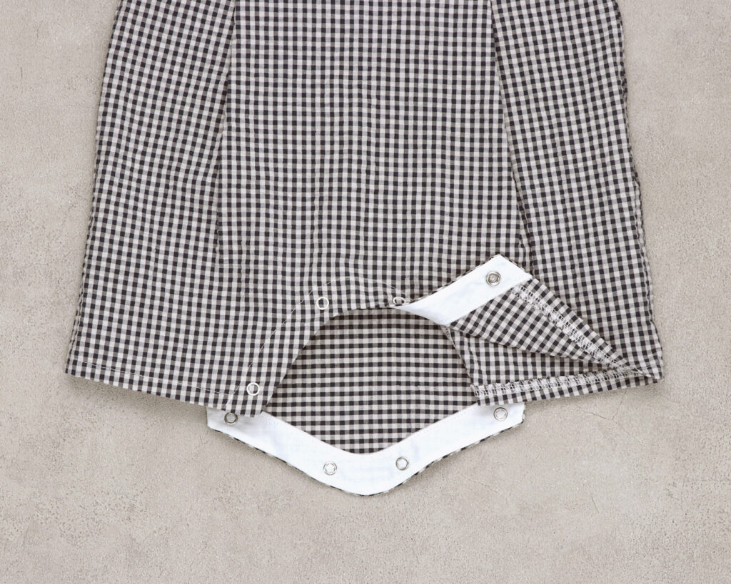 天竺のやわらかさと、サッカー生地の凹凸による通気性をあわせ持ち、肌離れがよく、さらっと快適に着られる素材です。また、おなかが出ないロンパースは元気いっぱいな赤ちゃんにおすすめです。