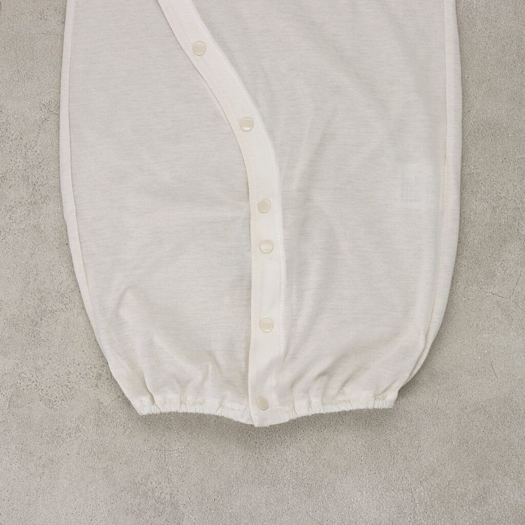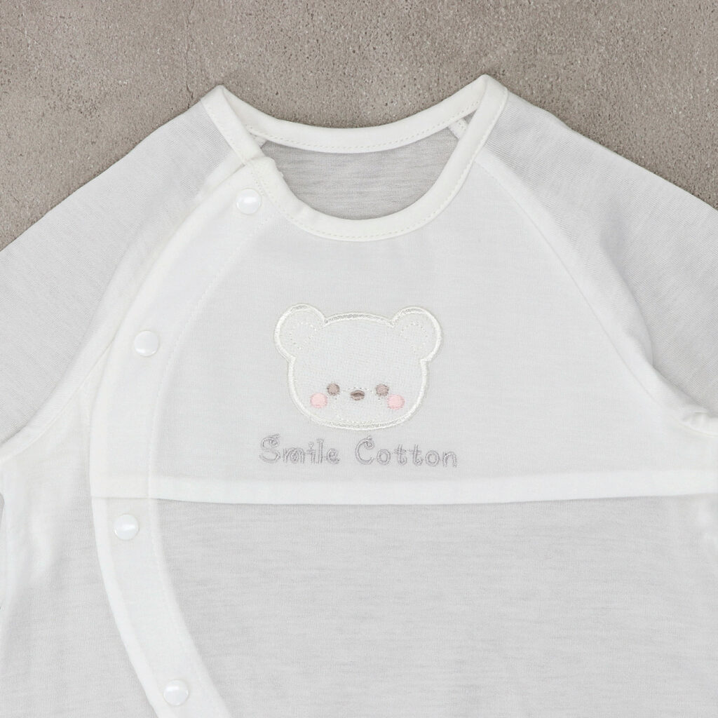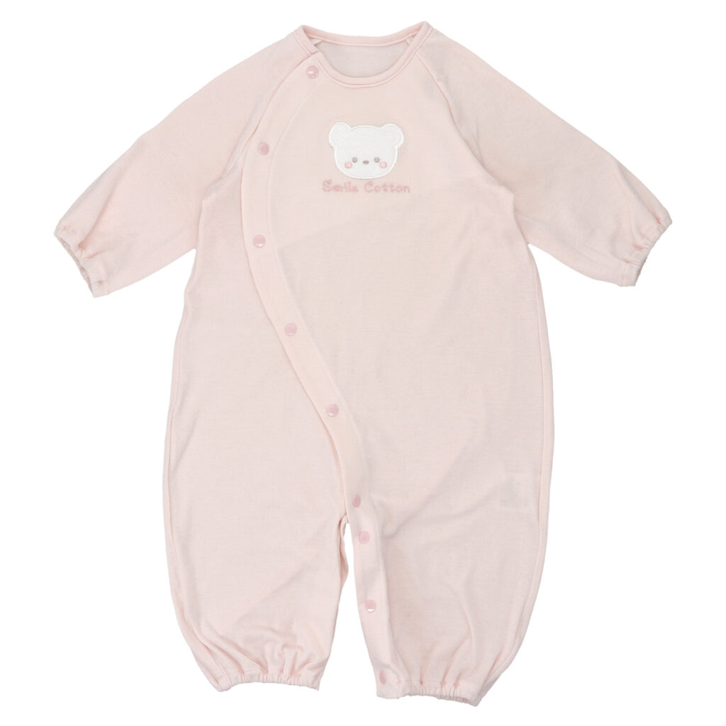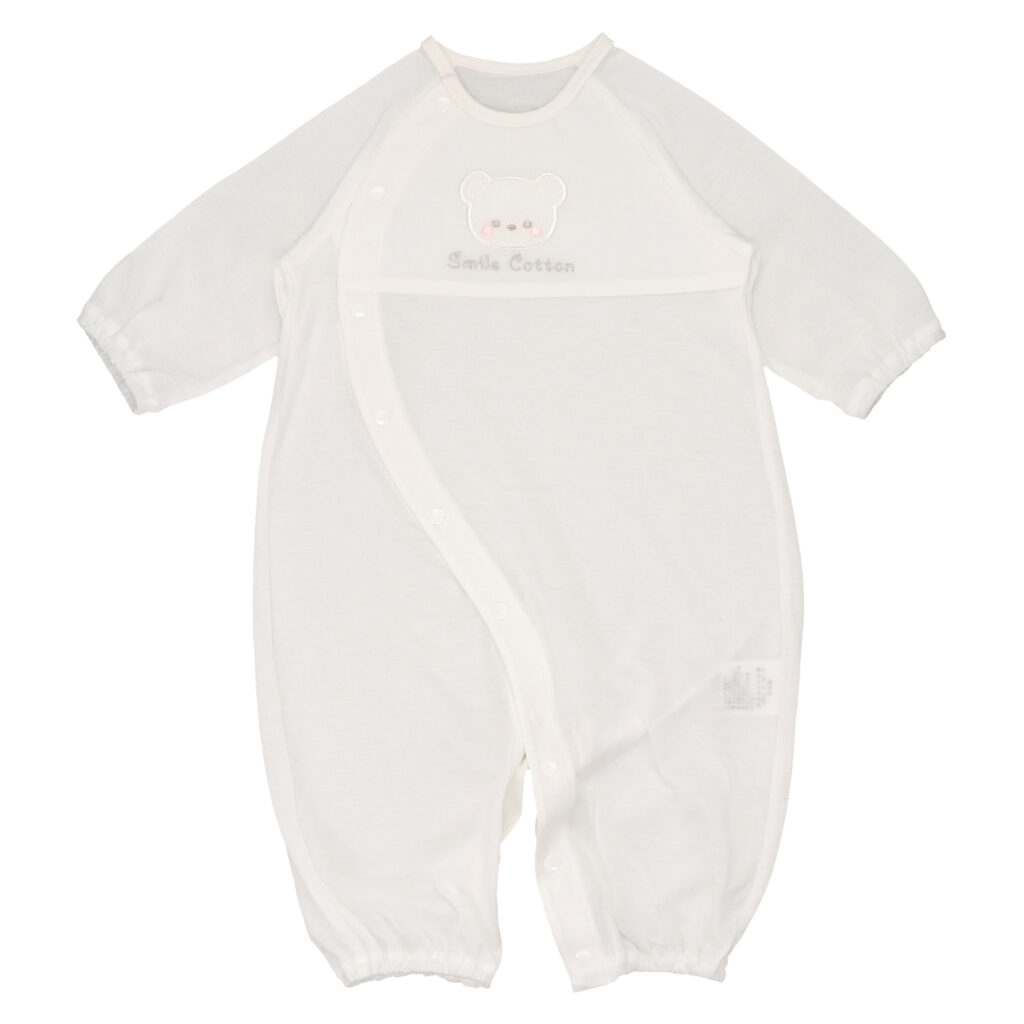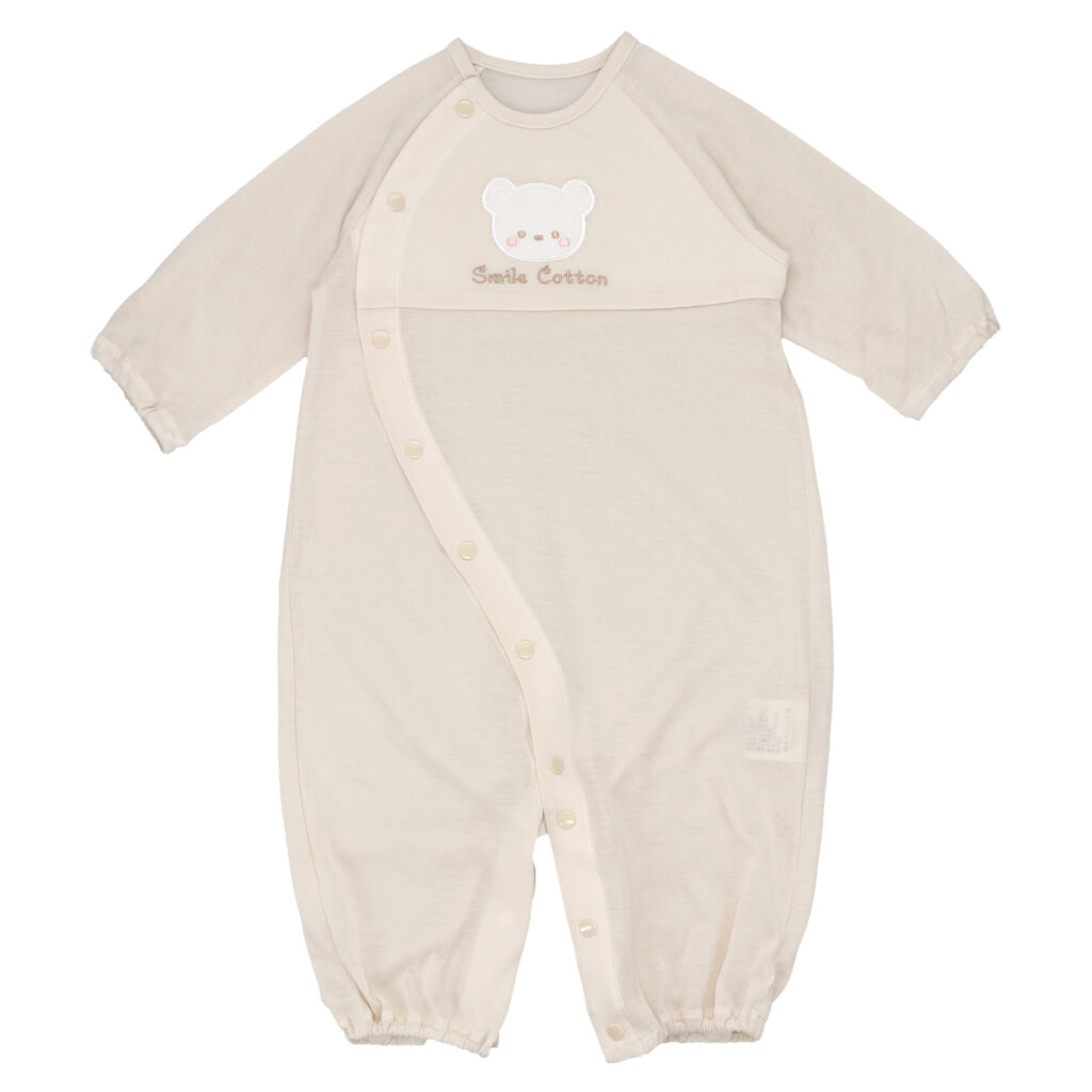 洗っても硬くならず、軽くてふわふわのやわらかさを追求したスマイルコットンを使用した、春から夏にぴったりのウェアです。 肌への刺激が少なく、赤ちゃんのデリケートな肌にもやさしい素材です。 生まれてすぐはすっぽり足を包むドレスタイプ。 足がばたばたできるようになったらボタンを留め替えてカバーオールタイプにもなるツーウェイ仕様です。