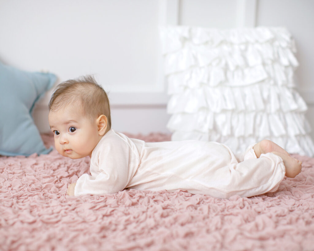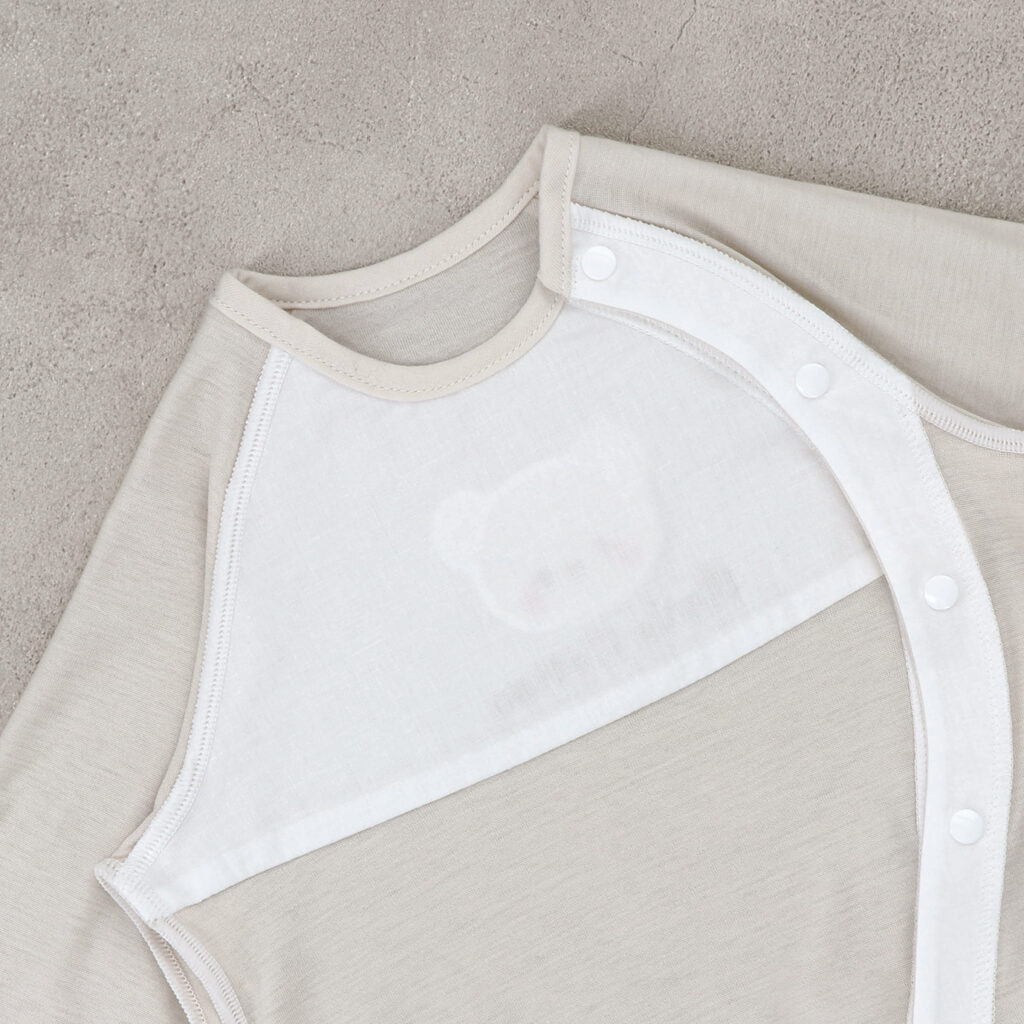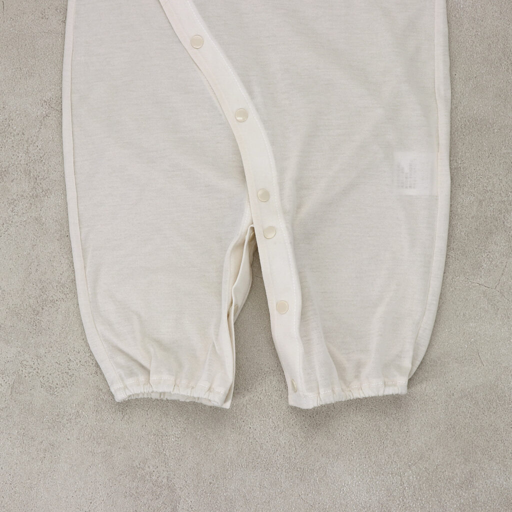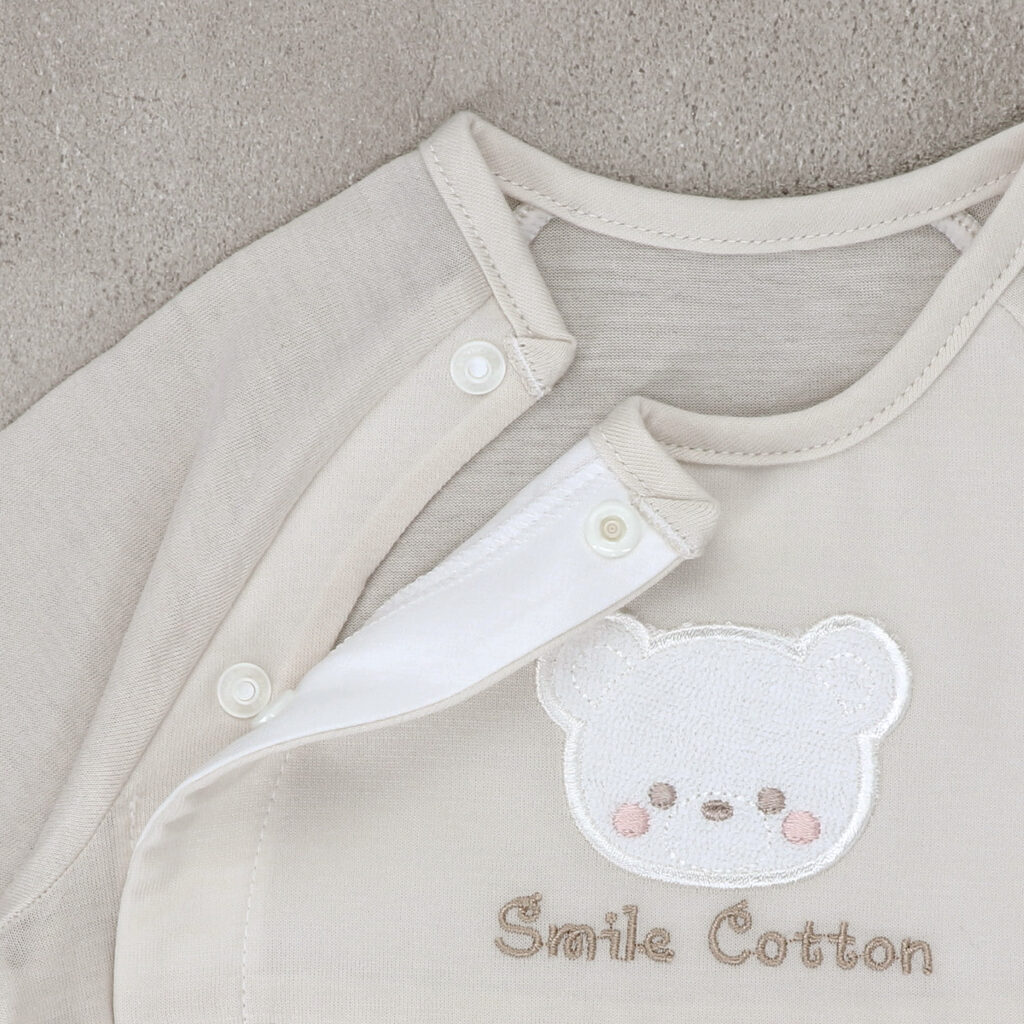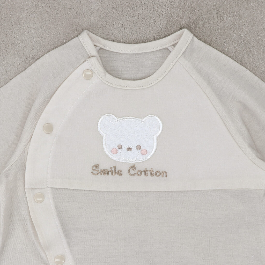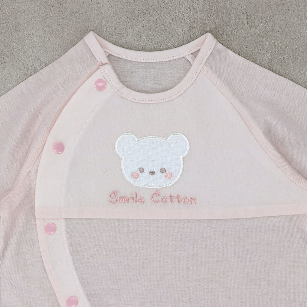 洗っても硬くならず、軽くてふわふわのやわらかさを追求したスマイルコットンを使用した、春から夏にぴったりのウェアです。 肌への刺激が少なく、赤ちゃんのデリケートな肌にもやさしい素材です。 生まれてすぐはすっぽり足を包むドレスタイプ。 足がばたばたできるようになったらボタンを留め替えてカバーオールタイプにもなるツーウェイ仕様です。