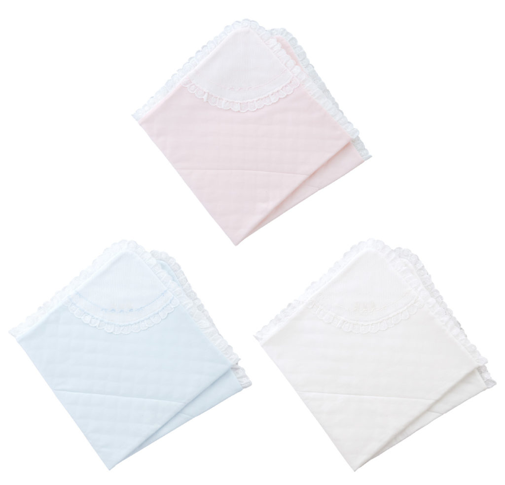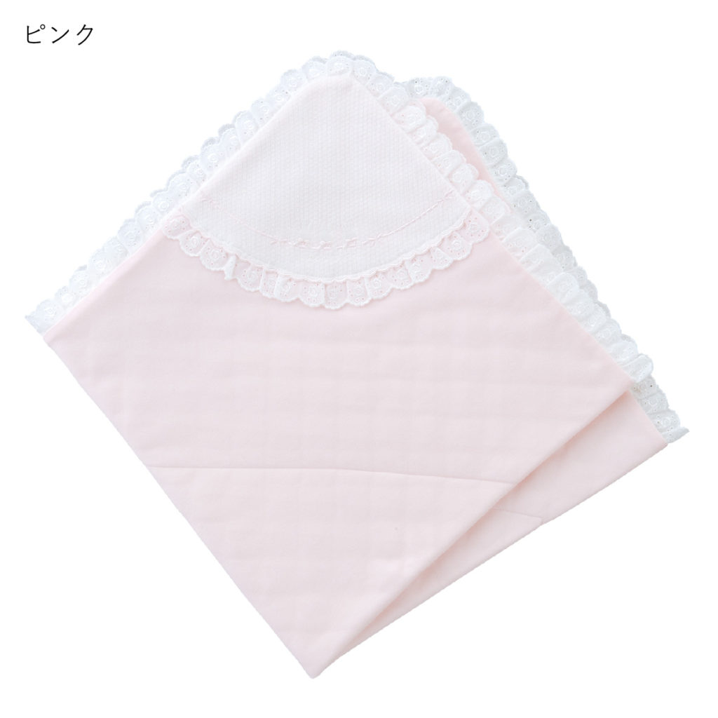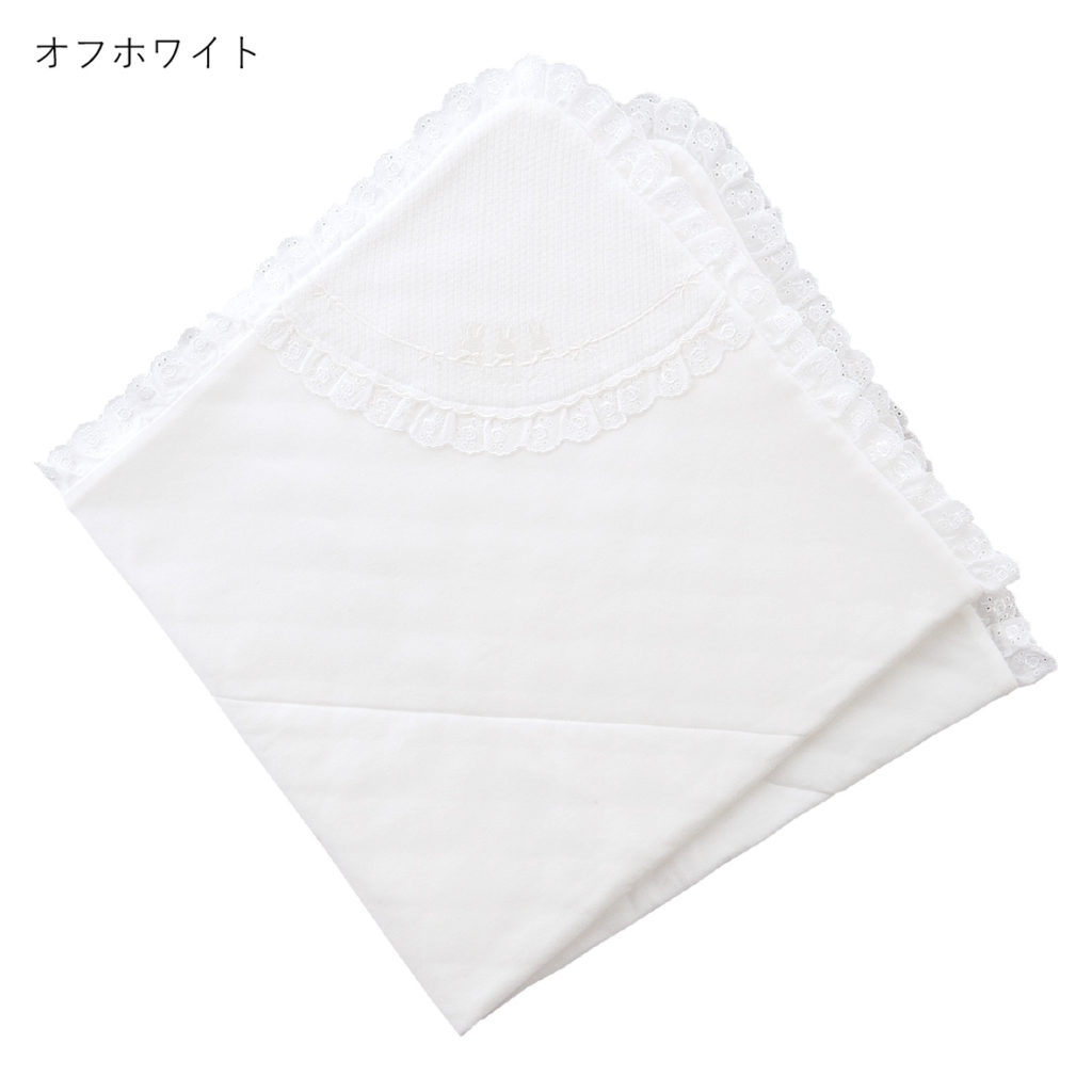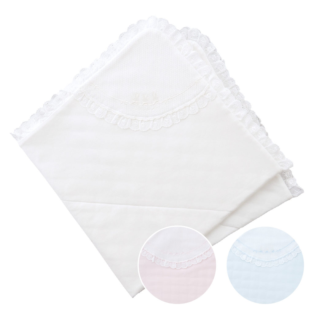 やさしいパステルカラーにうさぎの刺繍が入った中綿入りの暖かいアフガンです。表裏の素材は綿100%。レース使いのエレガントなデザインは退院やお出かけにもおすすめです。包んだり掛けたり敷いたり色々使える便利なアイテムです。