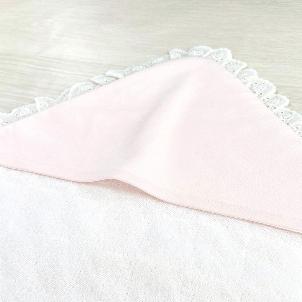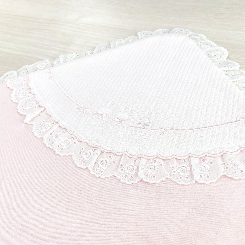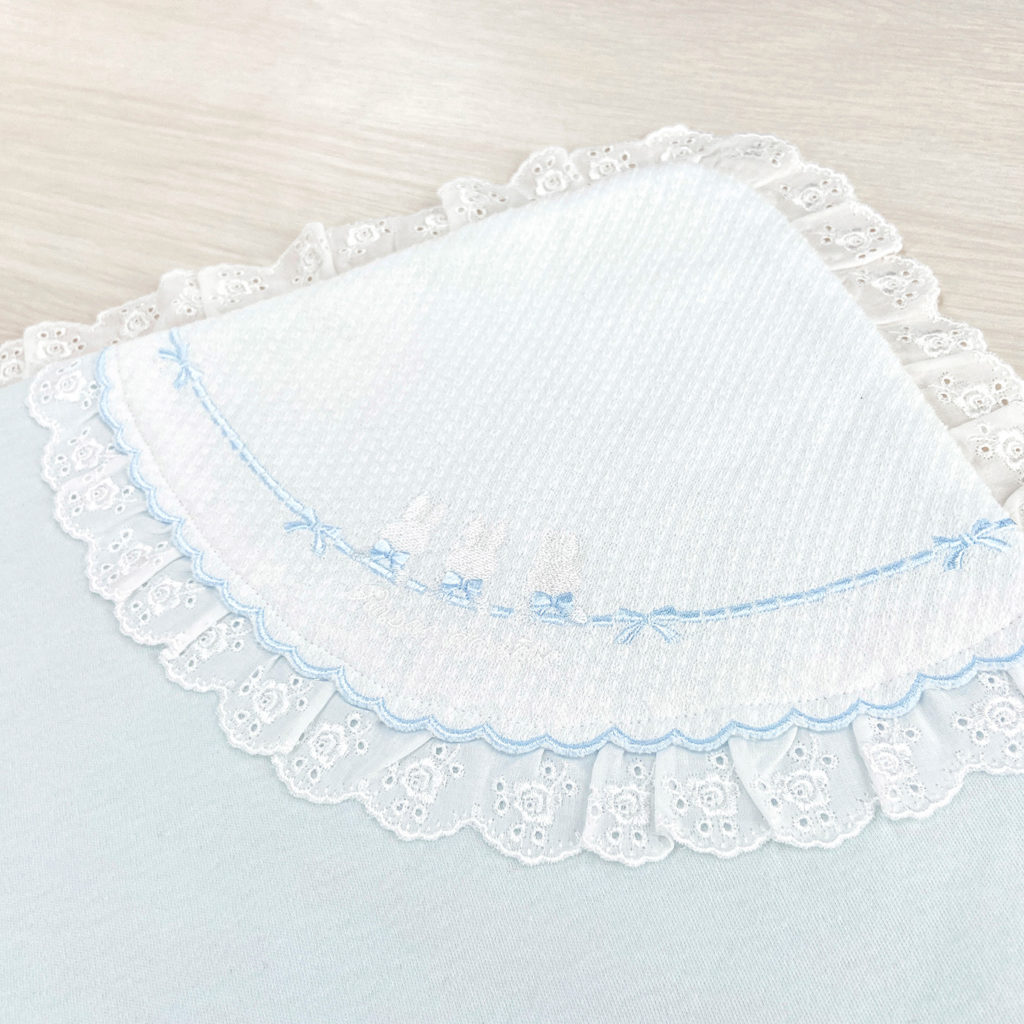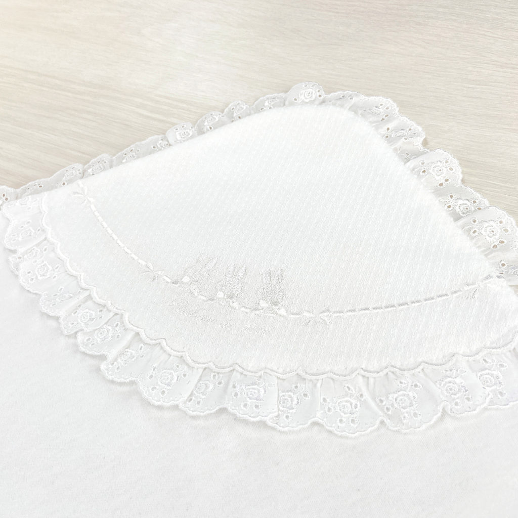 やさしいパステルカラーにうさぎの刺繍が入った中綿入りの暖かいアフガンです。表裏の素材は綿100%。レース使いのエレガントなデザインは退院やお出かけにもおすすめです。包んだり掛けたり敷いたり色々使える便利なアイテムです。