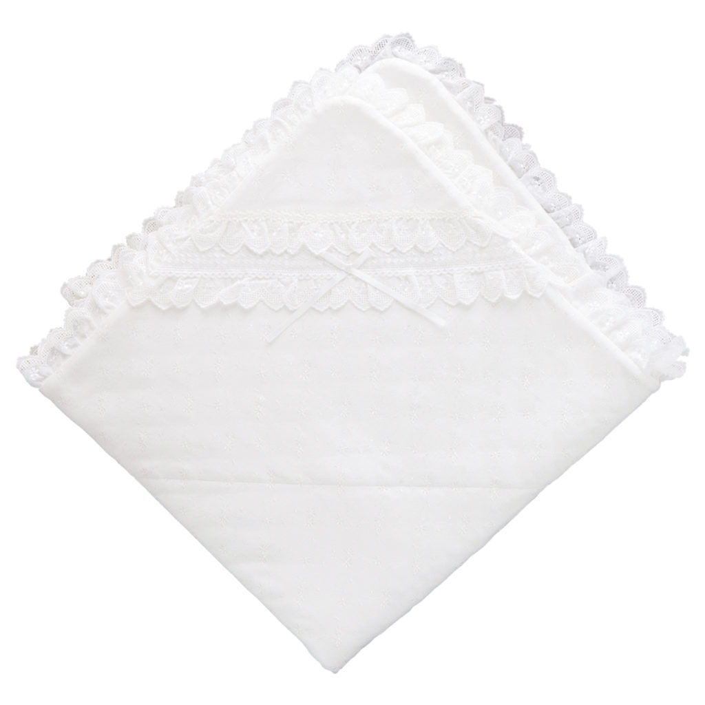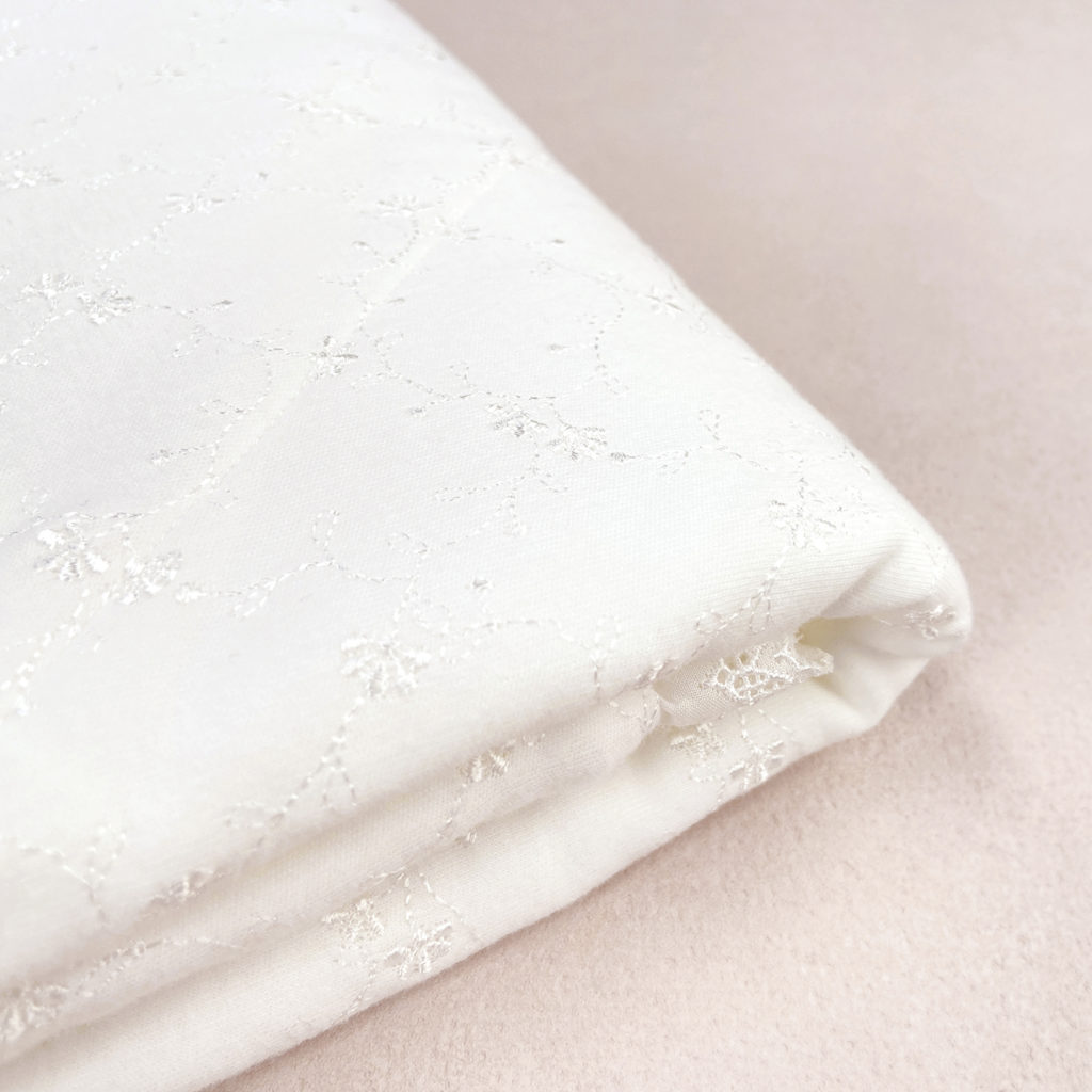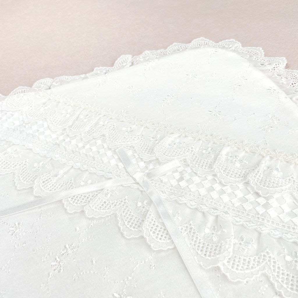 オフホワイトのスムース素材に総柄の刺繍が入った上品なアフガンです。表裏の素材は綿100%で中綿入り。レース使いのエレガントなデザインは退院にもおすすめです。お出掛けの時や普段使いにも、包んだり掛けたり敷いたり色々使える便利なアイテムです。