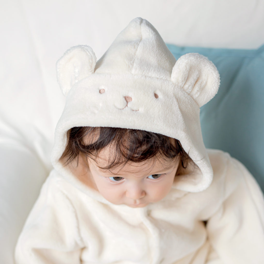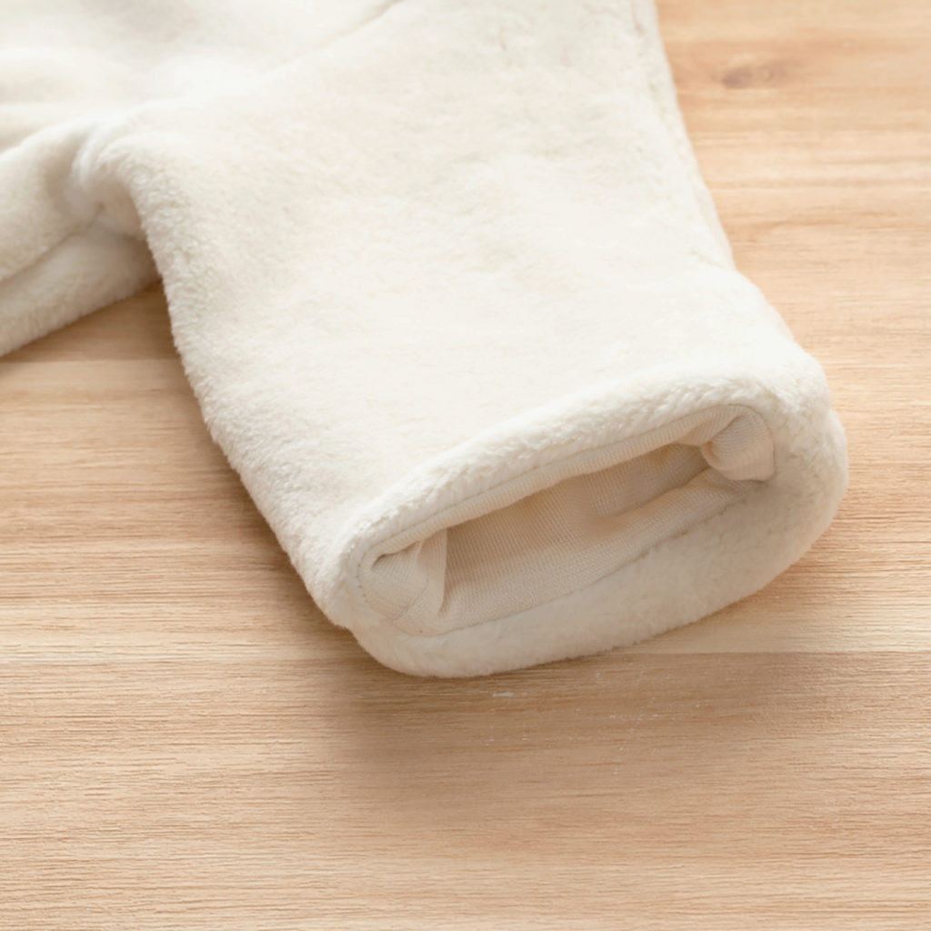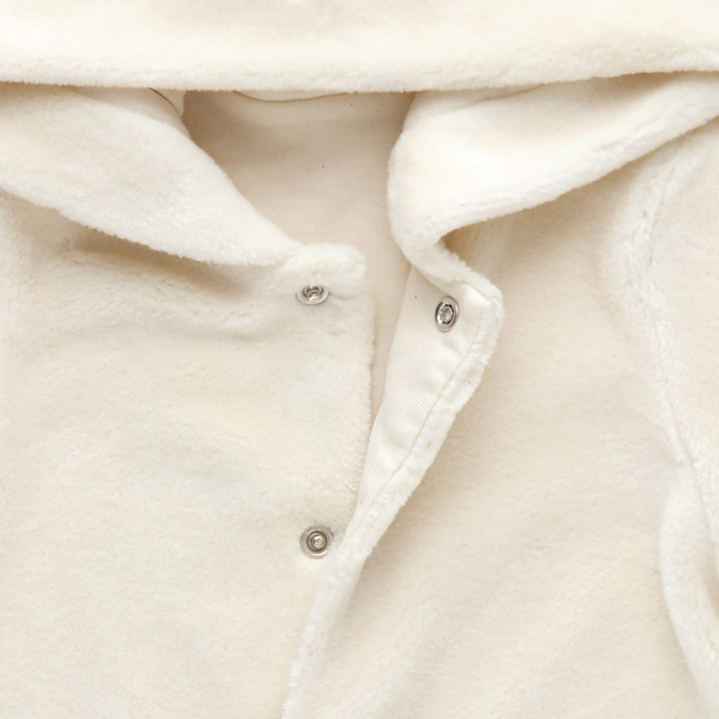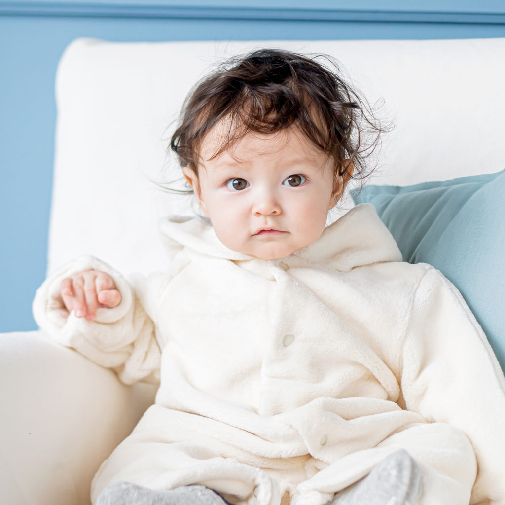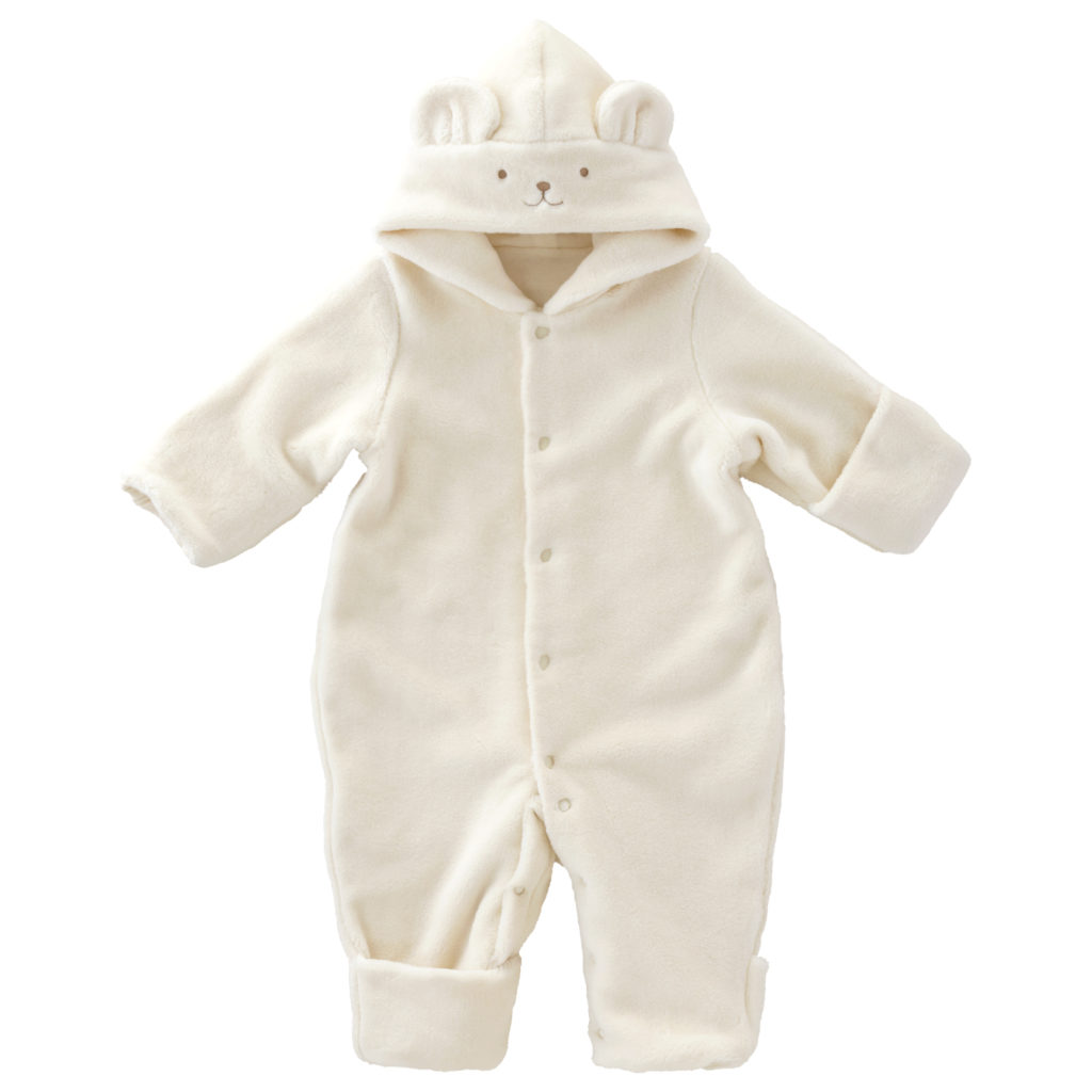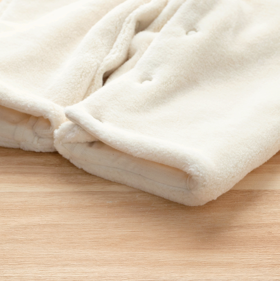 ナチュラルな風合いが魅力の環境にもやさしいオーガニックコットンを使用したおくるみです。 綿100%の肌触りのよいファー素材で冬の防寒にぴったりのアイテムです。 股下のボタンを留めかえる事で、ドレス型にもカバーオール型にもなる2WAY仕様です。