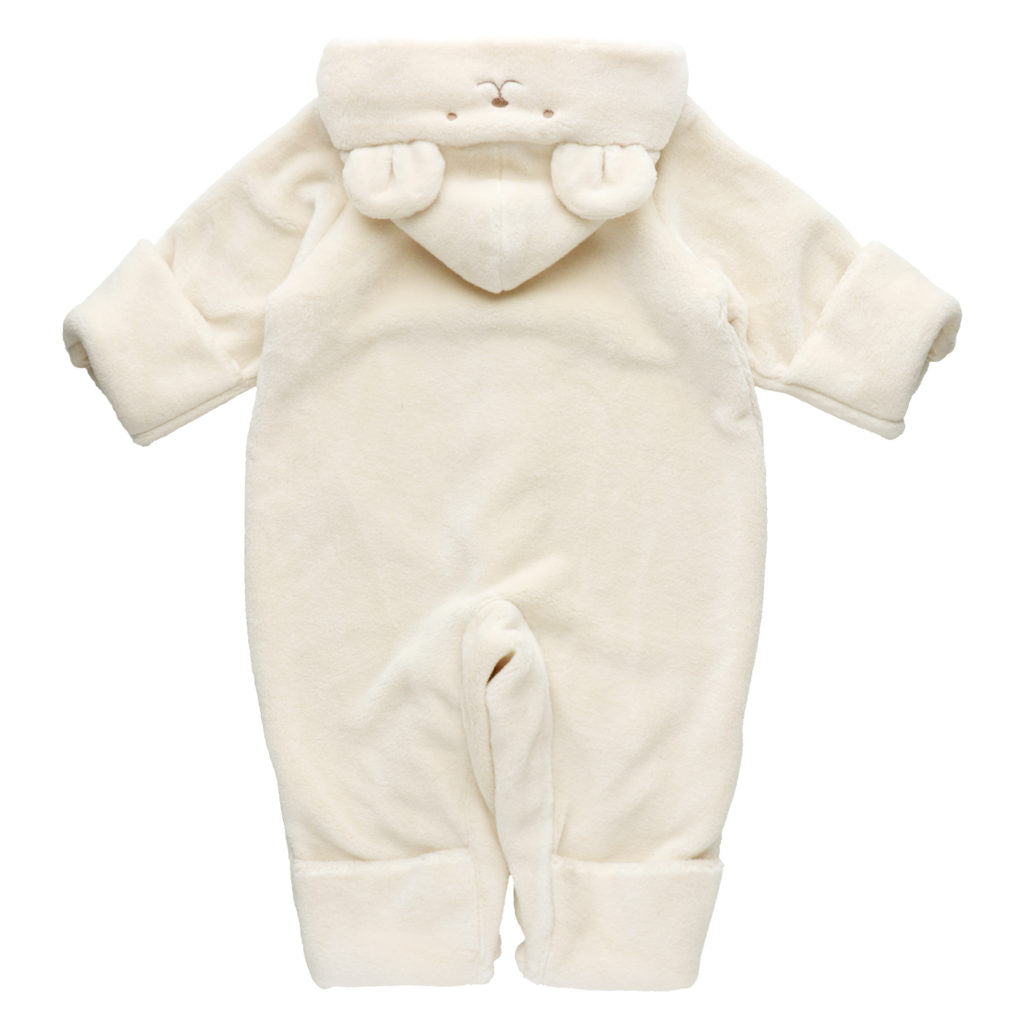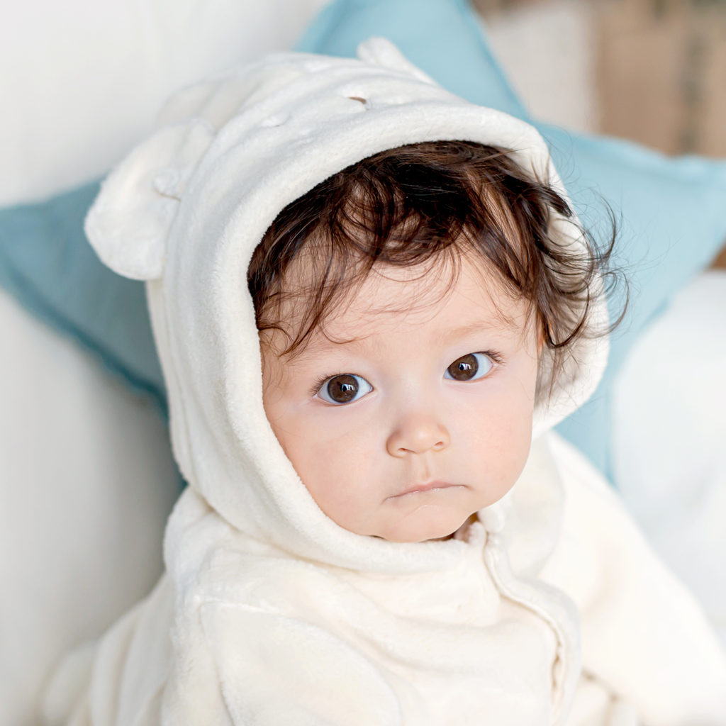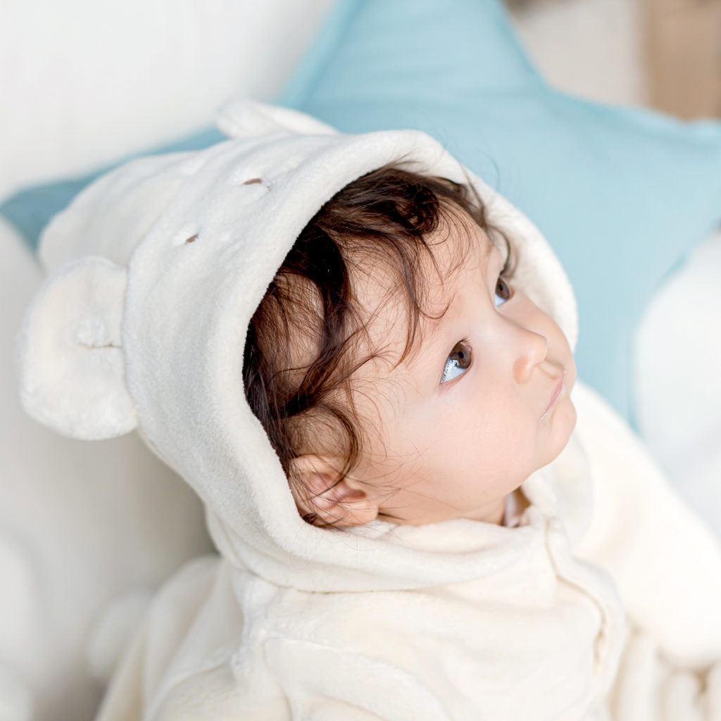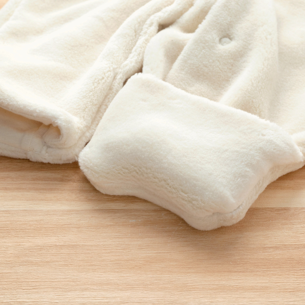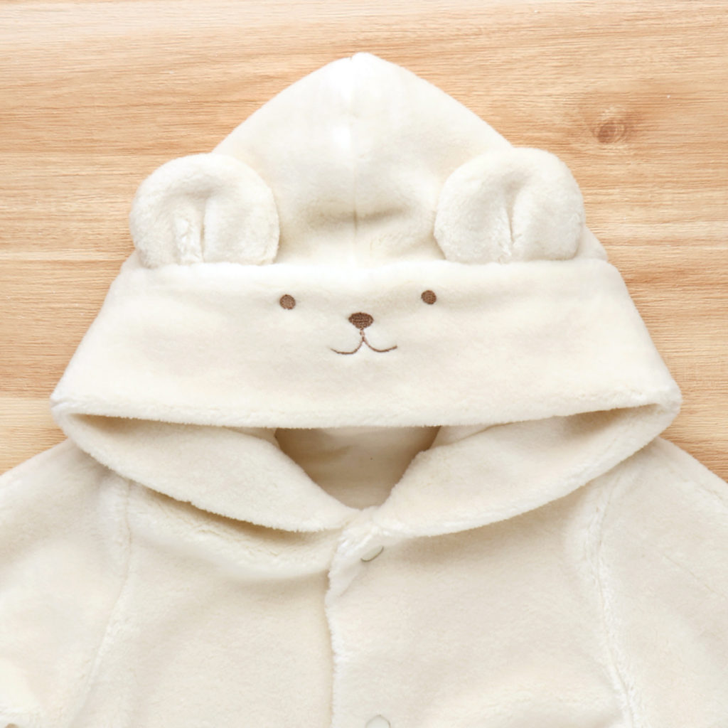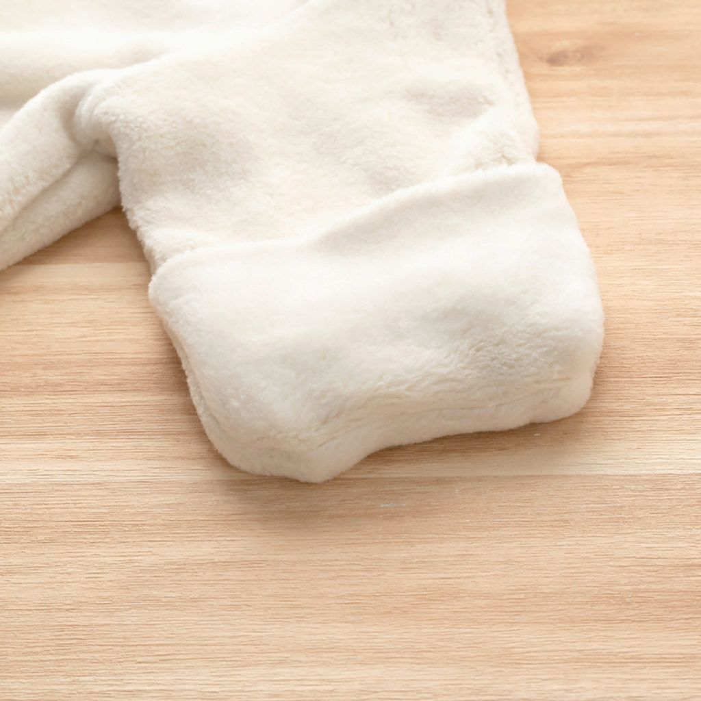 ナチュラルな風合いが魅力の環境にもやさしいオーガニックコットンを使用したおくるみです。 綿100%の肌触りのよいファー素材で冬の防寒にぴったりのアイテムです。 股下のボタンを留めかえる事で、ドレス型にもカバーオール型にもなる2WAY仕様です。