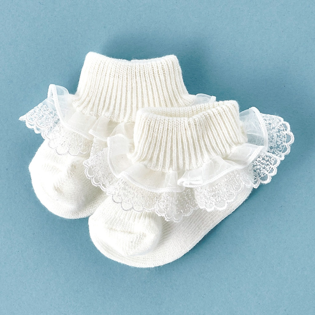 上品でかわいいレースの付いたソックスで足元を華やかにドレスアップします。エレガントなお洋服にぴったりです。伸縮性のある生地で赤ちゃんの脚をやさしく包みます。ご自宅用はもちろん、ちょっとしたプレゼントとしてもおすすめの商品です。
