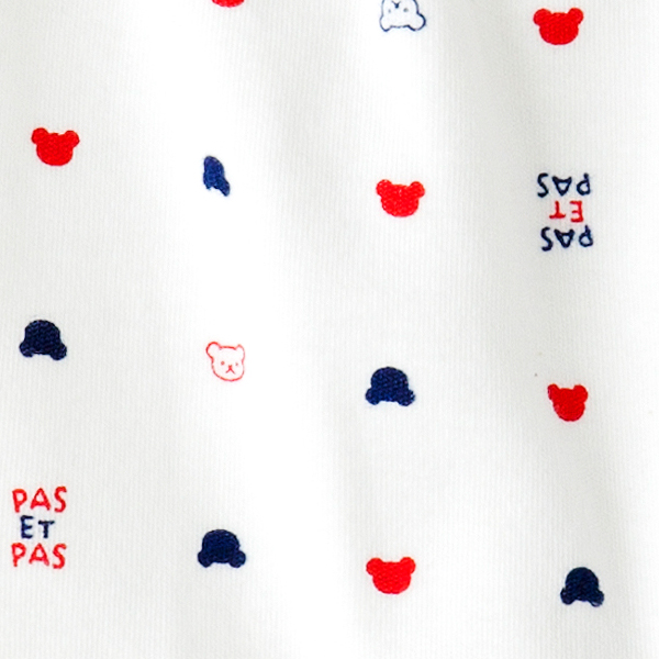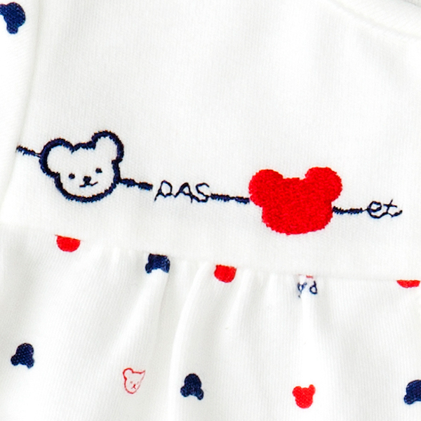 2500g未満で生まれた赤ちゃんのために開発した小さいサイズのツーウェイドレスです。赤と紺のさわやかなトリコロールカラーのくまさん柄で男女問わず着て頂けるアイテムです。 軽くて薄い編地でさらっとした肌触りが気持ちいい夏用素材です。生まれてすぐはすっぽり足を包むドレスタイプ。 足がばたばたできるようになったらボタンを留め替えてカバーオールにもなるツーウェイ仕様です。