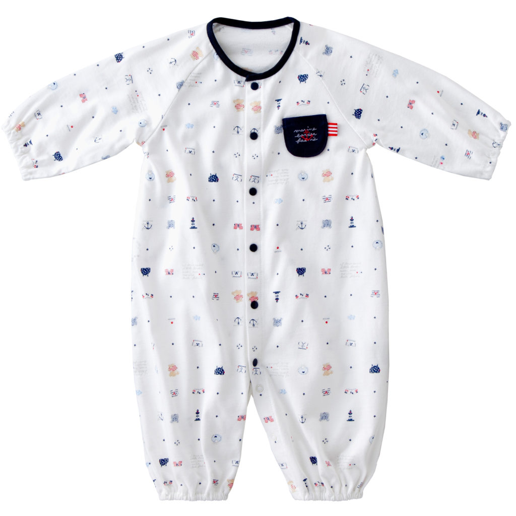 夏を感じさせる爽やかなマリン柄は、男の子にぴったり。軽くて薄い編地でさらっとした肌触りが気持ちいい天竺素材を使用した夏用ウェアです。 生まれてすぐは足を包むドレスタイプ。足をばたばた出来るようになったらボタンを留め替えて、カバーオールタイプにもなるツーウェイ仕様です。