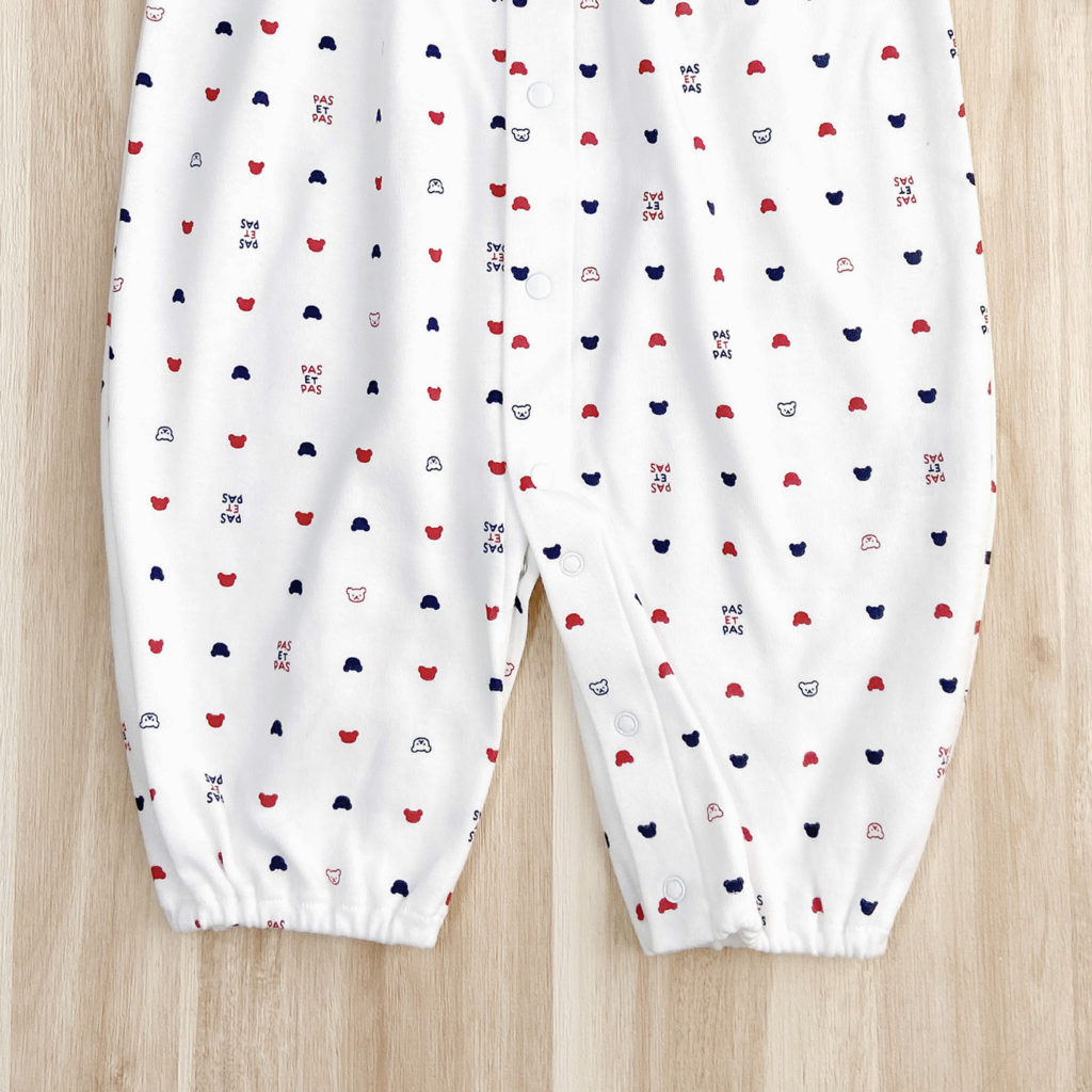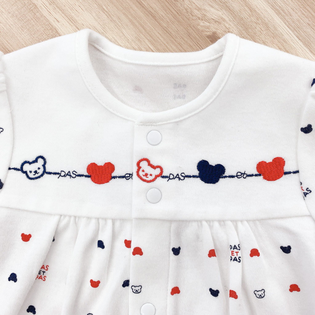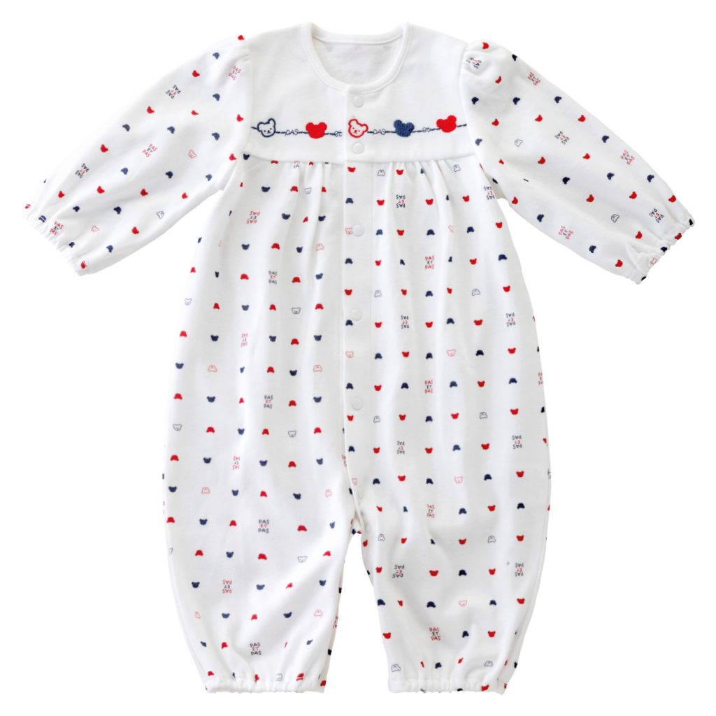赤と紺のさわやかなトリコロールカラーのくまさん柄は、男女問わずお使い頂けます。 保温性にすぐれ、冬だけでなく肌寒い春秋にも適したスムース素材です。 生まれてすぐはすっぽり足を包むドレスタイプ。 足がばたばたできるようになったらボタンを留め替えてカバーオールタイプにもなるツーウェイ仕様です。