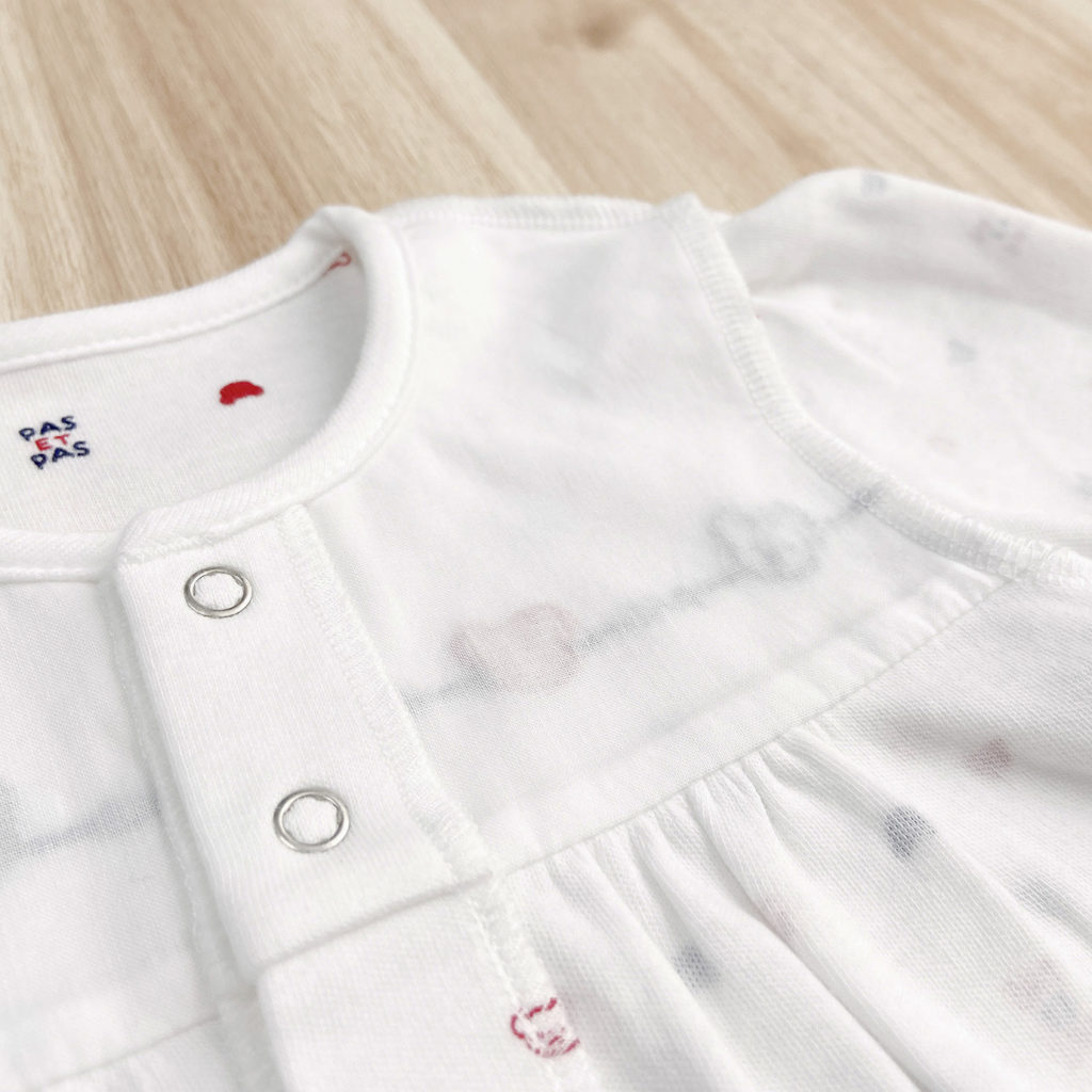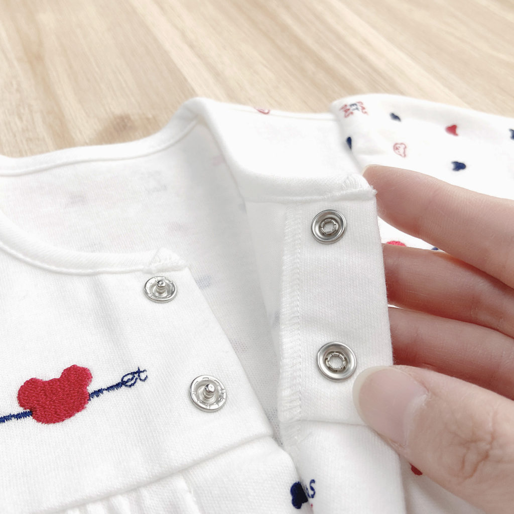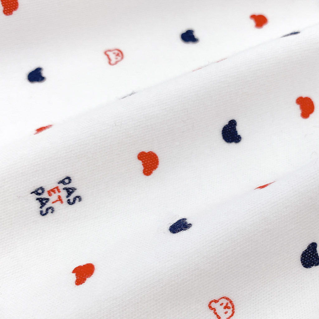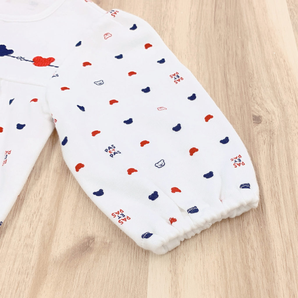 赤と紺のさわやかなトリコロールカラーのくまさん柄は、男女問わずお使い頂けます。 保温性にすぐれ、冬だけでなく肌寒い春秋にも適したスムース素材です。 生まれてすぐはすっぽり足を包むドレスタイプ。 足がばたばたできるようになったらボタンを留め替えてカバーオールタイプにもなるツーウェイ仕様です。