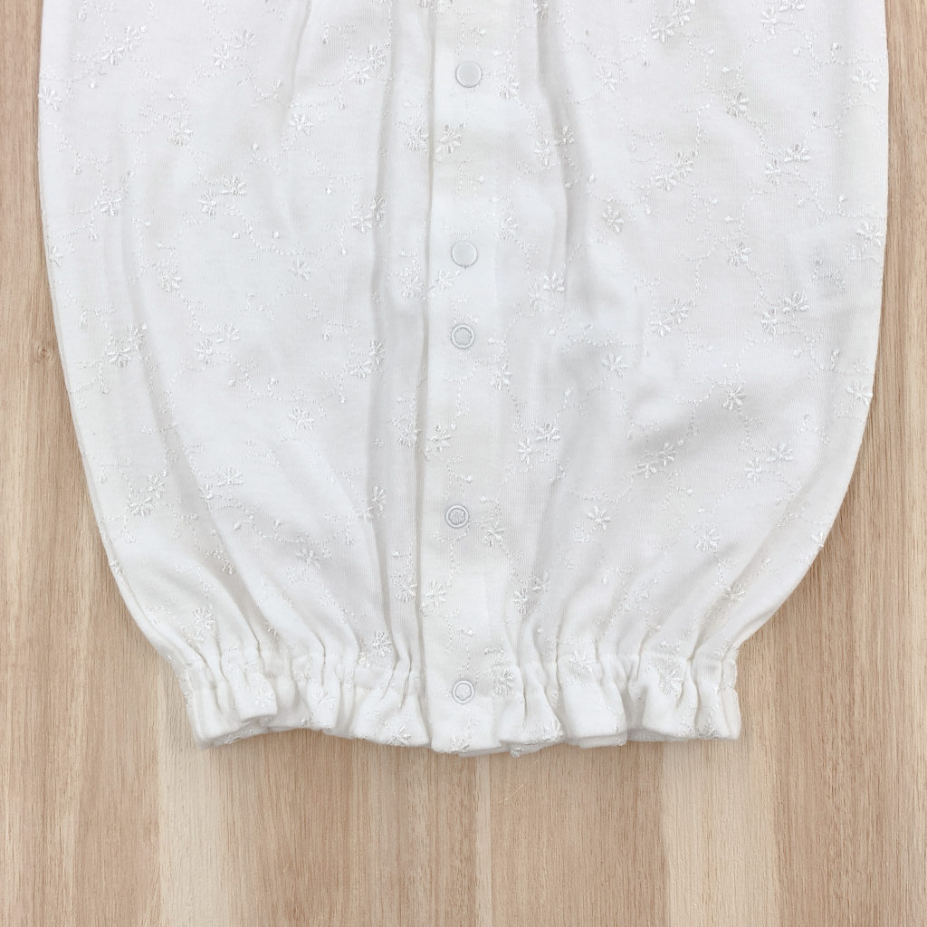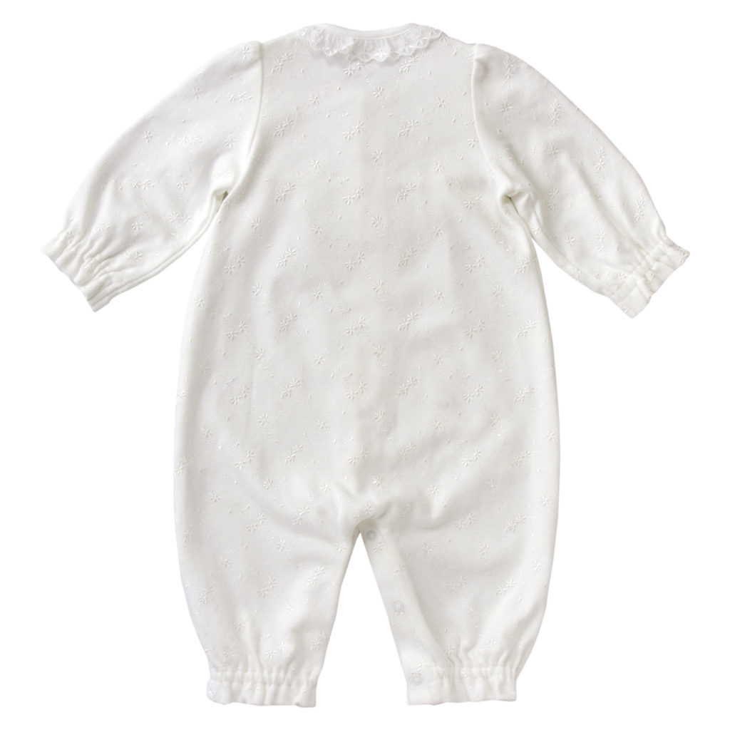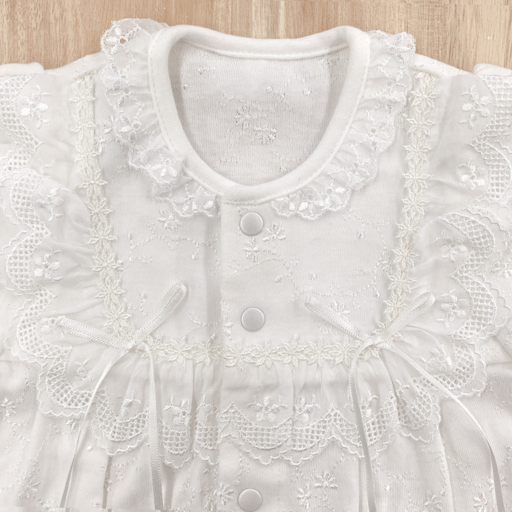 繊細な刺繍が全体に入った生地に美しいレースのフリルが付いた豪華なドレスです。肌触りの良いスムース素材で、秋から春先まで活躍します。 生まれてすぐは足を包むドレスタイプ。足をばたばた出来るようになったらボタンを留め替えて、カバーオールタイプにもなるツーウェイ仕様です。胸元の美しいデザインは写真映えも良く、イベント事やお披露目にも最適です。出産準備はもちろん、ギフトにもおすすめです。