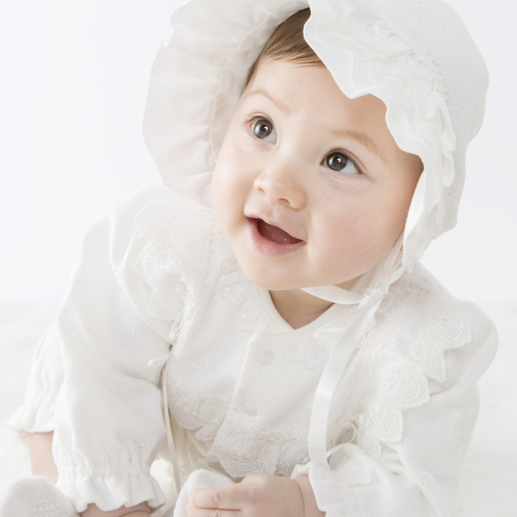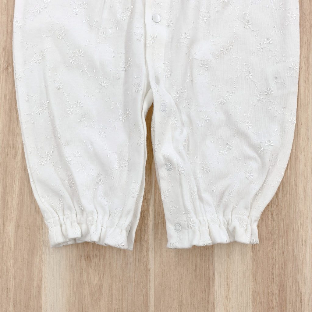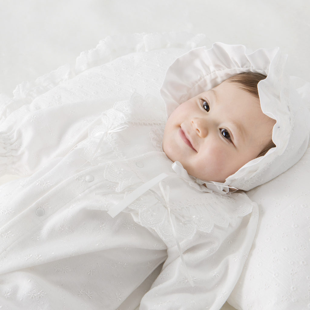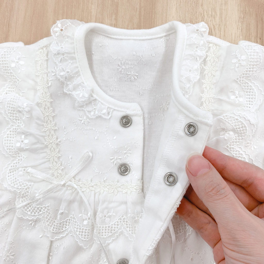 繊細な刺繍が全体に入った生地に美しいレースのフリルが付いた豪華なドレスです。肌触りの良いスムース素材で、秋から春先まで活躍します。 生まれてすぐは足を包むドレスタイプ。足をばたばた出来るようになったらボタンを留め替えて、カバーオールタイプにもなるツーウェイ仕様です。胸元の美しいデザインは写真映えも良く、イベント事やお披露目にも最適です。出産準備はもちろん、ギフトにもおすすめです。