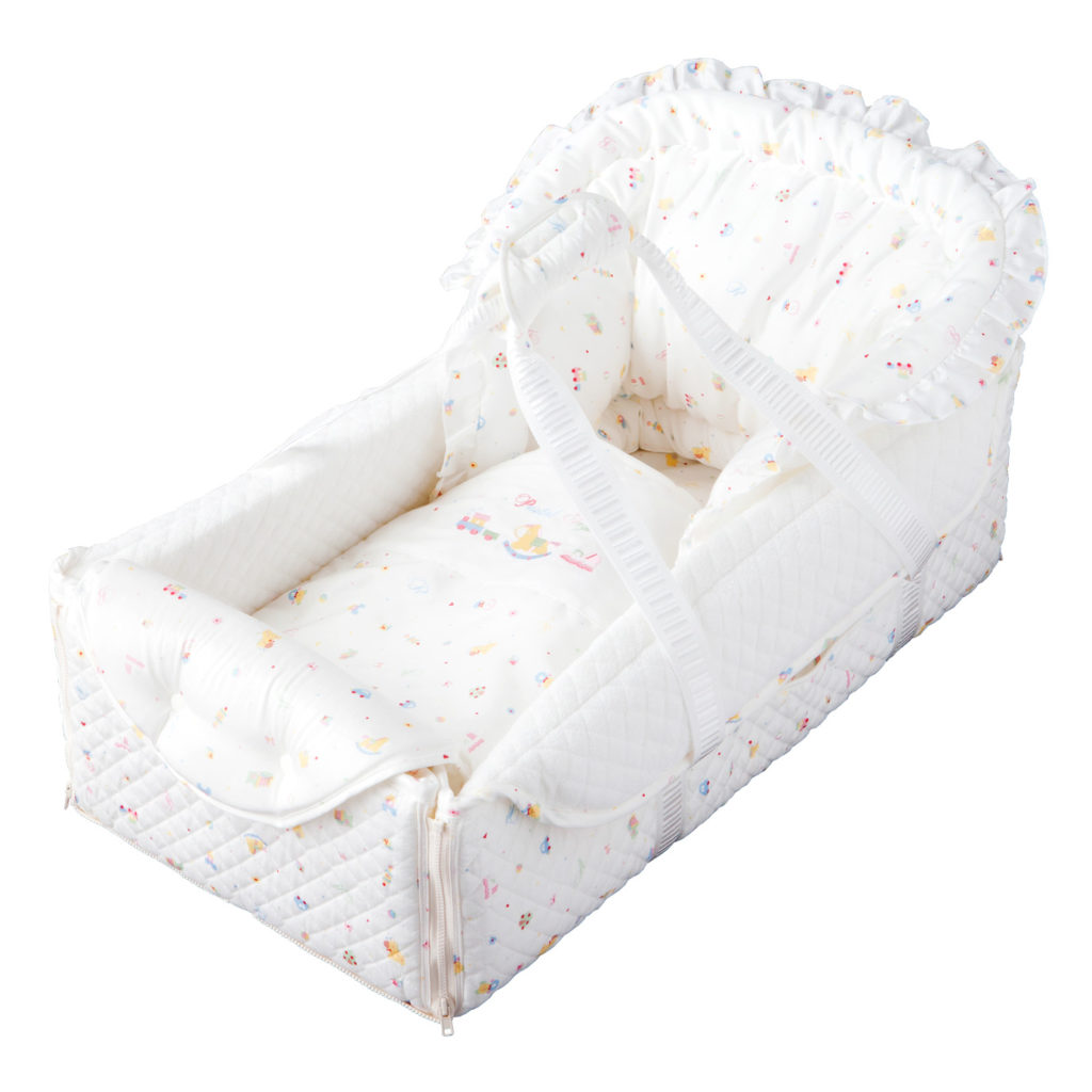 折りたためばバッグになるので持ち運びもらくらく。わた入りのやわらかい素材なので赤ちゃんも心地よく、丸ごと手洗いもできるので清潔で安心です。