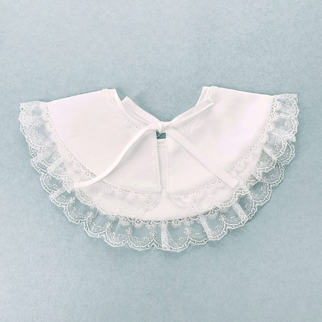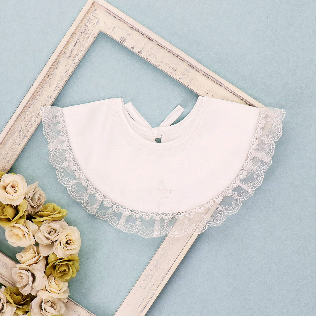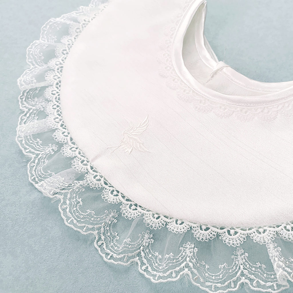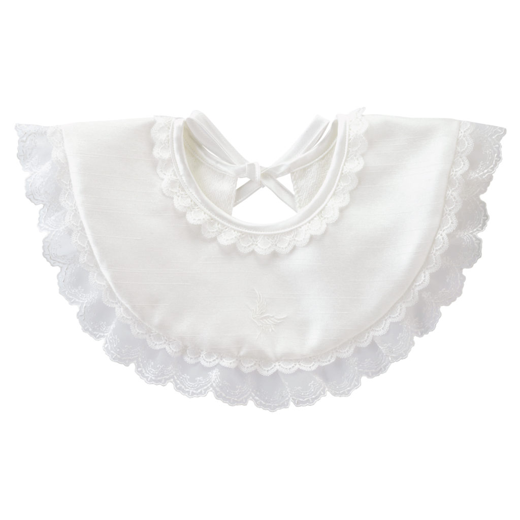 エレガントで繊細な刺繍が施されたスタイ。 裏面には防水パイルを使用しているので、赤ちゃんのよだれが洋服に染みるのを防ぎます。 お宮参りの時などに、ぜひご一緒にお使いください。プレゼントにも喜ばれる人気アイテムです。