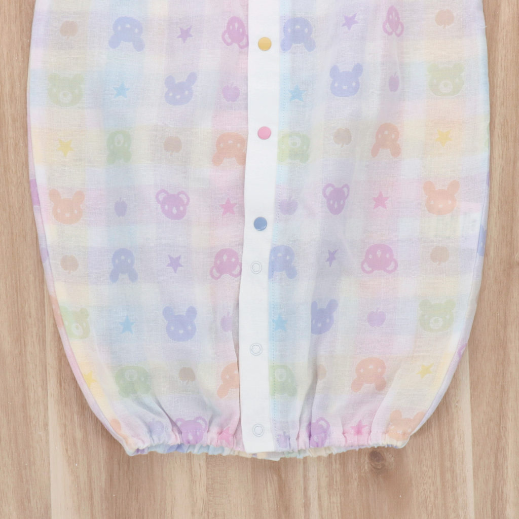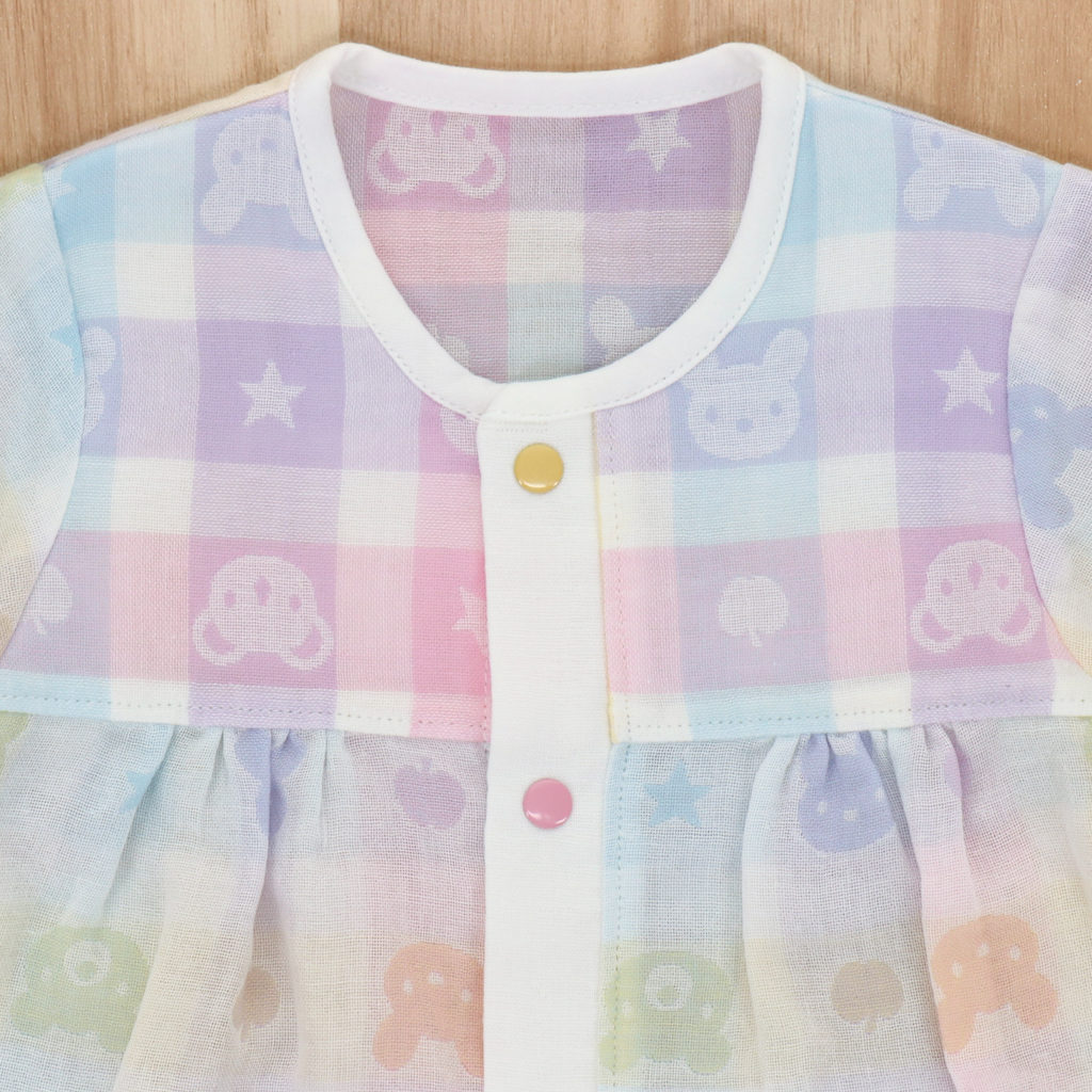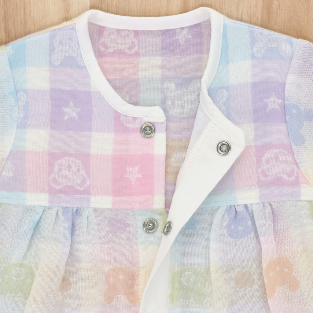 パステルカラーのチェックとどうぶつ柄がかわいいドレスです。さらっとした肌触りが気持ちいいガーゼ素材は春から秋まで活躍してくれます。