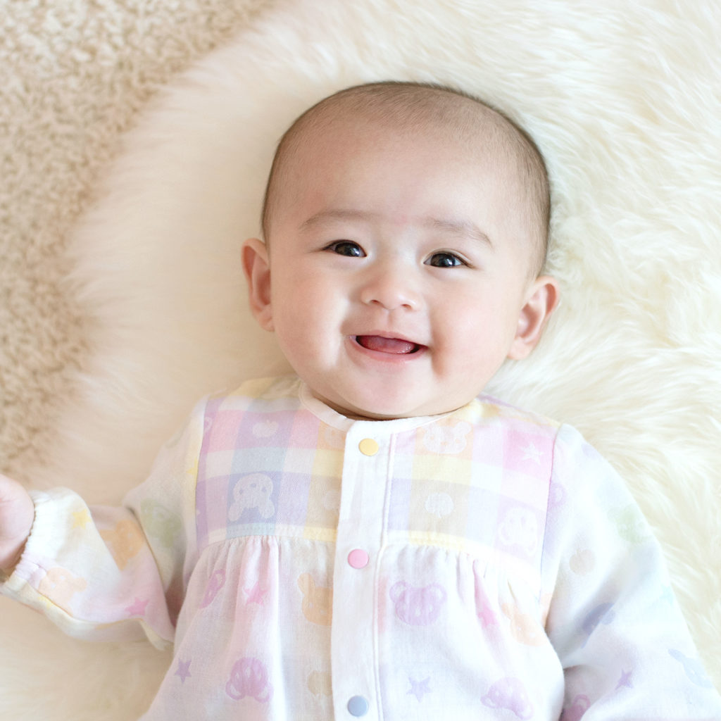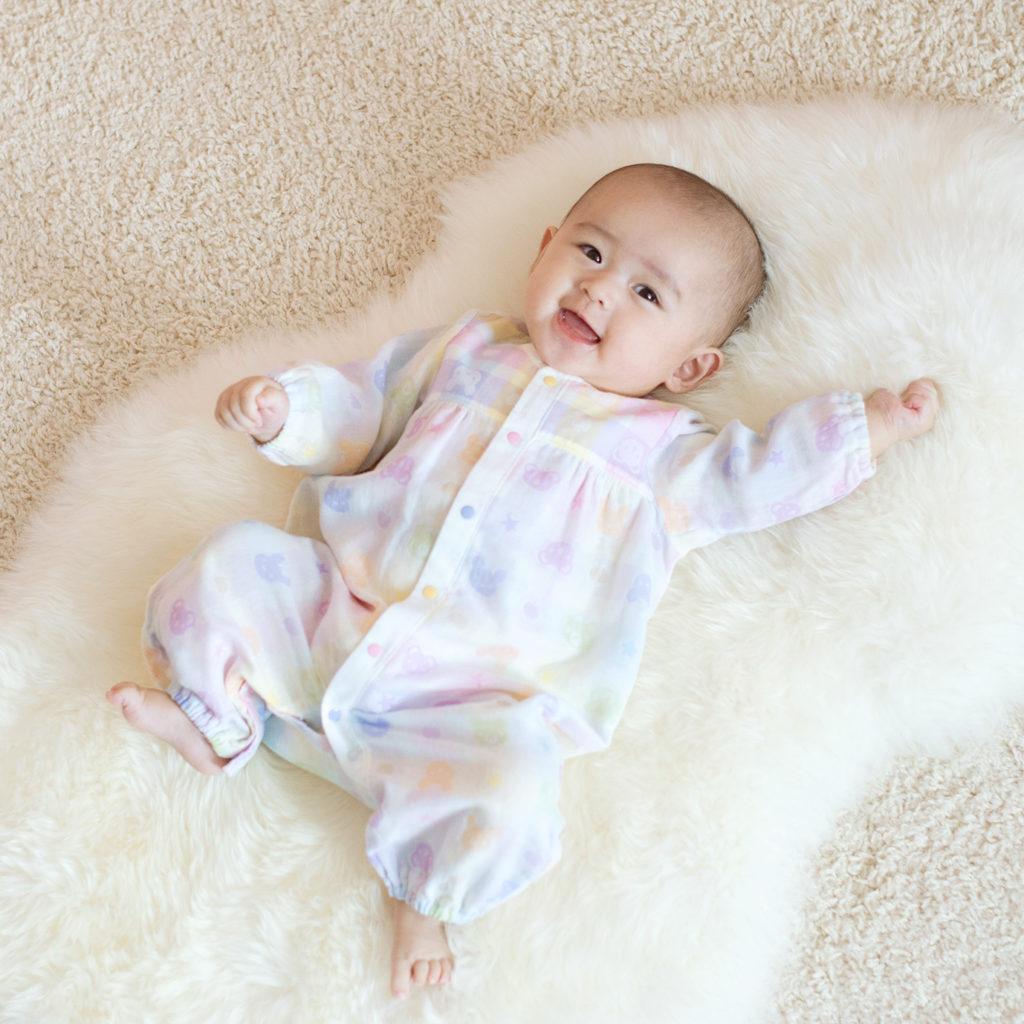生まれてすぐは足を包むドレスタイプ。足をばたばた出来るようになったらボタンを留め替えて、カバーオールタイプにもなるツーウェイ仕様です。