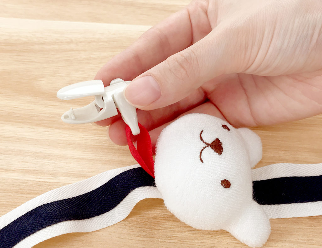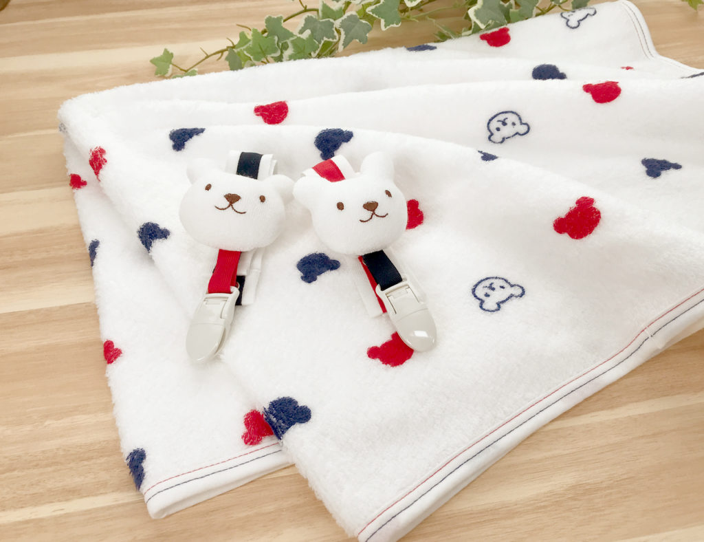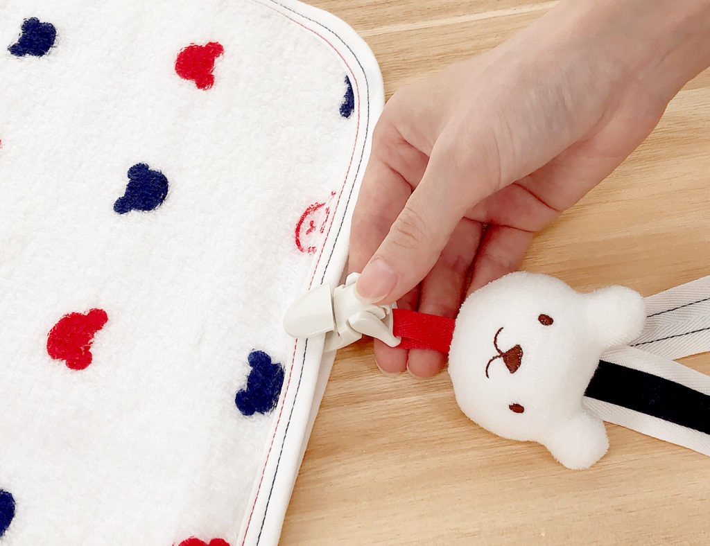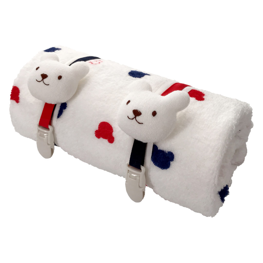 ケットはふわふわでやわらかい肌ざわりの無撚糸タオル。吸湿性・吸水性に優れている素材です。 クリップベルトには鈴入りの可愛いくまさん付いていており、ケットがずり落ちないようにベビーカーやカーシートに取り付けることができます。