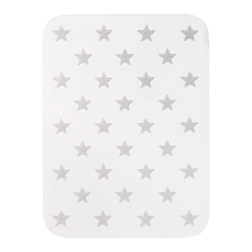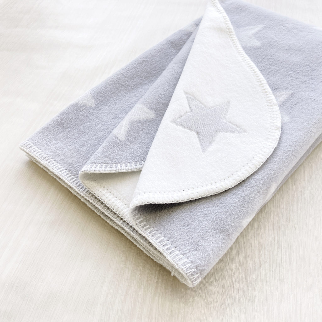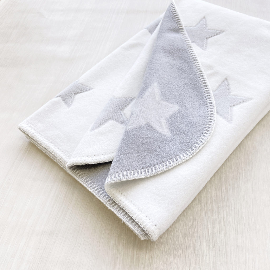 モノトーンの星柄の綿毛布は周囲のブランケットステッチがかわいいデザインです。 男女問わずお使いいただけるデザインで出産準備や贈りものにもおすすめです。