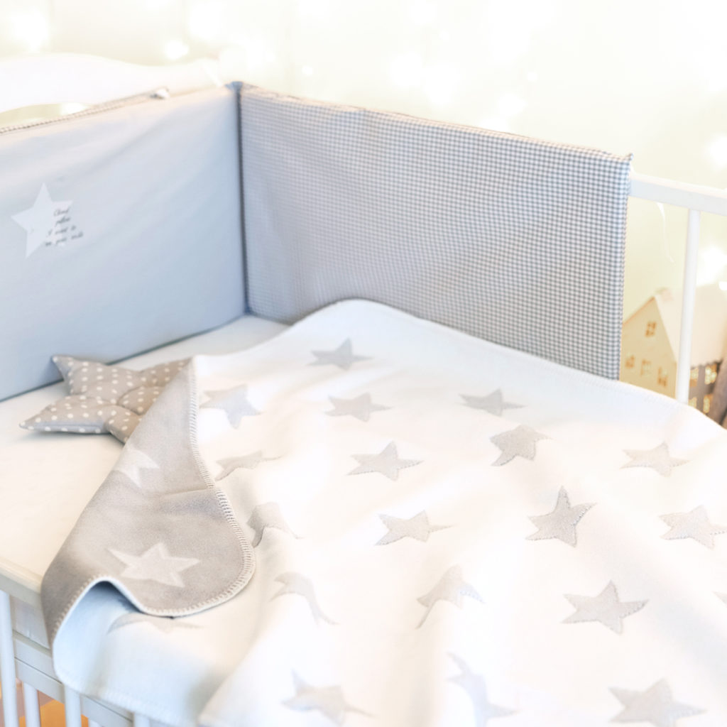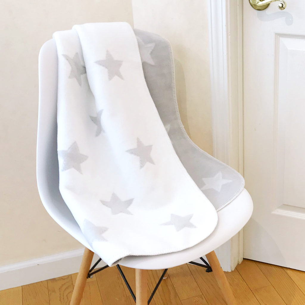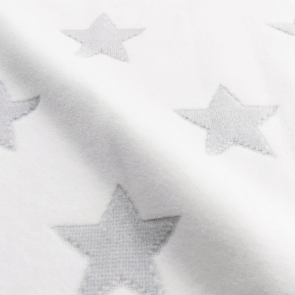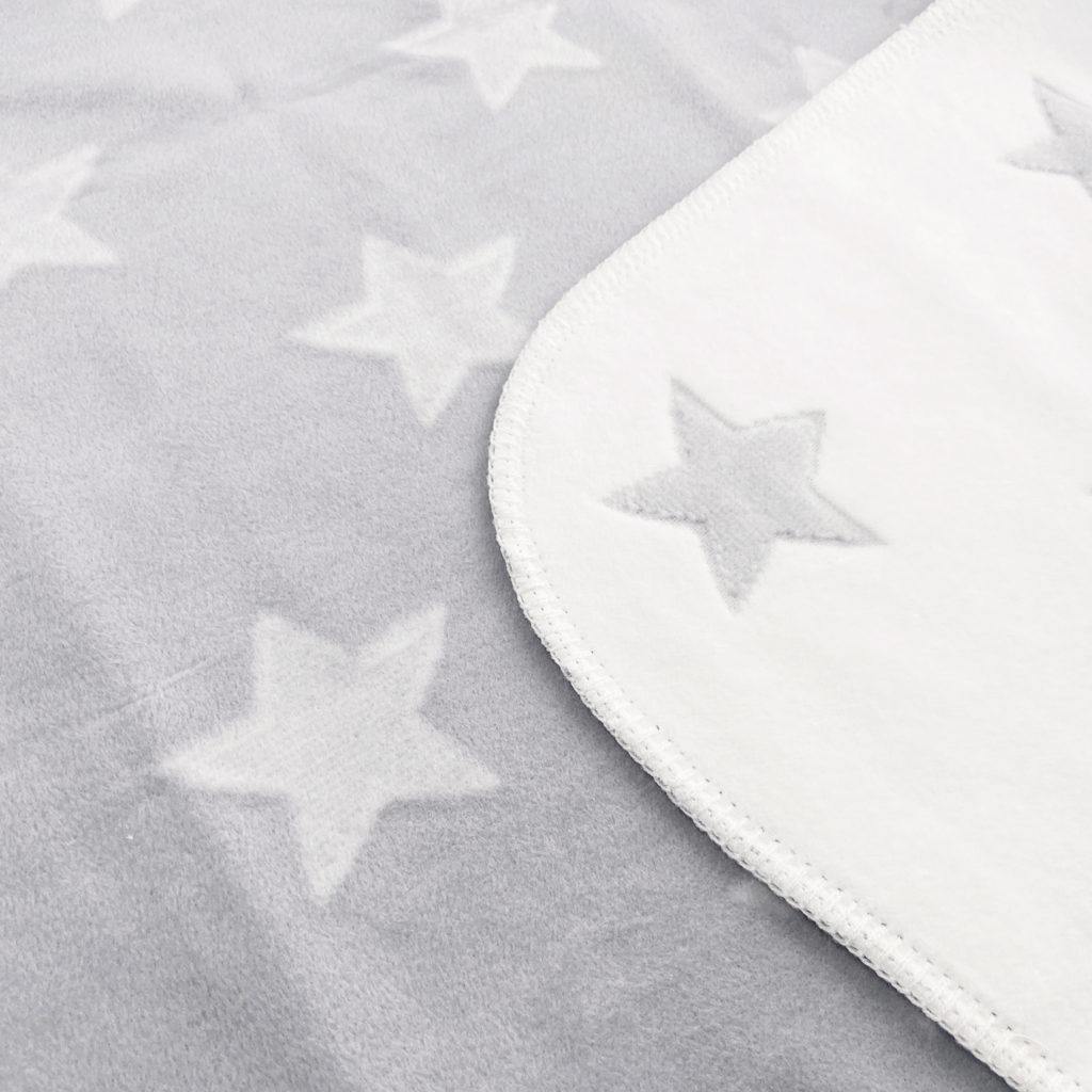 モノトーンの星柄の綿毛布は周囲のブランケットステッチがかわいいデザインです。 男女問わずお使いいただけるデザインで出産準備や贈りものにもおすすめです。