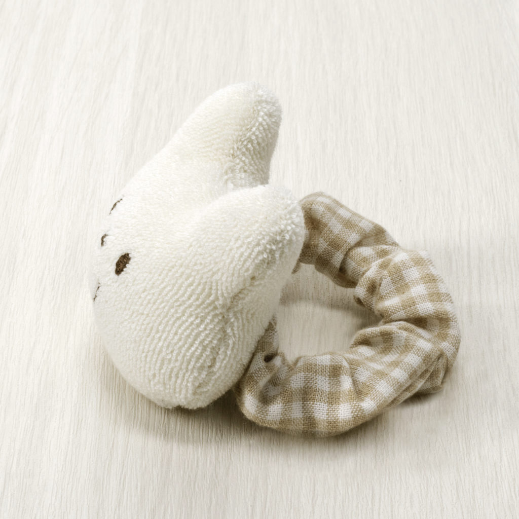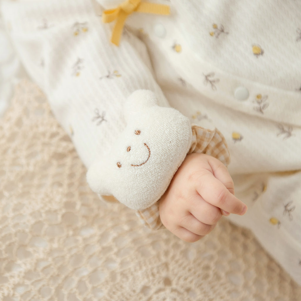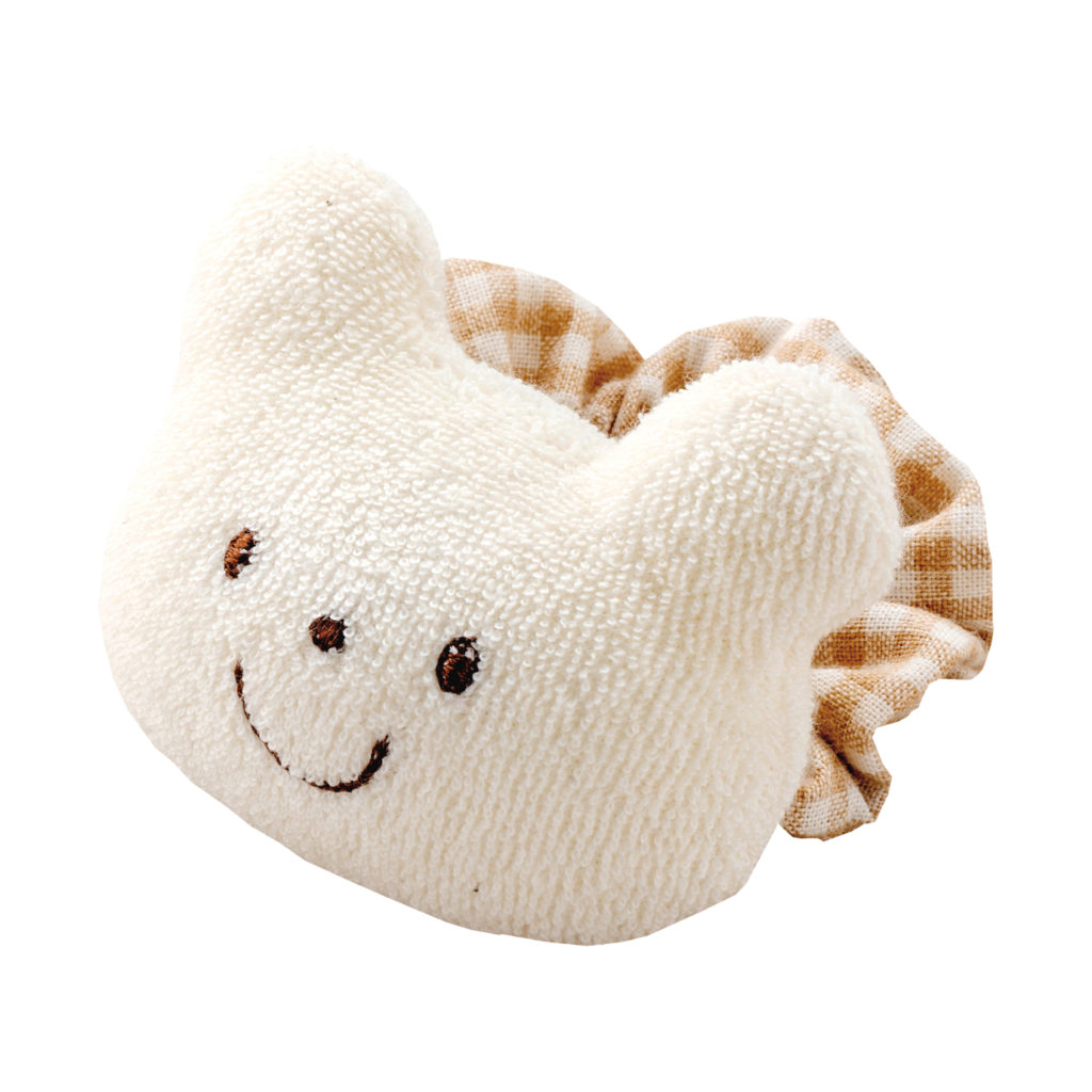 手首につけたり、にぎって鳴らしたりできるオーガニックコットンを使用したガラガラです。 まだおもちゃが握れない赤ちゃんでも、手首や足首つけて振ると鈴の音がなり遊べます。 赤ちゃんの視覚・聴覚・触覚などの発達を助け、なめても安全な布製のおもちゃです。