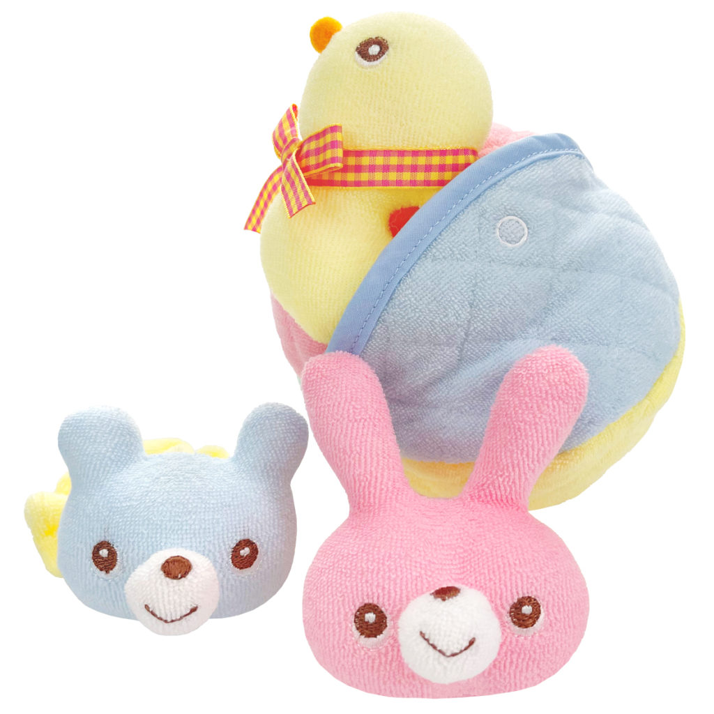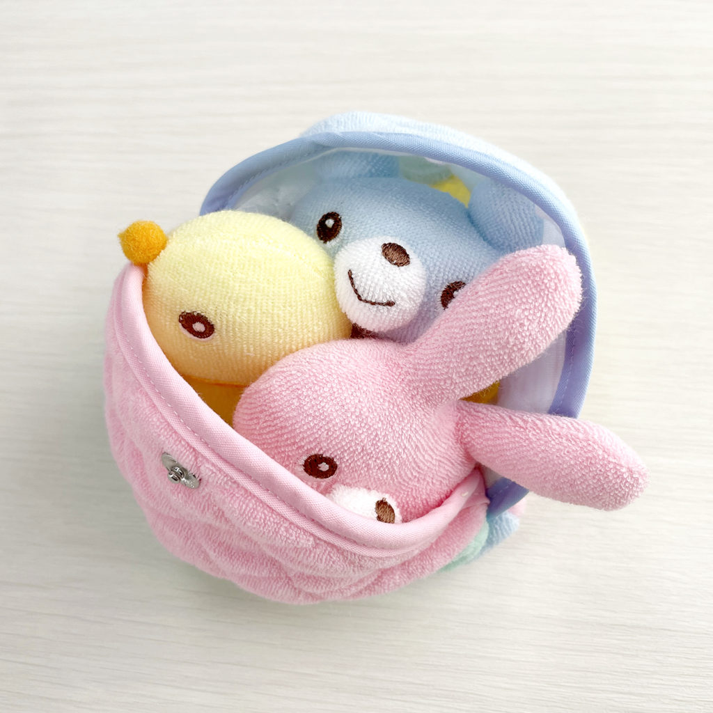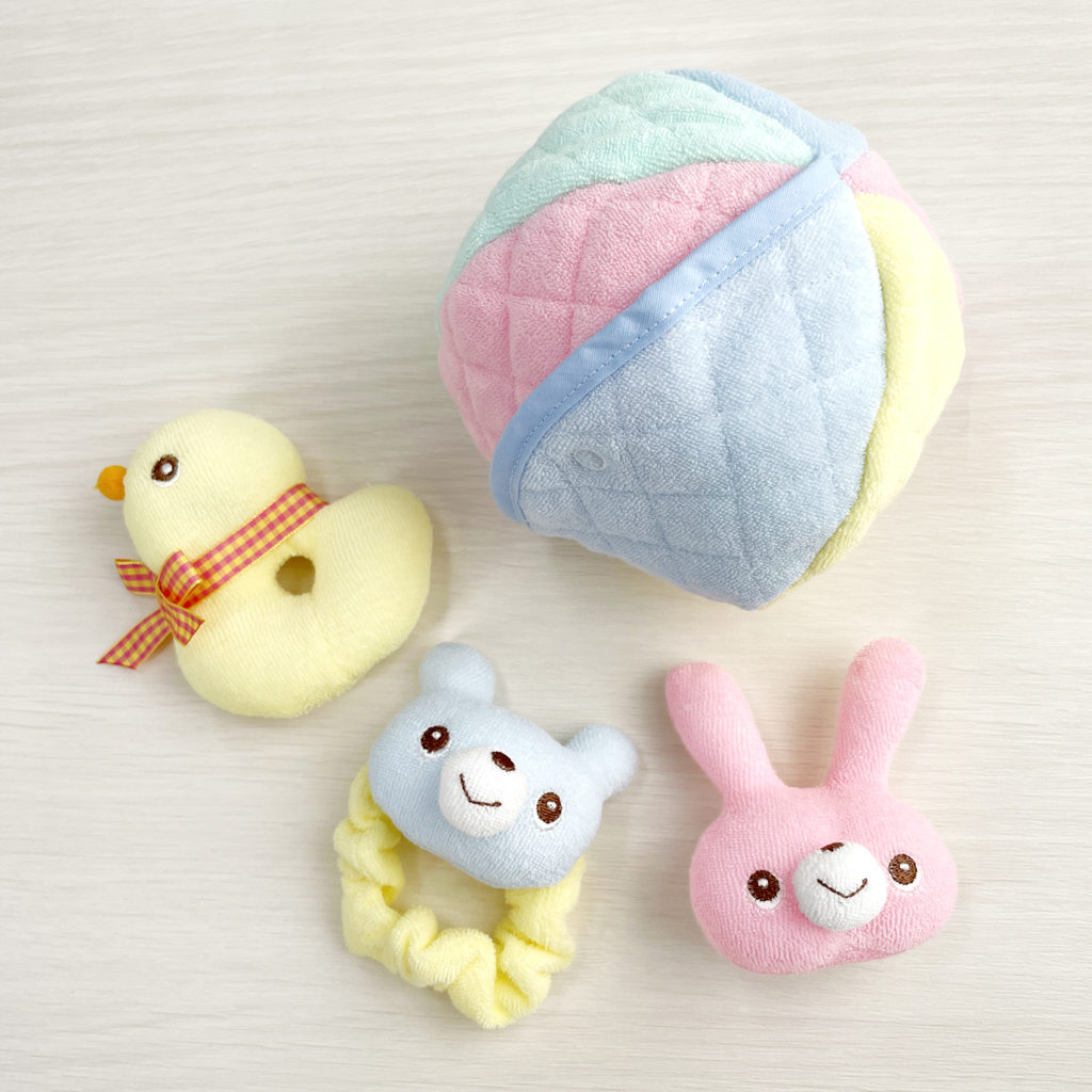 赤ちゃんの視覚、聴覚、触覚などの発達を助け、なめても安全な布オモチャです。ガラガラ3つを袋に入れるとボールになります。お洗濯は軽く手洗いをして、よく乾燥をさせてください。