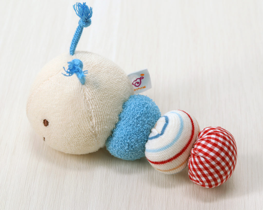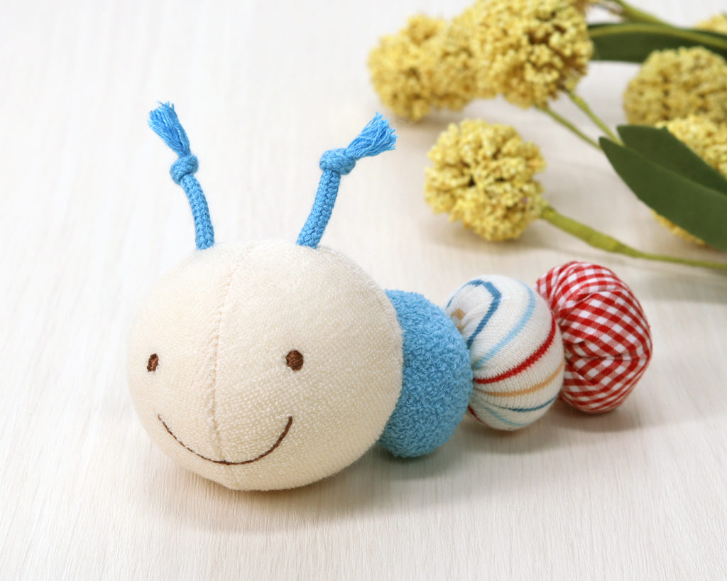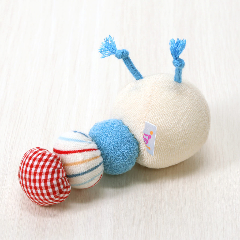 カラフルな色と鈴の音、やわらかい触り心地のいもむしがユニークなおもちゃです。赤ちゃんがなめても安全な布製です。お洗濯は軽く手洗いをして、よく乾燥をさせてください。
