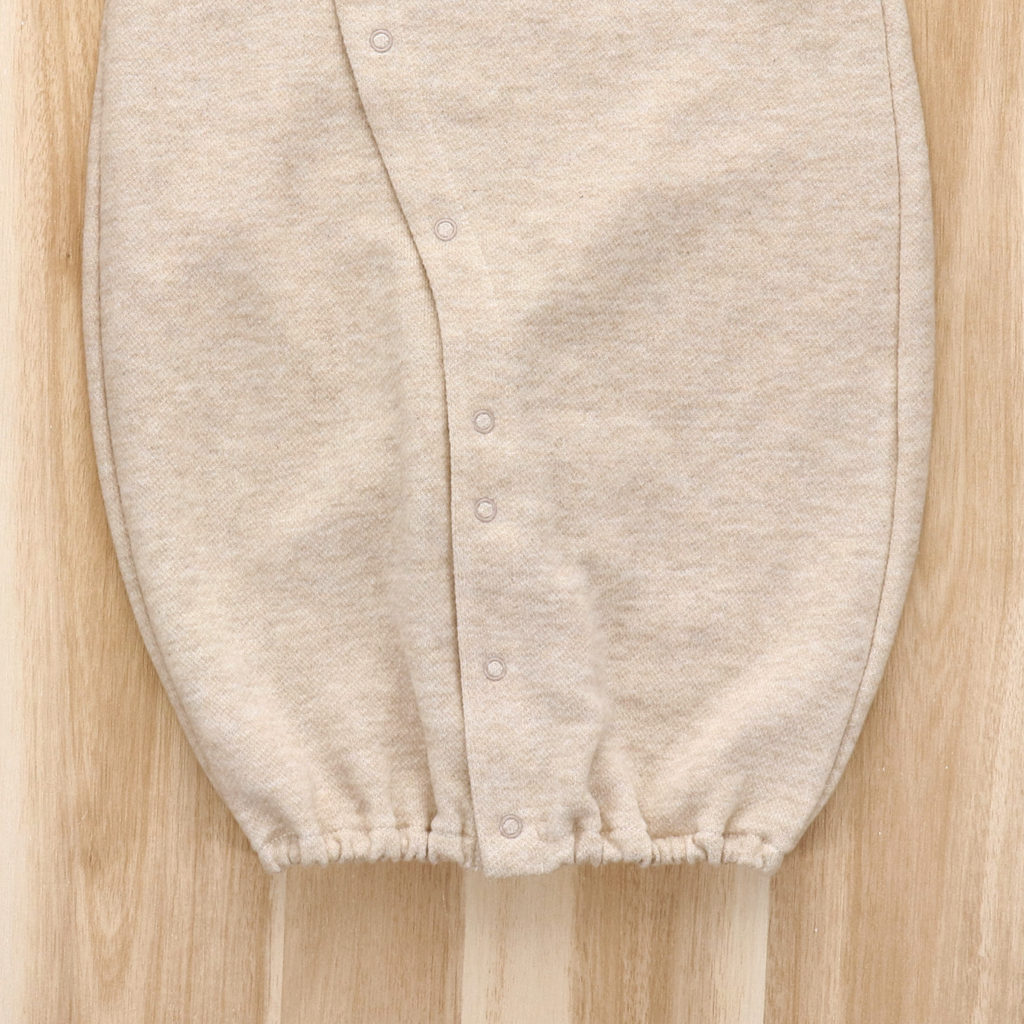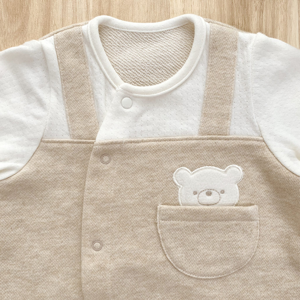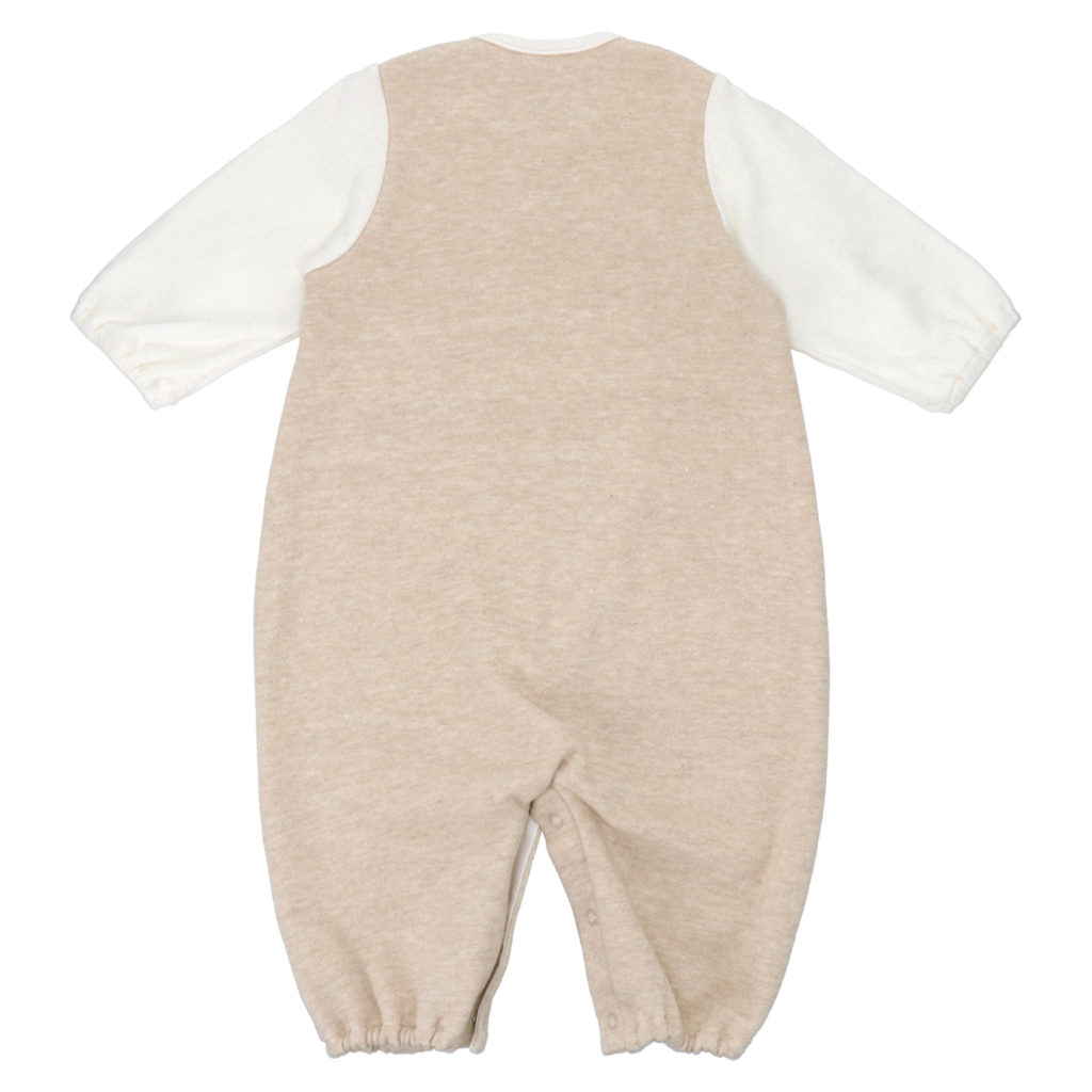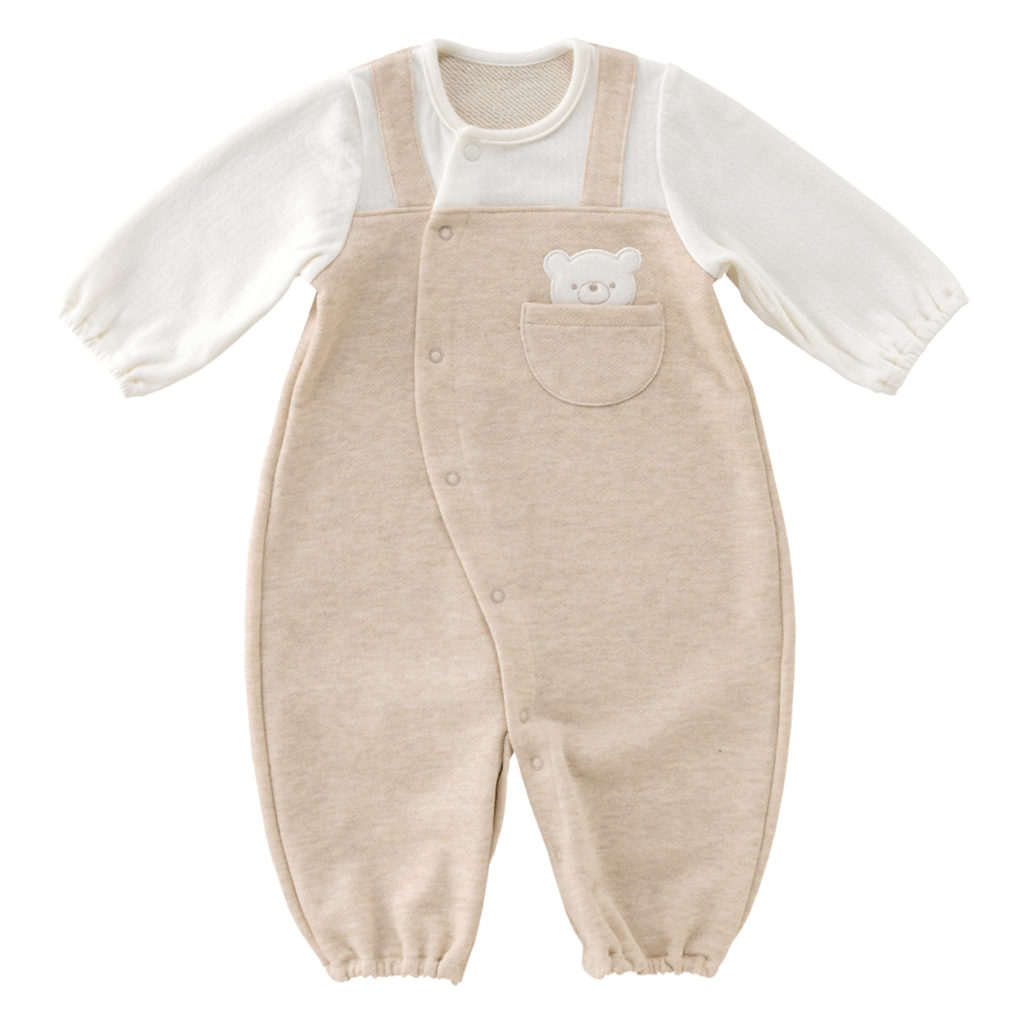 胸元のポケットから小さなくまさんがぴょこっと顔を出してごあいさつ。ほどよい生地厚と保温性のある裏毛素材で、秋から春先まで活躍します。 生まれてすぐはすっぽり足を包むドレスタイプ。 足がばたばたできるようになったらボタンを留め替えてカバーオールタイプにもなるツーウェイ仕様です。