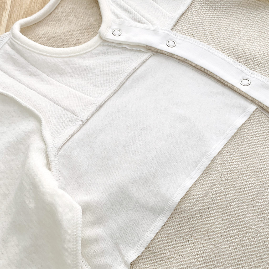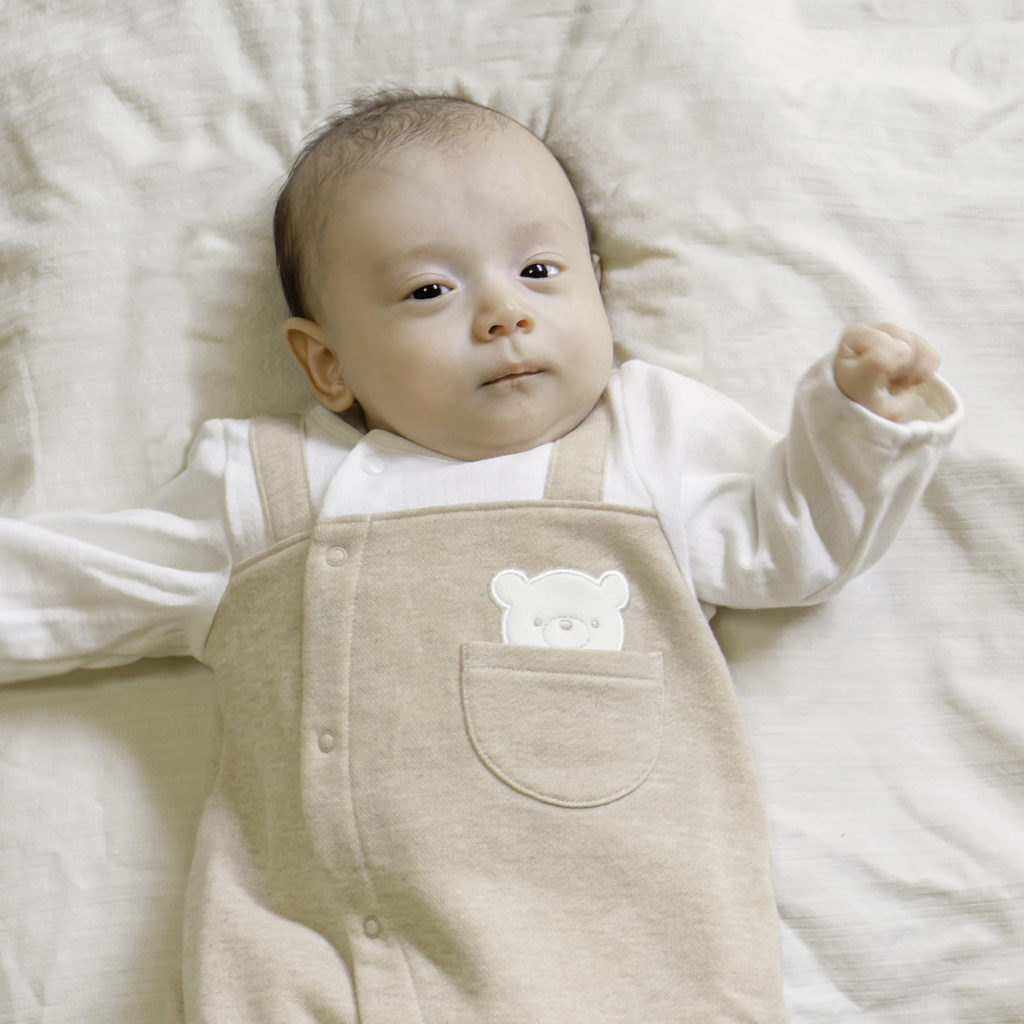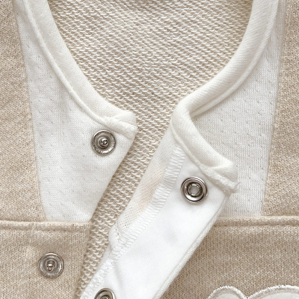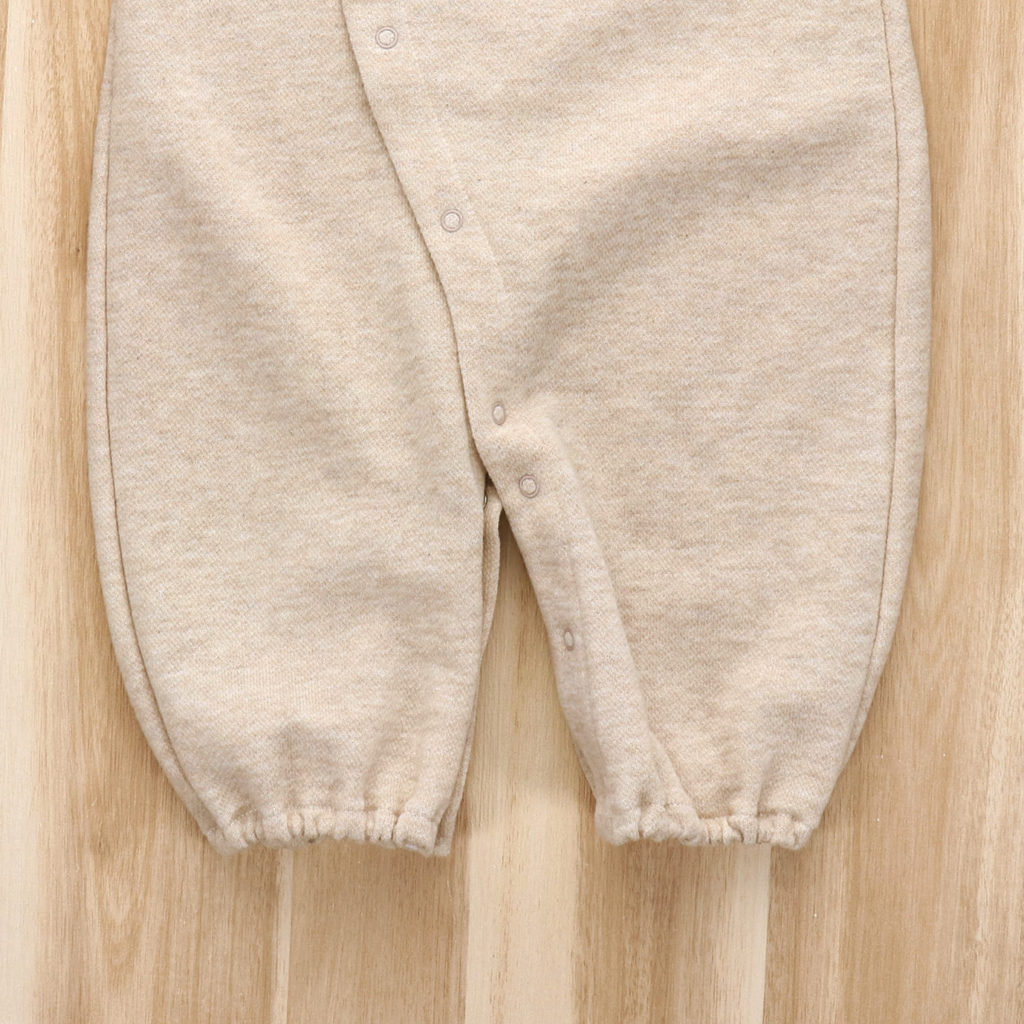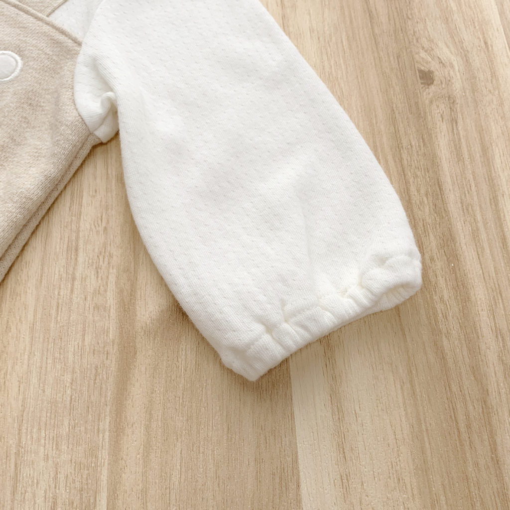 胸元のポケットから小さなくまさんがぴょこっと顔を出してごあいさつ。ほどよい生地厚と保温性のある裏毛素材で、秋から春先まで活躍します。 生まれてすぐはすっぽり足を包むドレスタイプ。 足がばたばたできるようになったらボタンを留め替えてカバーオールタイプにもなるツーウェイ仕様です。