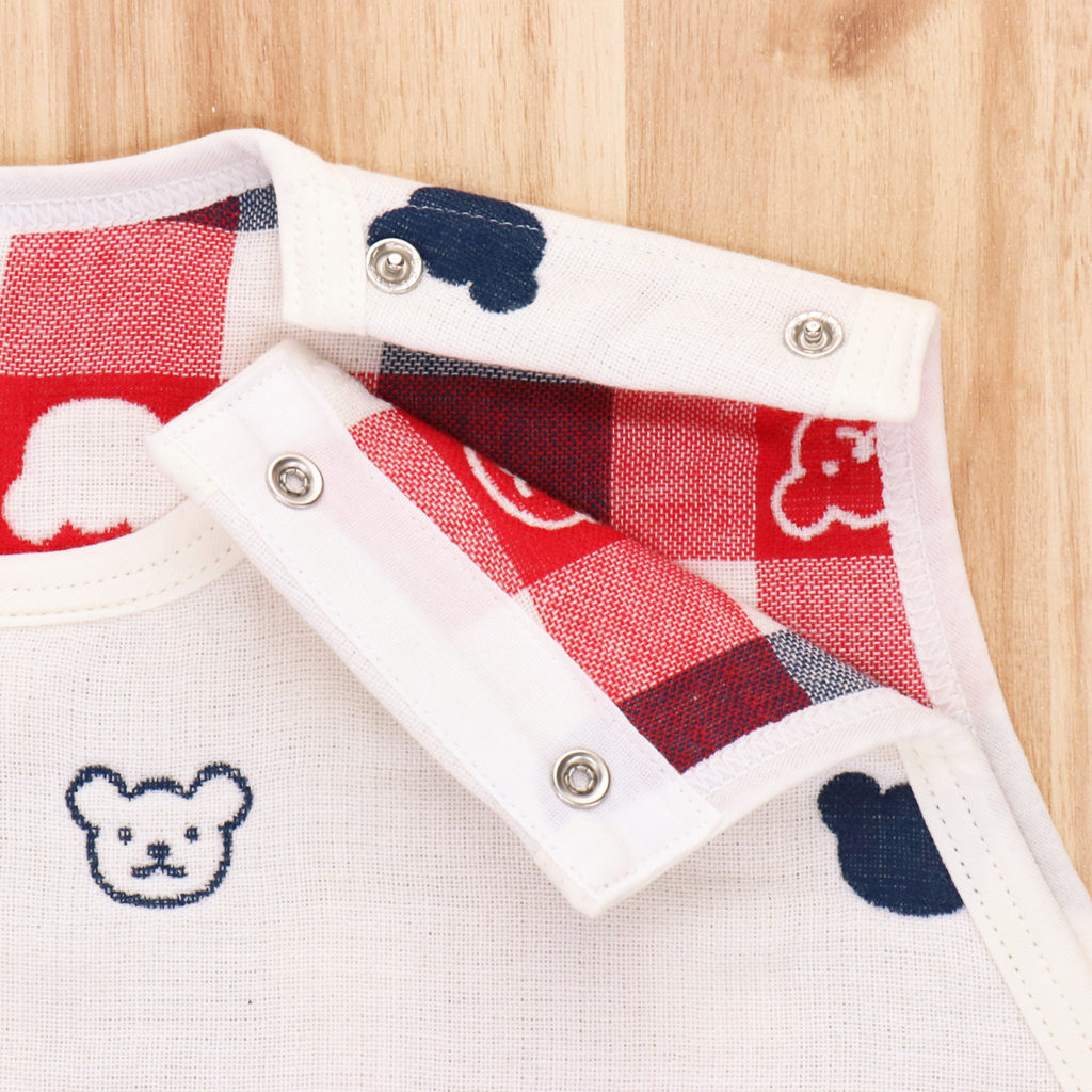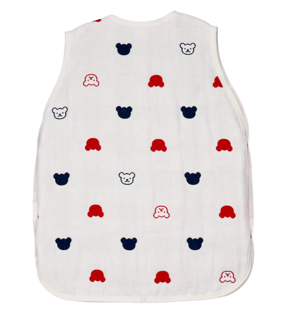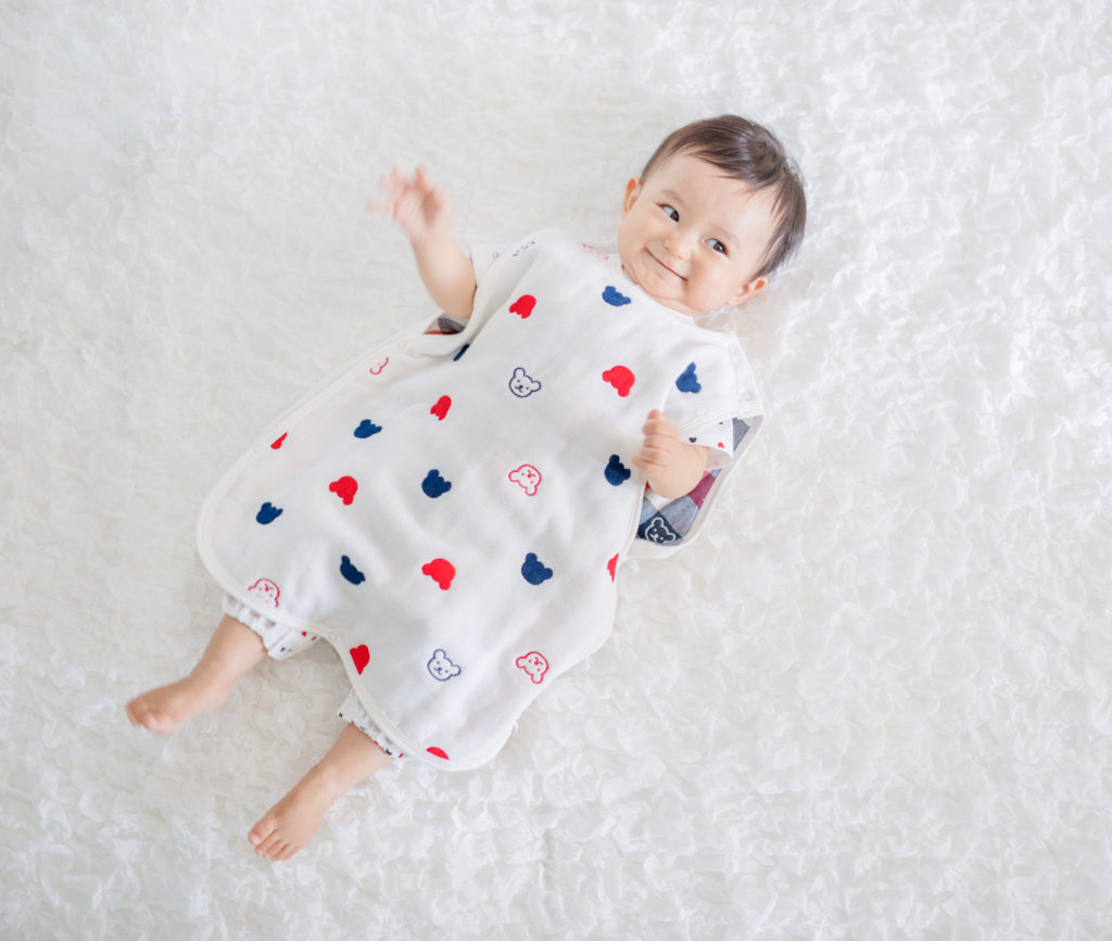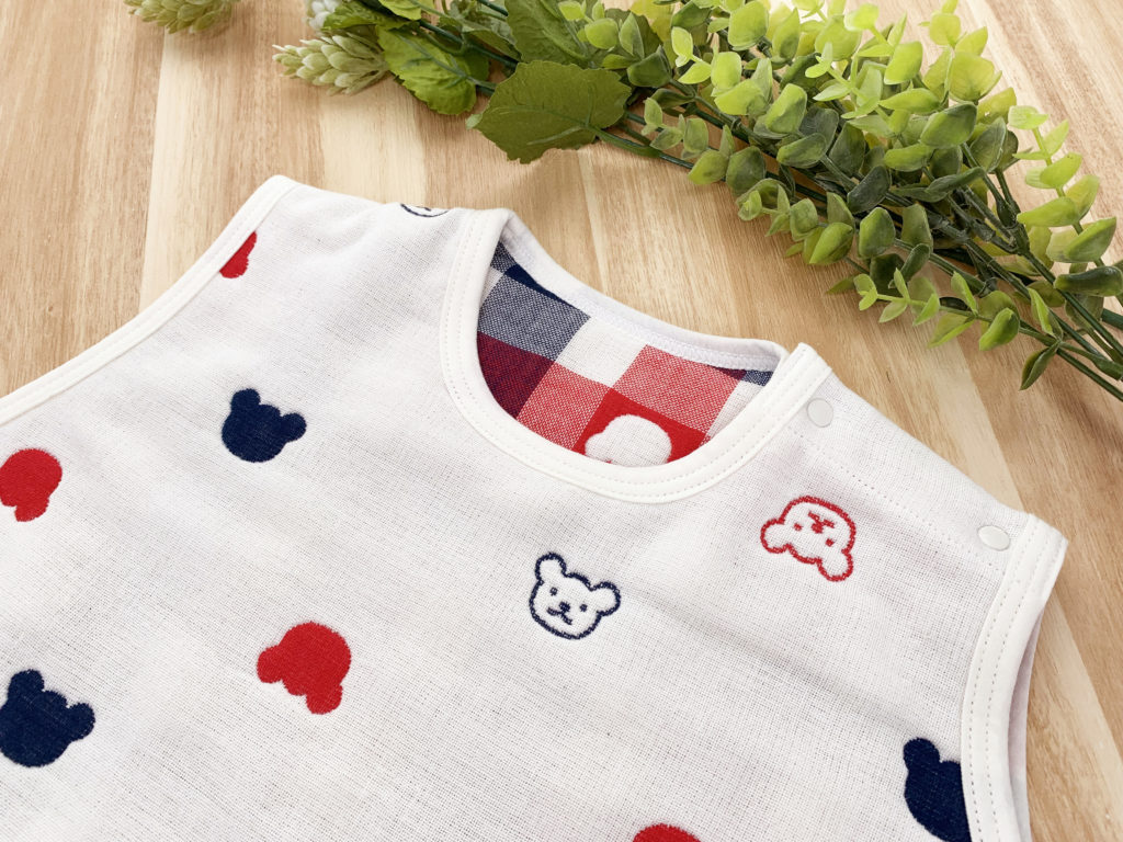 トリコロールカラーのくま柄は男の子にも女の子にも人気のデザインです。 六重に重ねたガーゼが空気をたくさん含み、冬はふんわり暖かく、夏のクーラー対策にもおすすめです。 通気性・速乾性が高く、洗濯を重ねるたびにやわらかく優しい肌触りで一年中お使いいただけます。 おなかが出ないので、寝冷え対策に最適。 両脇と肩が開くので、寝かせたままの着せ替えもスムーズにできます。